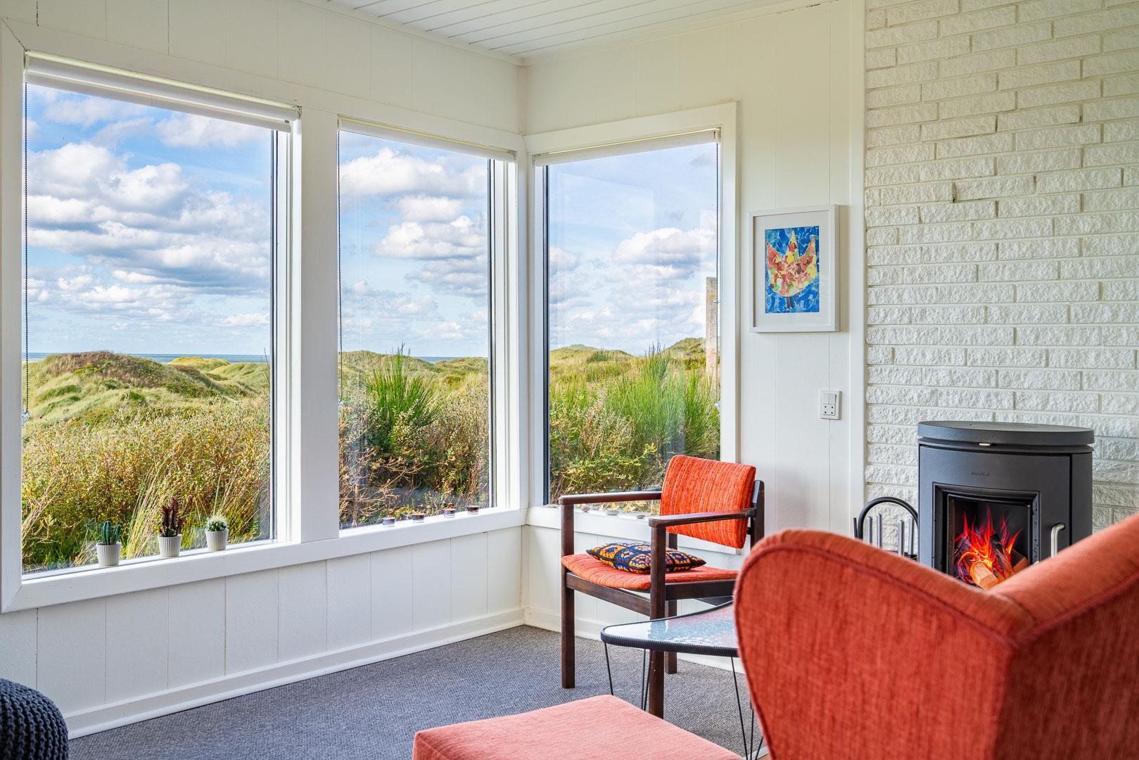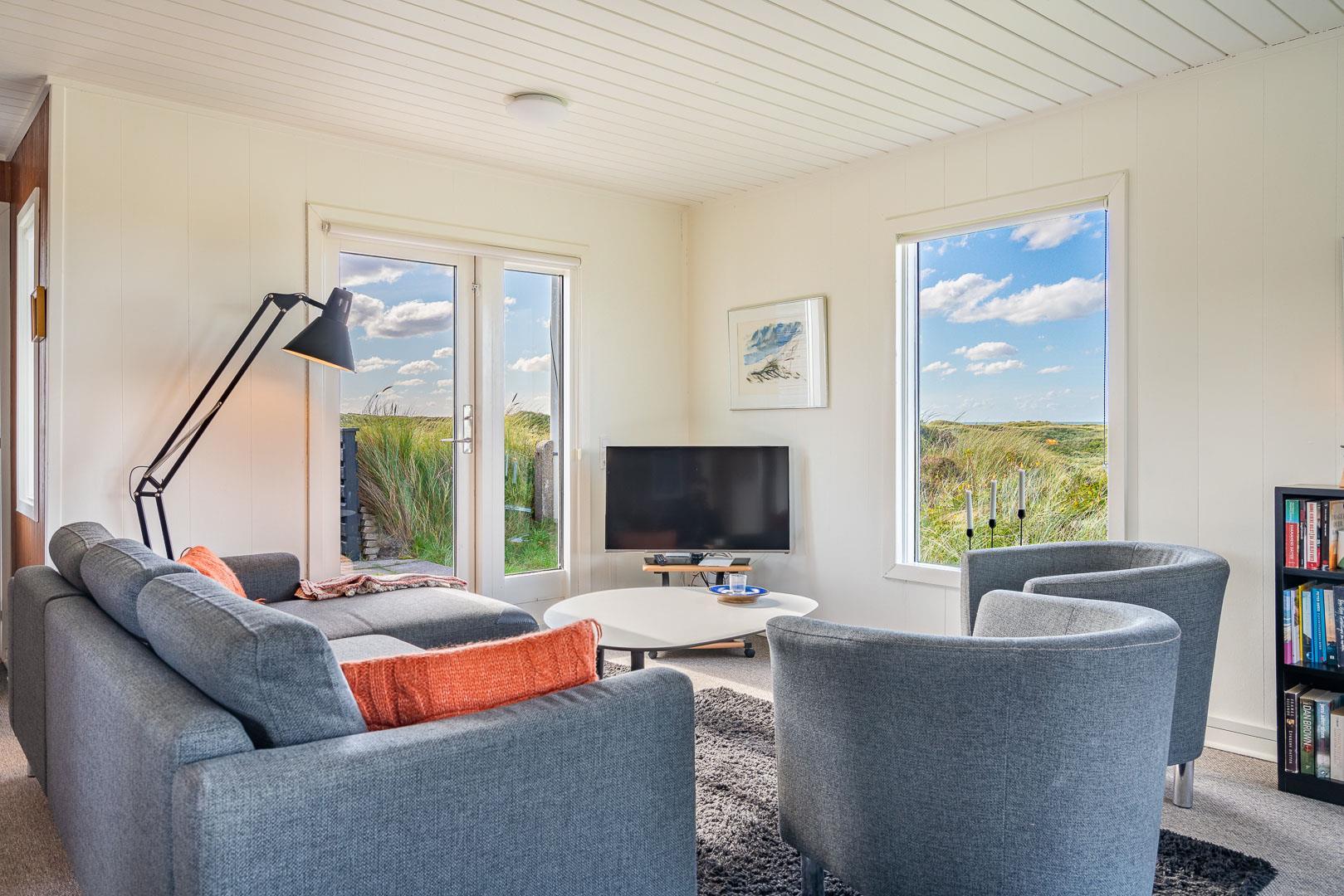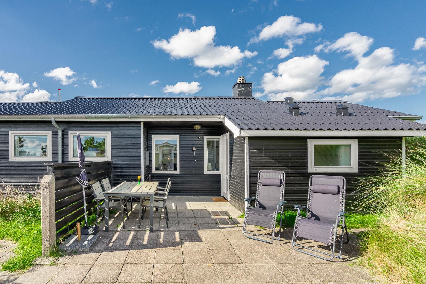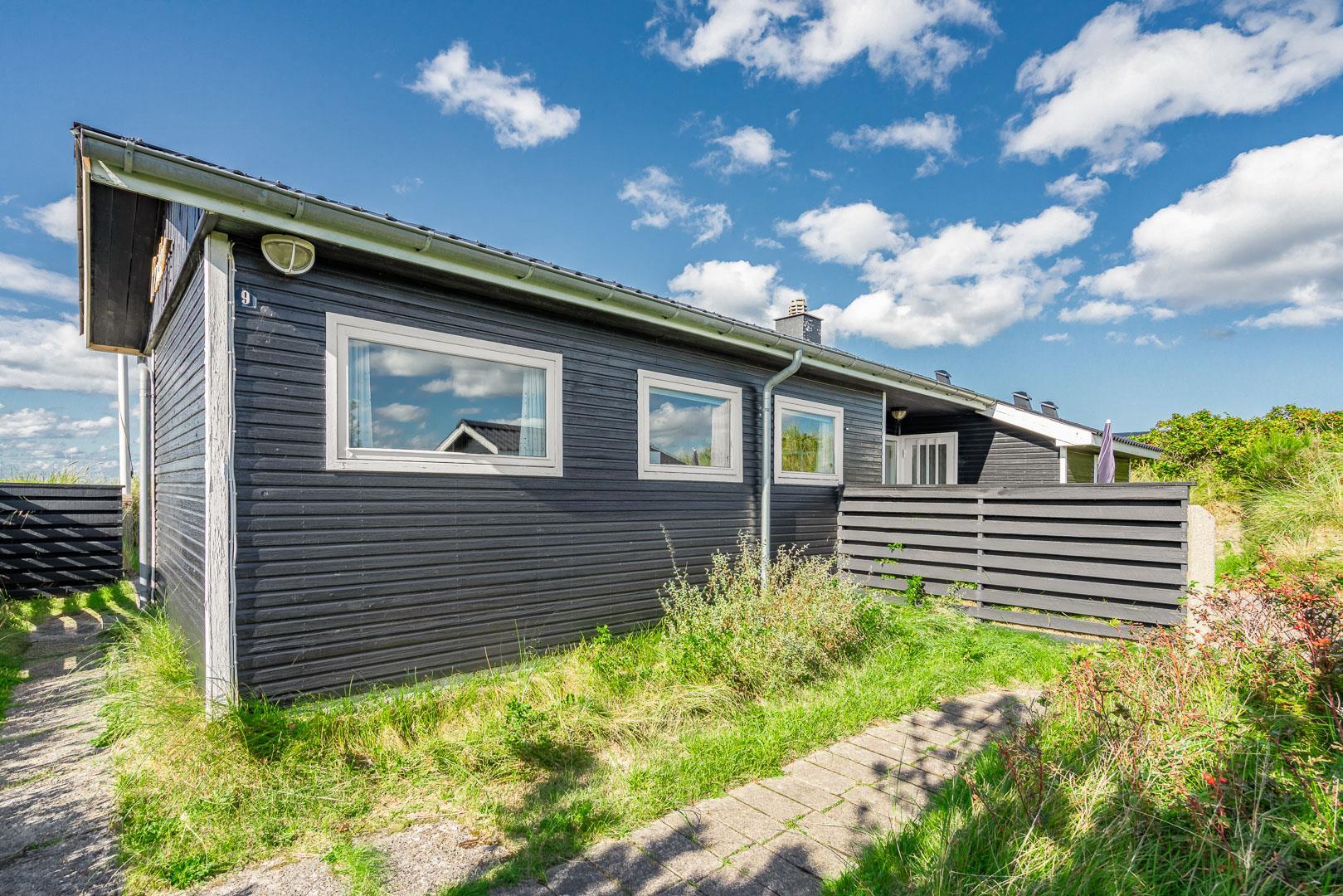 Charmantes Ferienhaus mit Meerblick gelegen auf einem prachtvollen und hochgelegenen Dünengrundstück in erster Dünenreihe in Henne Strand. Das Haus ist 2015 komplett modernisiert, so dass das ganze Haus hell und freundlich ist. Gemütliche Stube, die eingerichtet ist in gutem Stil und mit guten Möbeln. Die Stube hat große Fenster, so dass man das Meer und die fantastische Aussicht über die Dünen voll genießen kann. Ein Schlafzimmer mit guten Einzelbetten und Schränken. Gut ausgestattete Küche mit Spülmaschine und Mikrowelle. Es gibt auch vom Küchenfenster eine tolle Aussicht über die Dünenlandschaft. Badezimmer mit Dusche, extra Toilette. Es gibt mehrere tolle und ganz ungestörte Terrassen um das Haus herum. Ein fantastisches und super gemütliches Ferienhaus für 2 Personen. Depotraum auf der Terrasse ist privat.