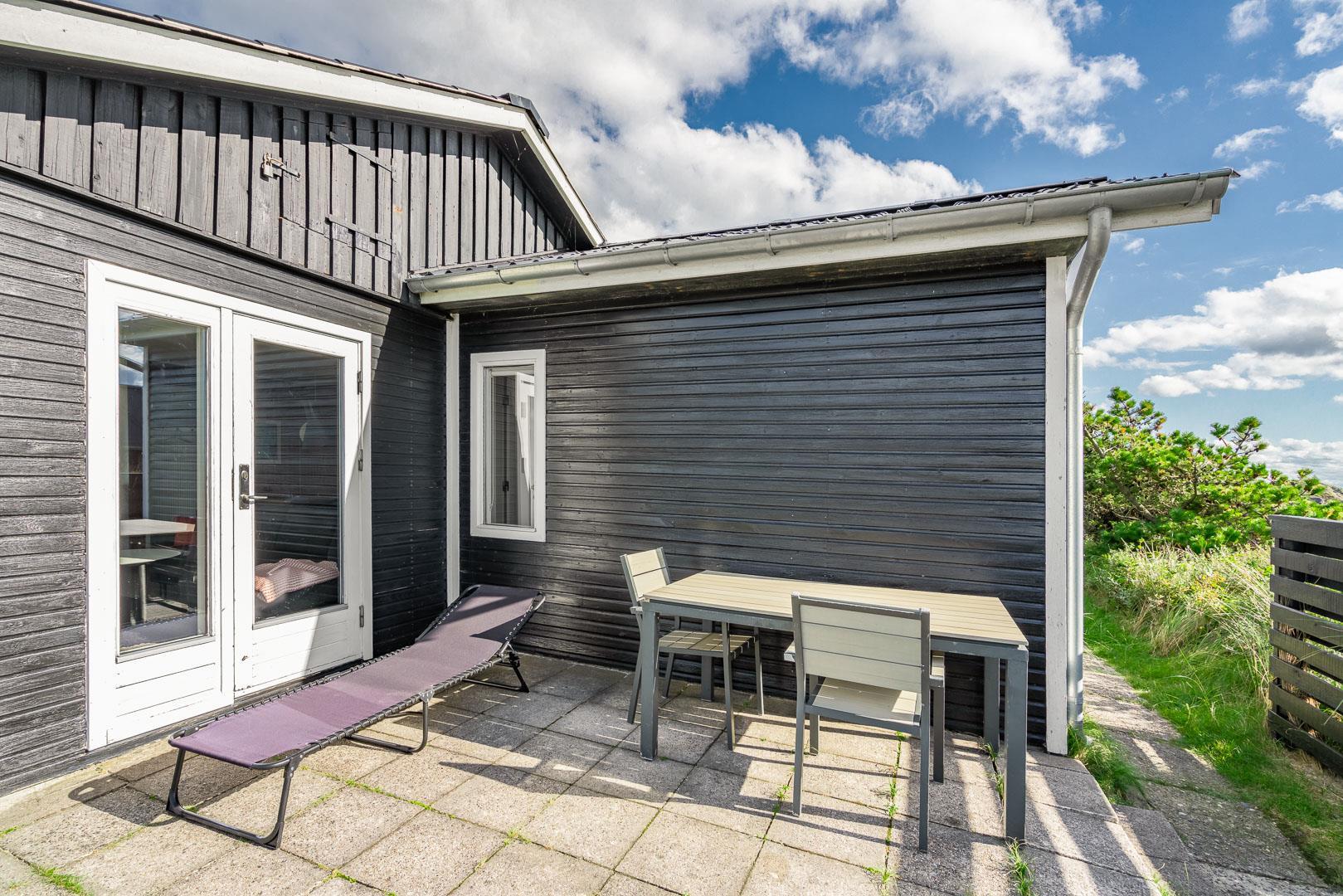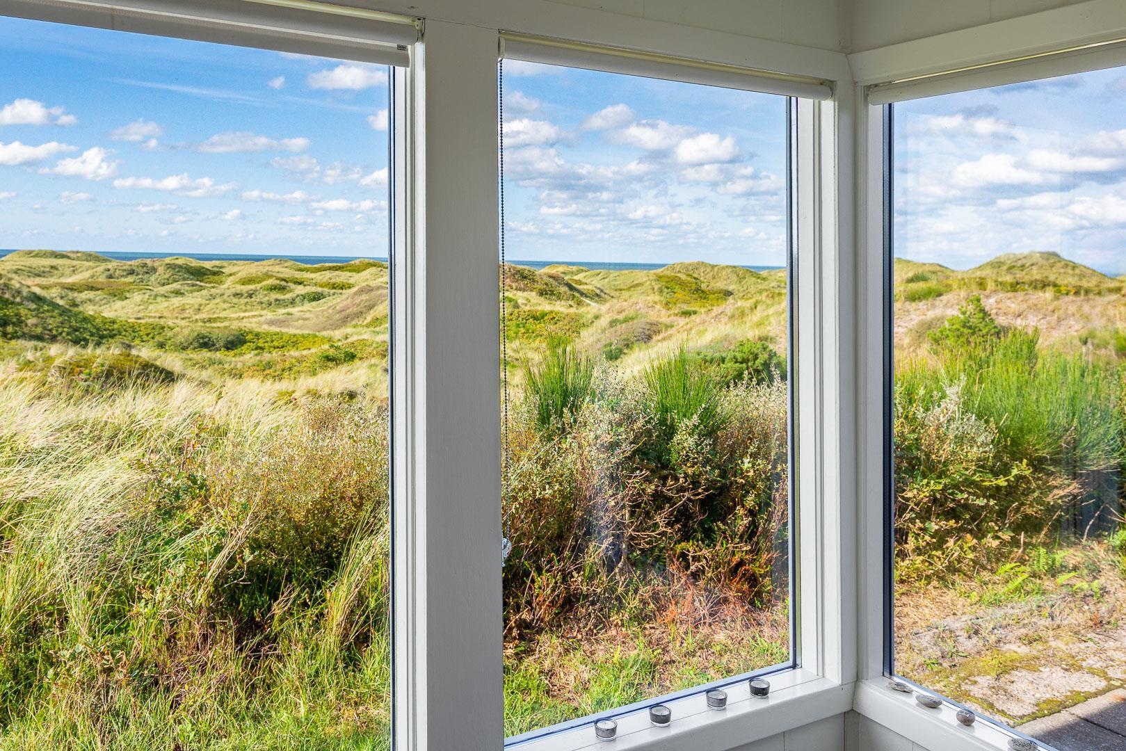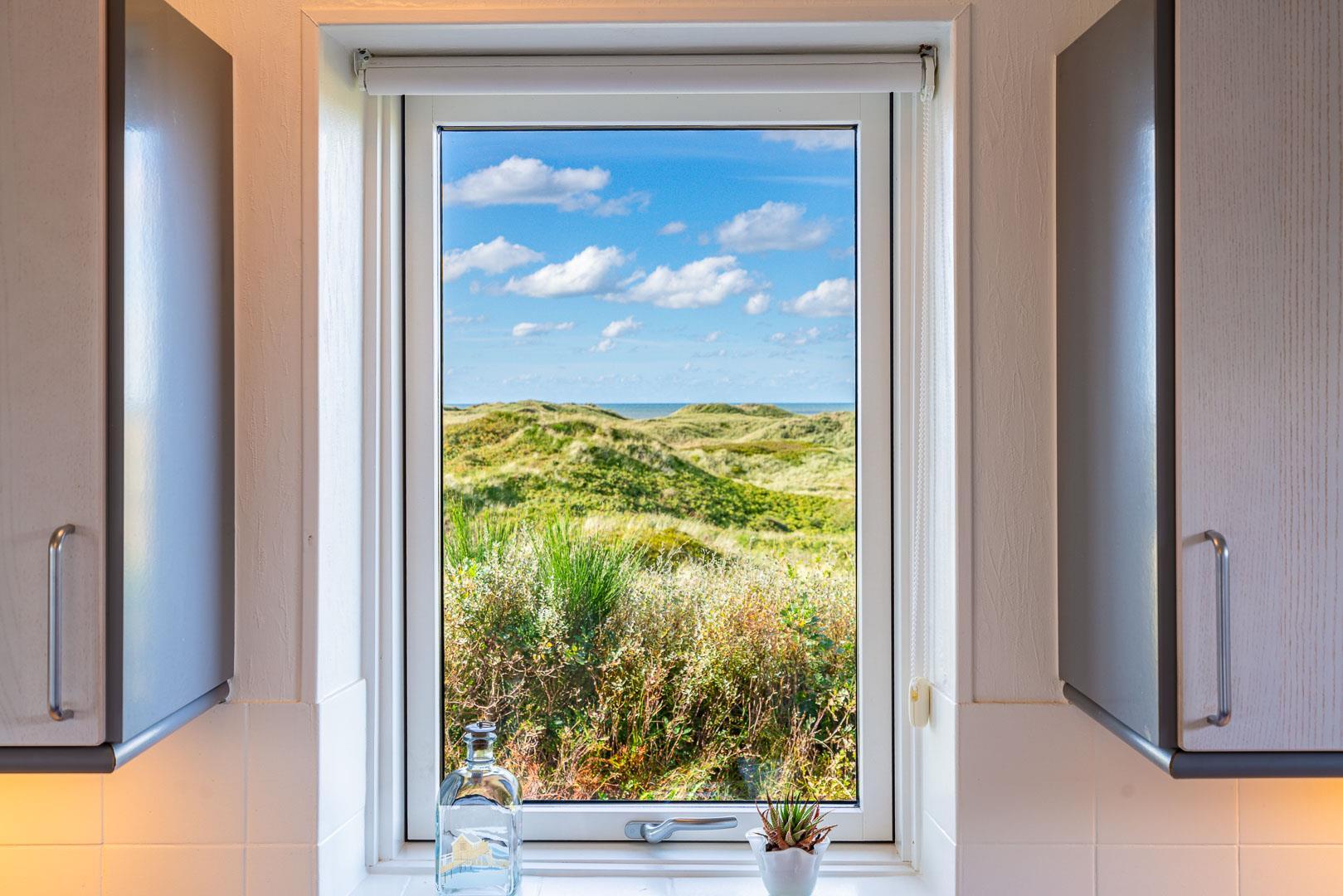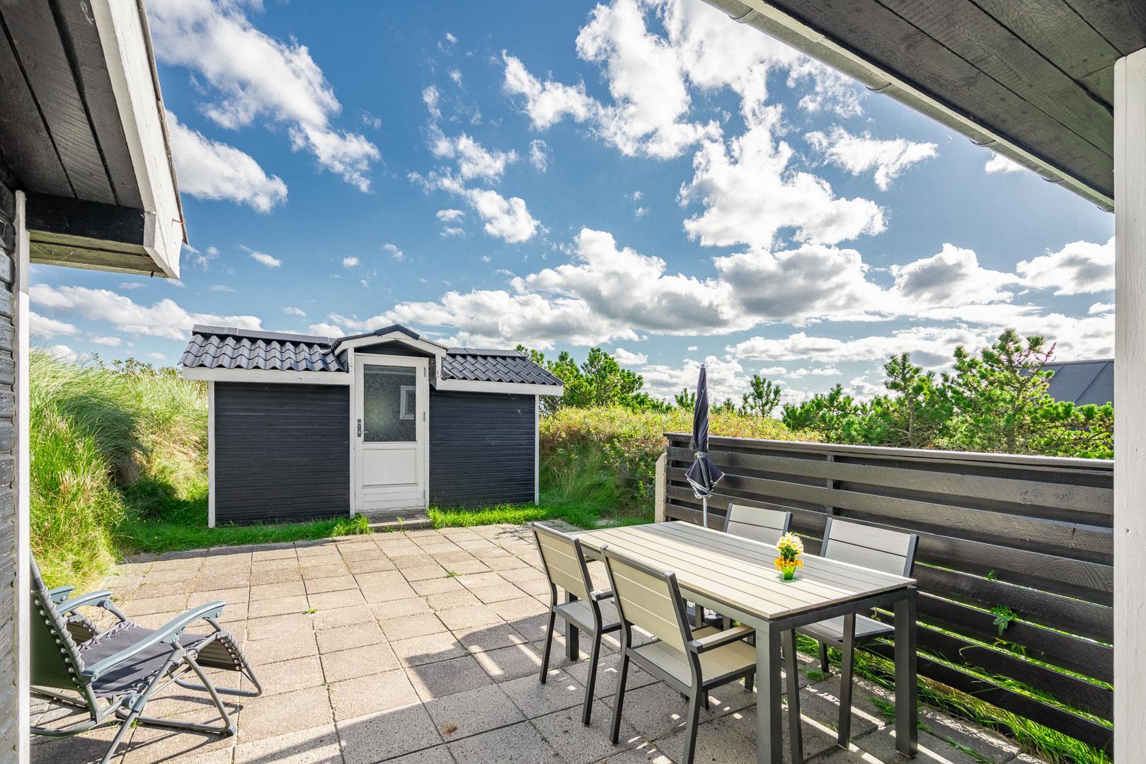 Charmantes Ferienhaus mit Meerblick gelegen auf einem prachtvollen und hochgelegenen Dünengrundstück in erster Dünenreihe in Henne Strand. Das Haus ist 2015 komplett modernisiert, so dass das ganze Haus hell und freundlich ist. Gemütliche Stube, die eingerichtet ist in gutem Stil und mit guten Möbeln. Die Stube hat große Fenster, so dass man das Meer und die fantastische Aussicht über die Dünen voll genießen kann. Ein Schlafzimmer mit guten Einzelbetten und Schränken. Gut ausgestattete Küche mit Spülmaschine und Mikrowelle. Es gibt auch vom Küchenfenster eine tolle Aussicht über die Dünenlandschaft. Badezimmer mit Dusche, extra Toilette. Es gibt mehrere tolle und ganz ungestörte Terrassen um das Haus herum. Ein fantastisches und super gemütliches Ferienhaus für 2 Personen. Depotraum auf der Terrasse ist privat.