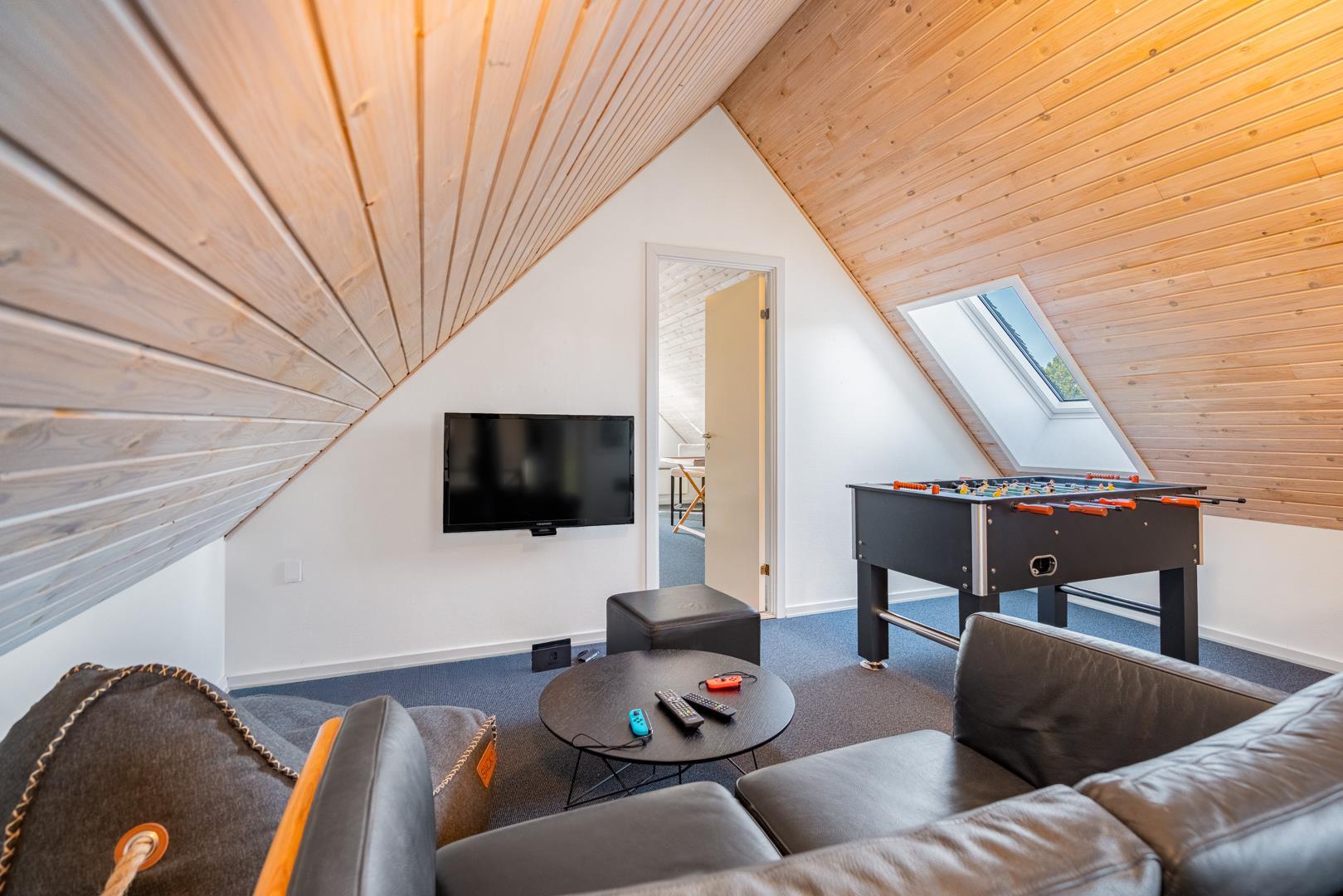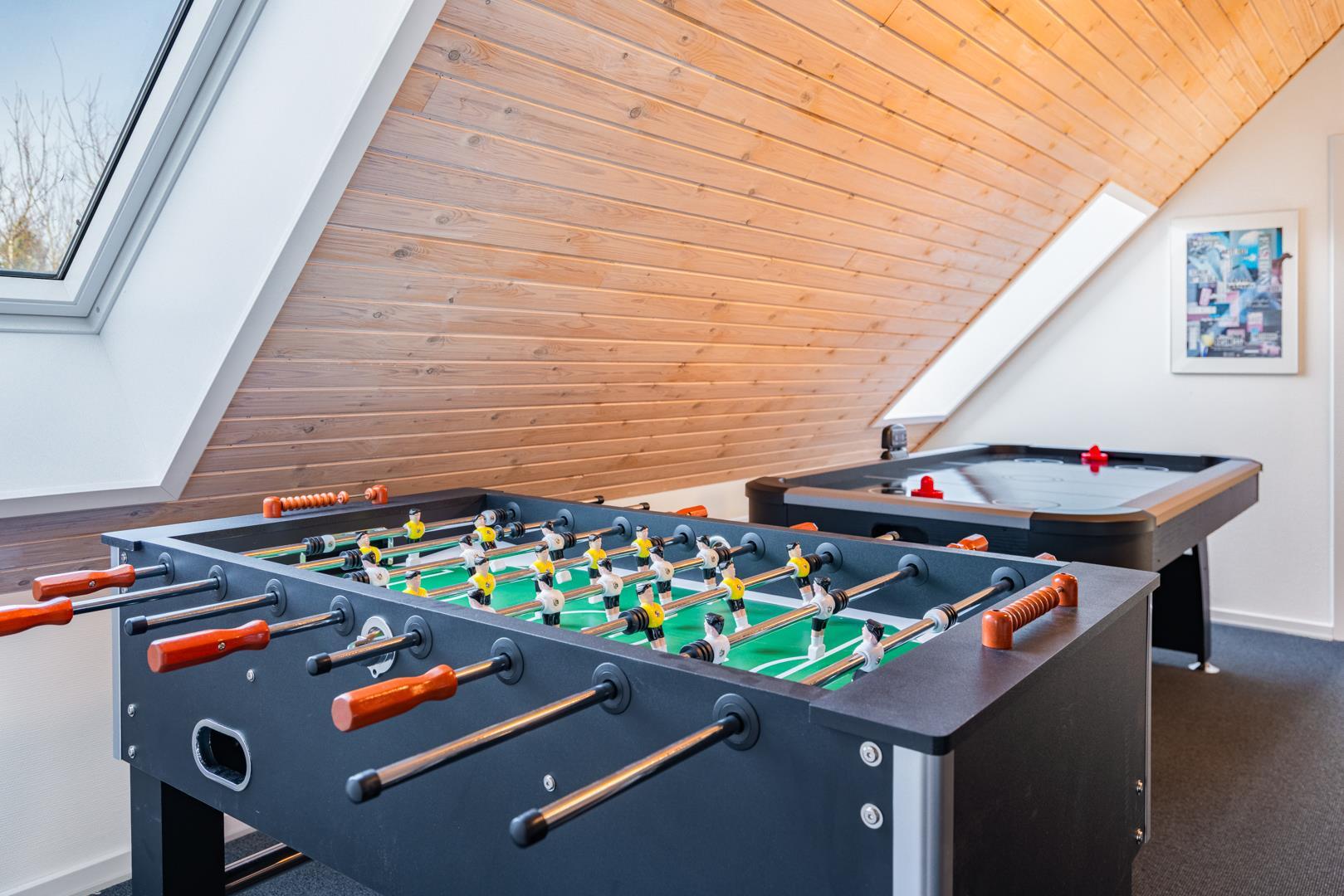 Für Unterhaltung bei jedem Wetter sorgt der Aktivitätsbereich mit Airhockey, Tischfußball und Spielkonsole – perfekt für spannenden Duelle oder entspannte Spieleabende.