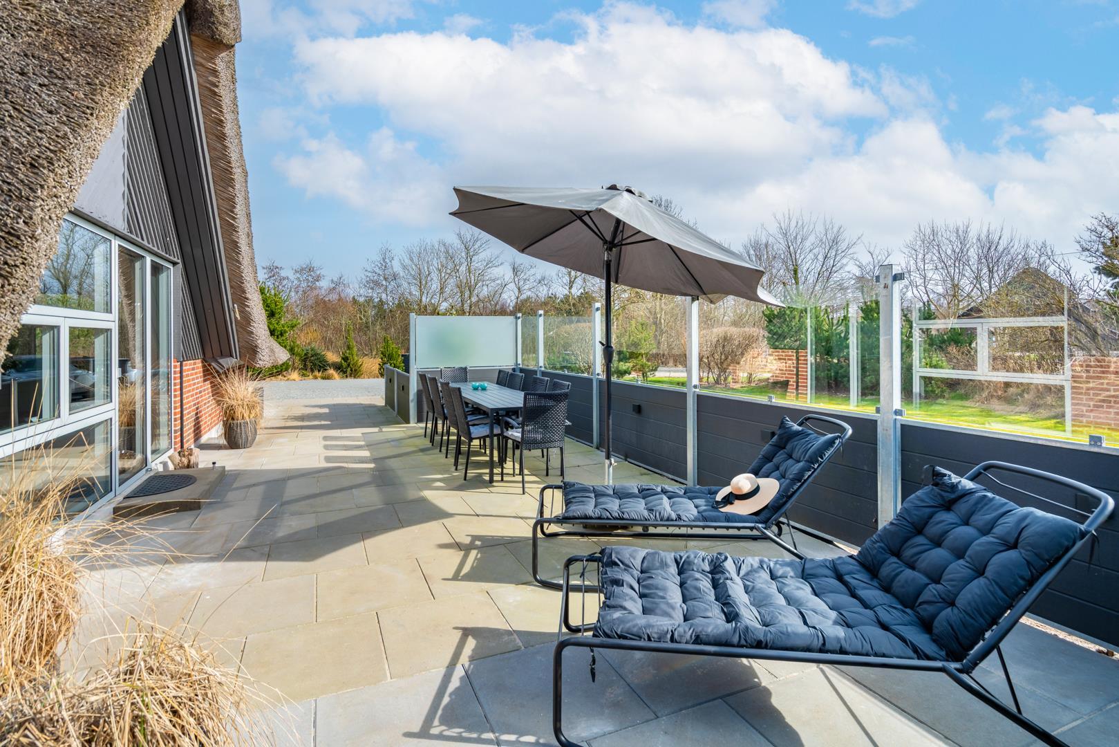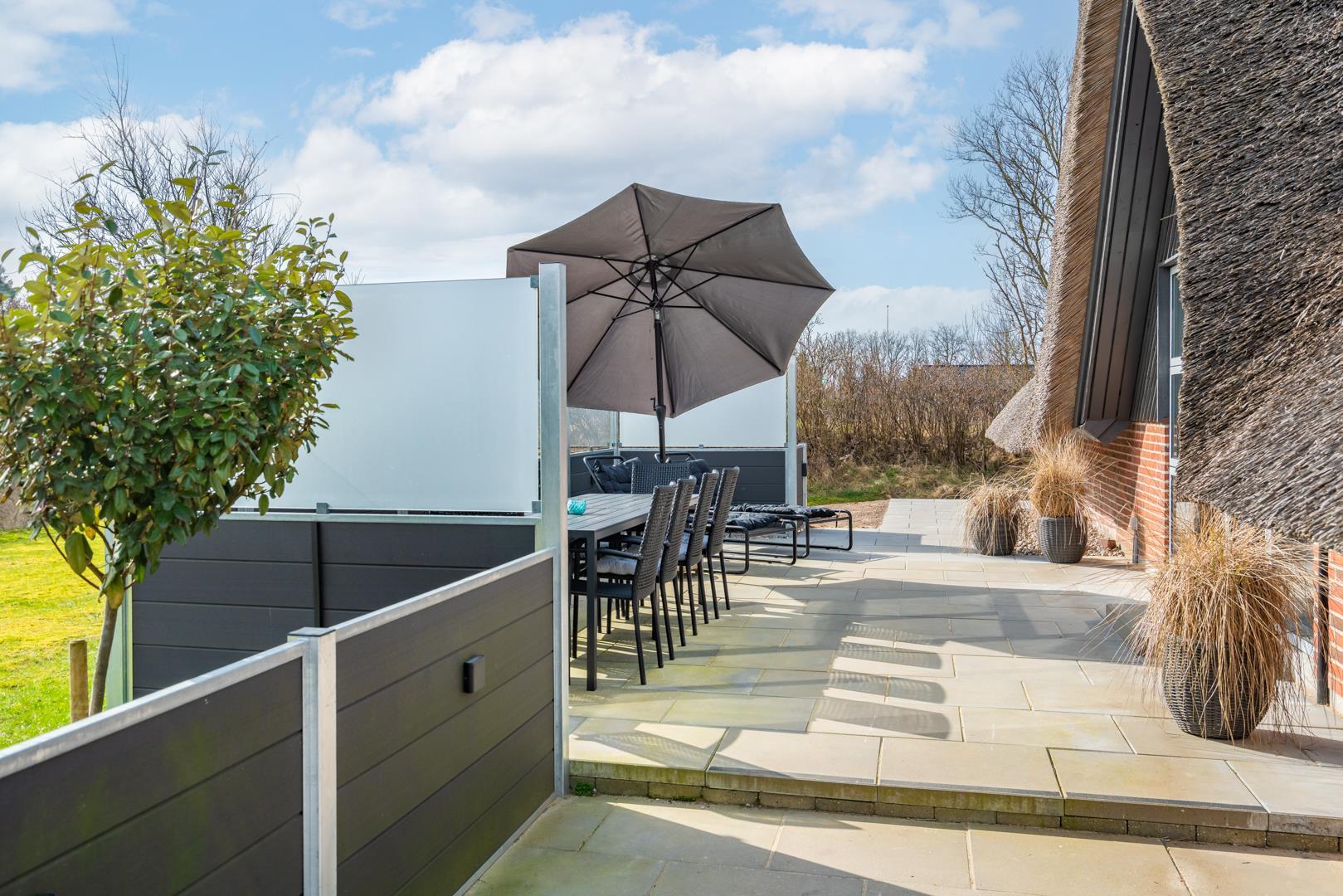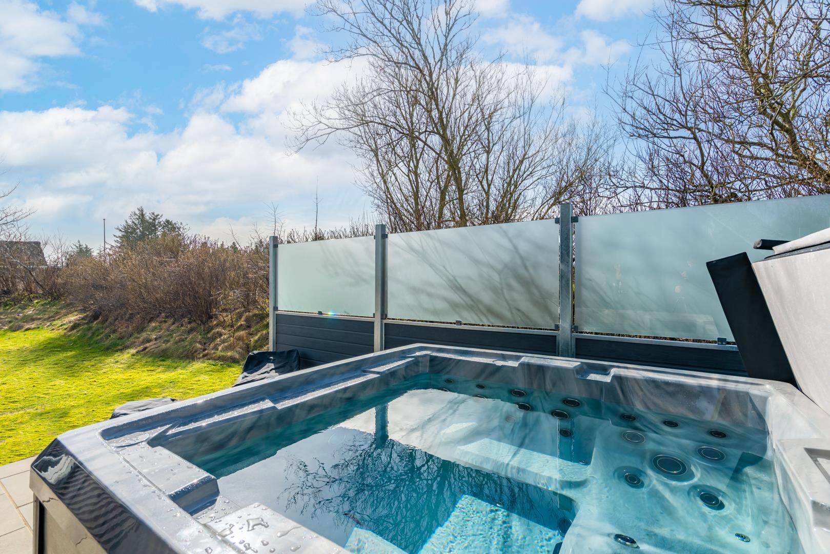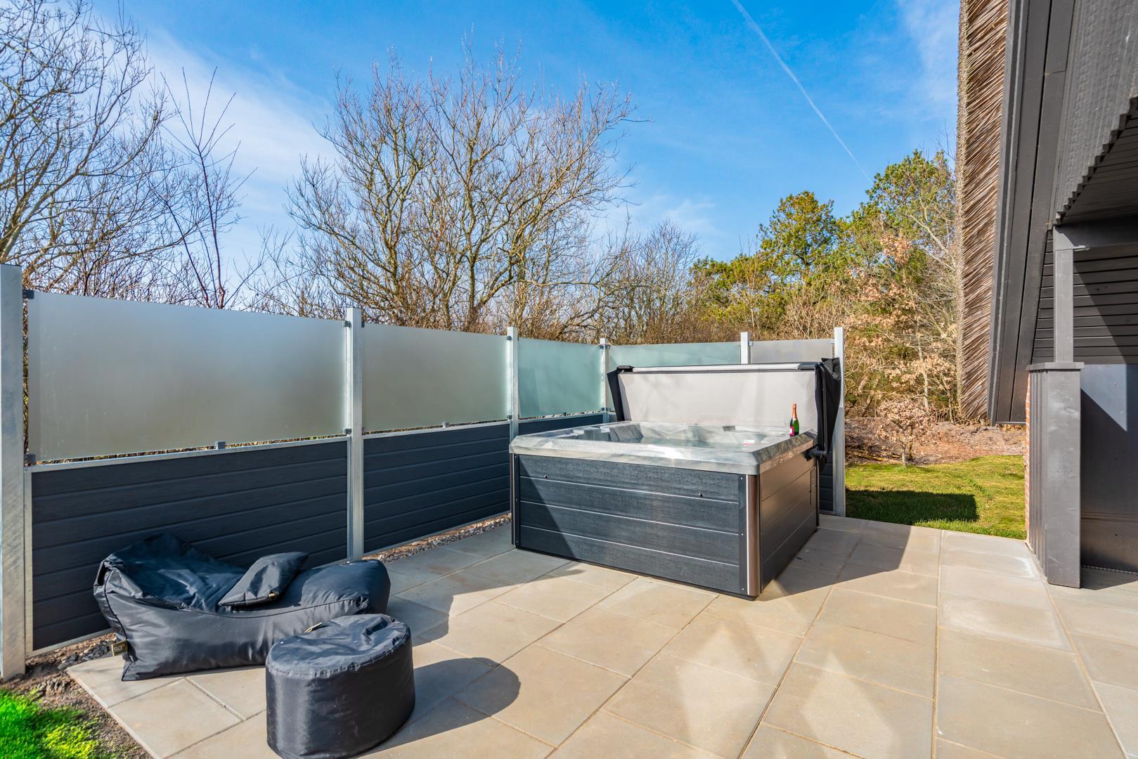 Auf der schönen Terrasse wartet ein echtes Highlight: der Außen-Whirlpool, der zu entspannten Abenden unter freiem Himmel einlädt. Direkt daneben befindet sich eine Außendusche, perfekt nach einem Saunagang oder einem Tag am Strand.
