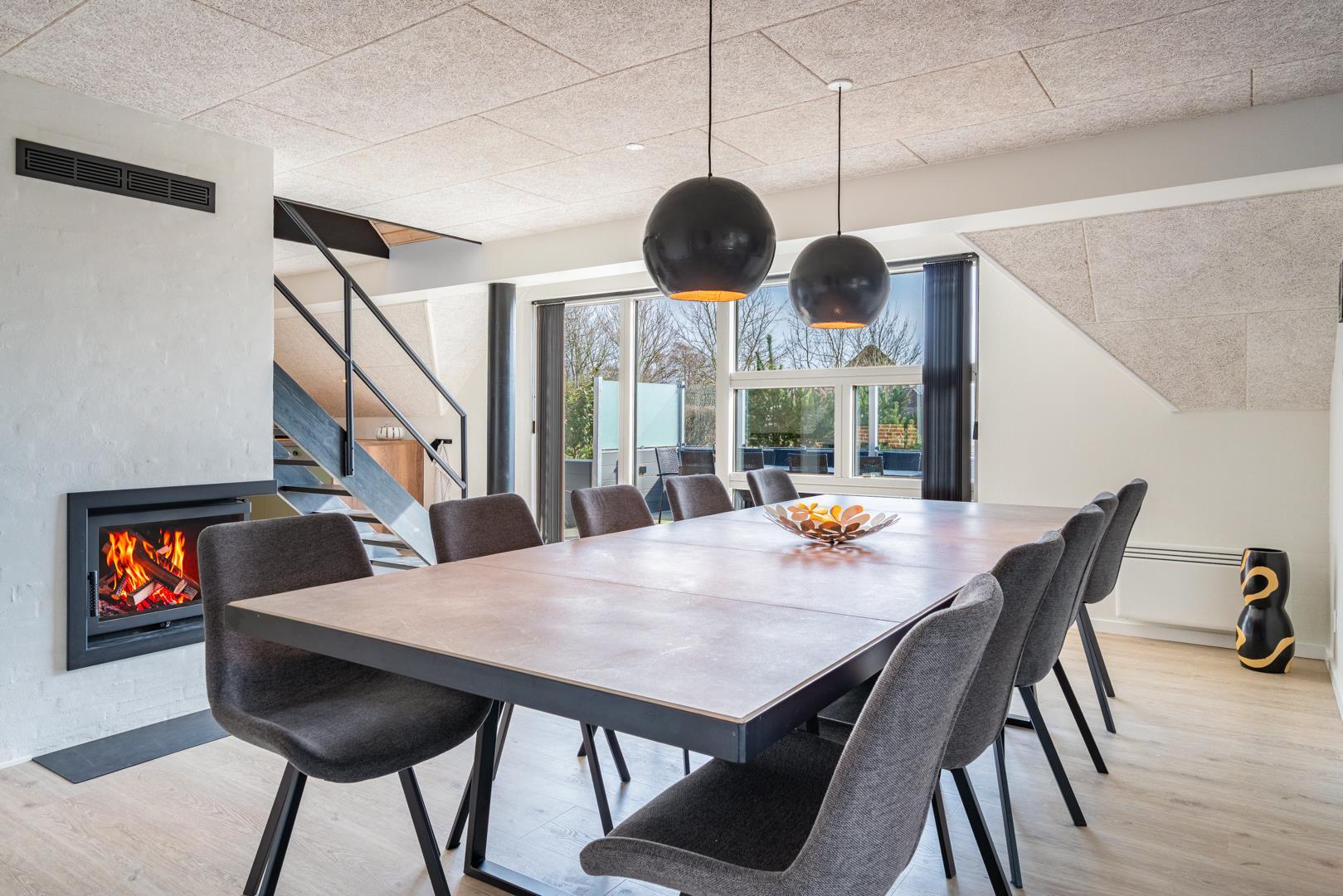 Im gemütlichen Wohnzimmer sorgt ein Kamin für echte Ferienhausstimmung, während eine energiesparende Wärmepumpe ganzjährig für angenehme Temperaturen sorgt. Vom Wohnbereich aus hast du direkten Zugang zur Terrasse, sodass drinnen und draußen nahtlos ineinander über gehen.