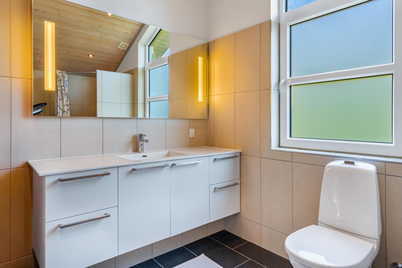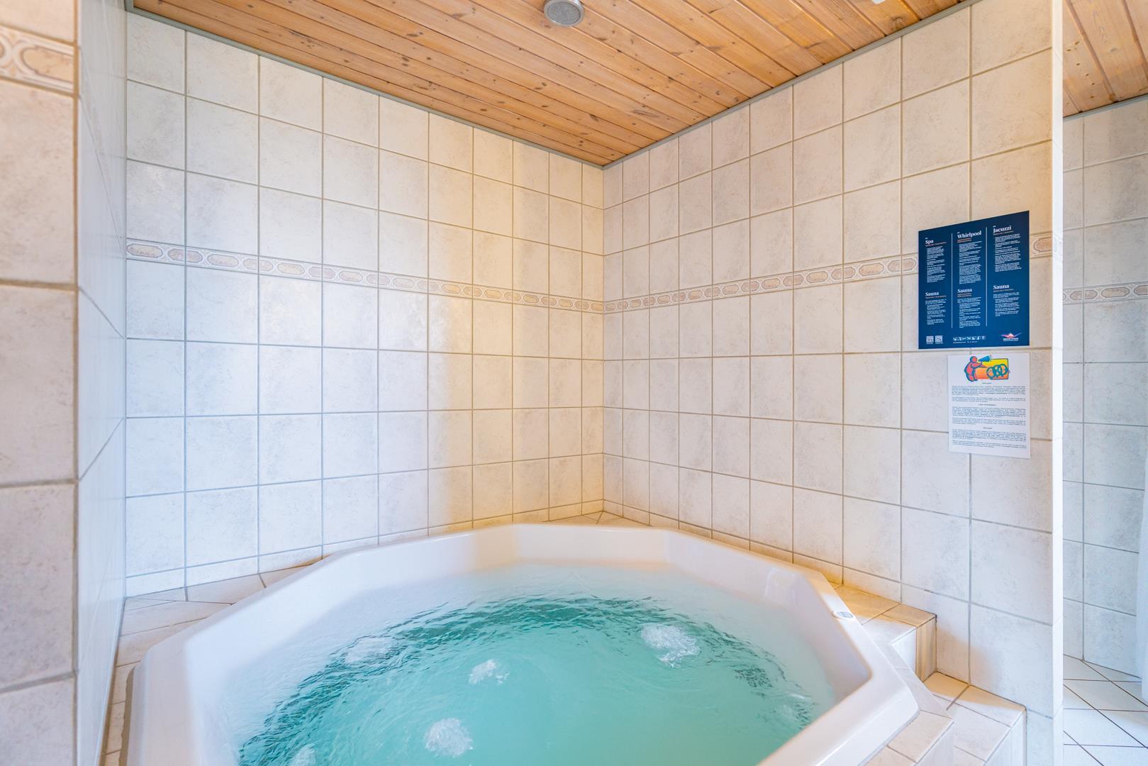 Das Badezimmer verwöhnt mit einem Whirlpool und einer Sauna für vier Personen, ergänzt durch eine zusätzliche Toilette.