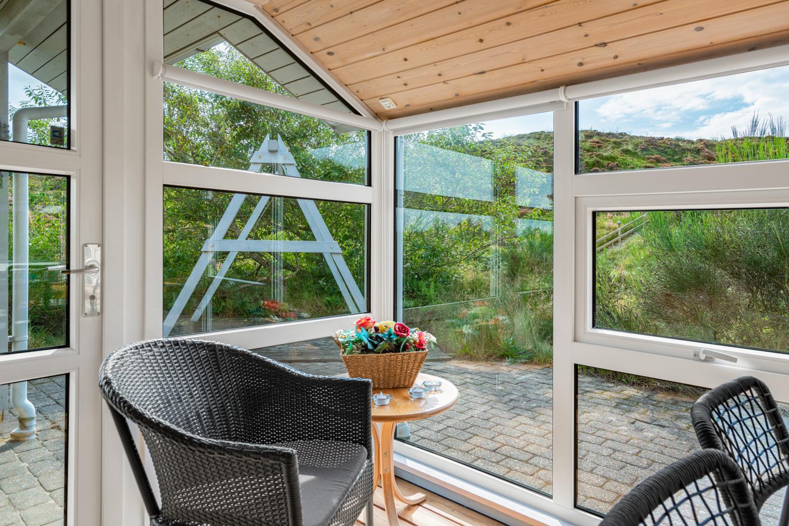 Eine große, geflieste Terrasse bietet die Möglichkeit, in die wunderschöne Natur direkt vor dem Ferienhaus einzutauchen. Im Inneren finden Sie den Eingangsbereich mit praktischem Platz für Oberbekleidung und Schuhe, das Wohnzimmer empfängt Sie mit einem gemütlichen Holzofen und Zugang zu einem schönen Wintergarten – perfekt für Abende mit Spielen und leckeren Süßigkeiten, während Sie die Wärme vom Holzofen genießen.