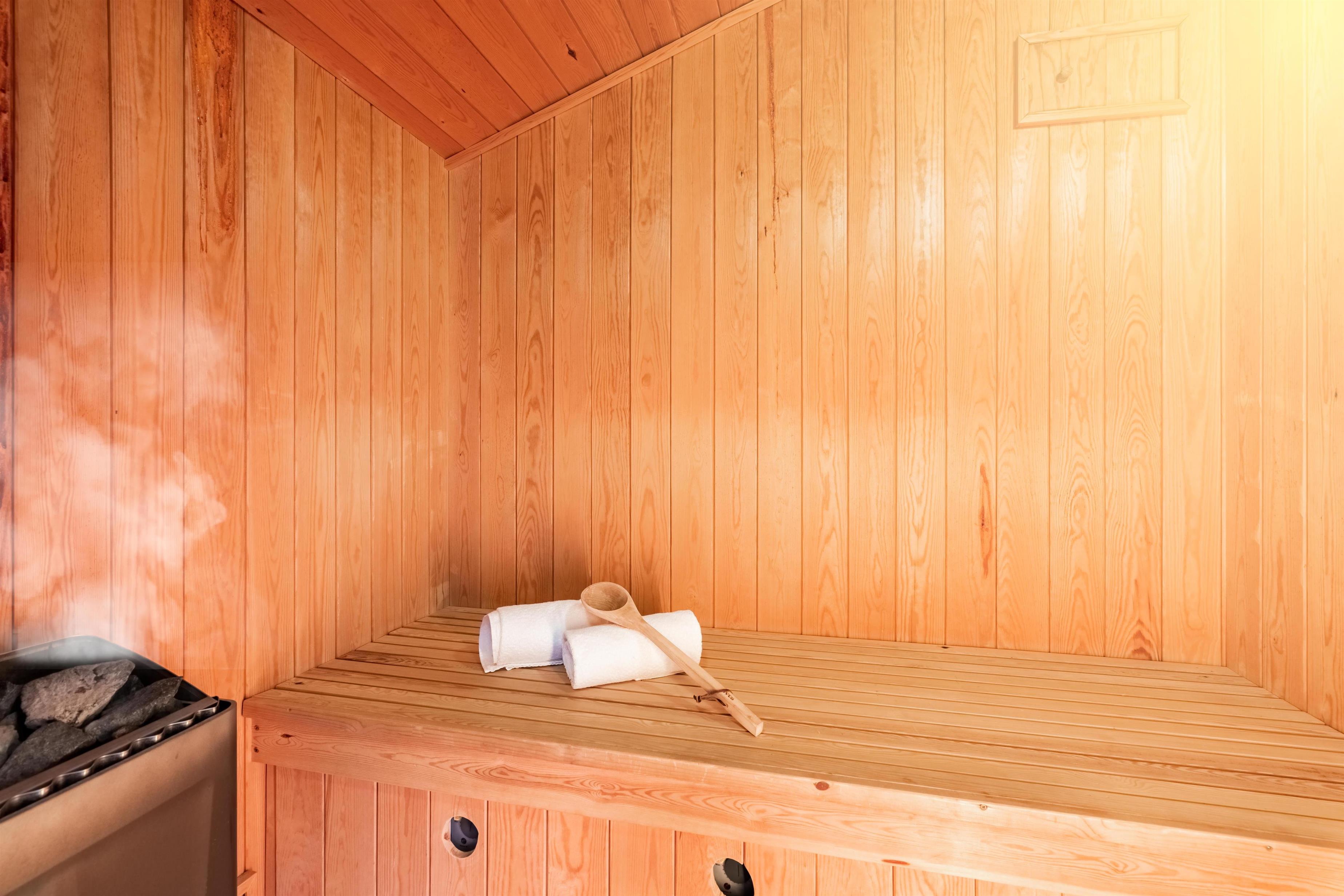 Schönes Badezimmer mit Sauna. Zögern Sie nicht, dieses stilvoll eingerichtete Ferienhaus zu buchen.