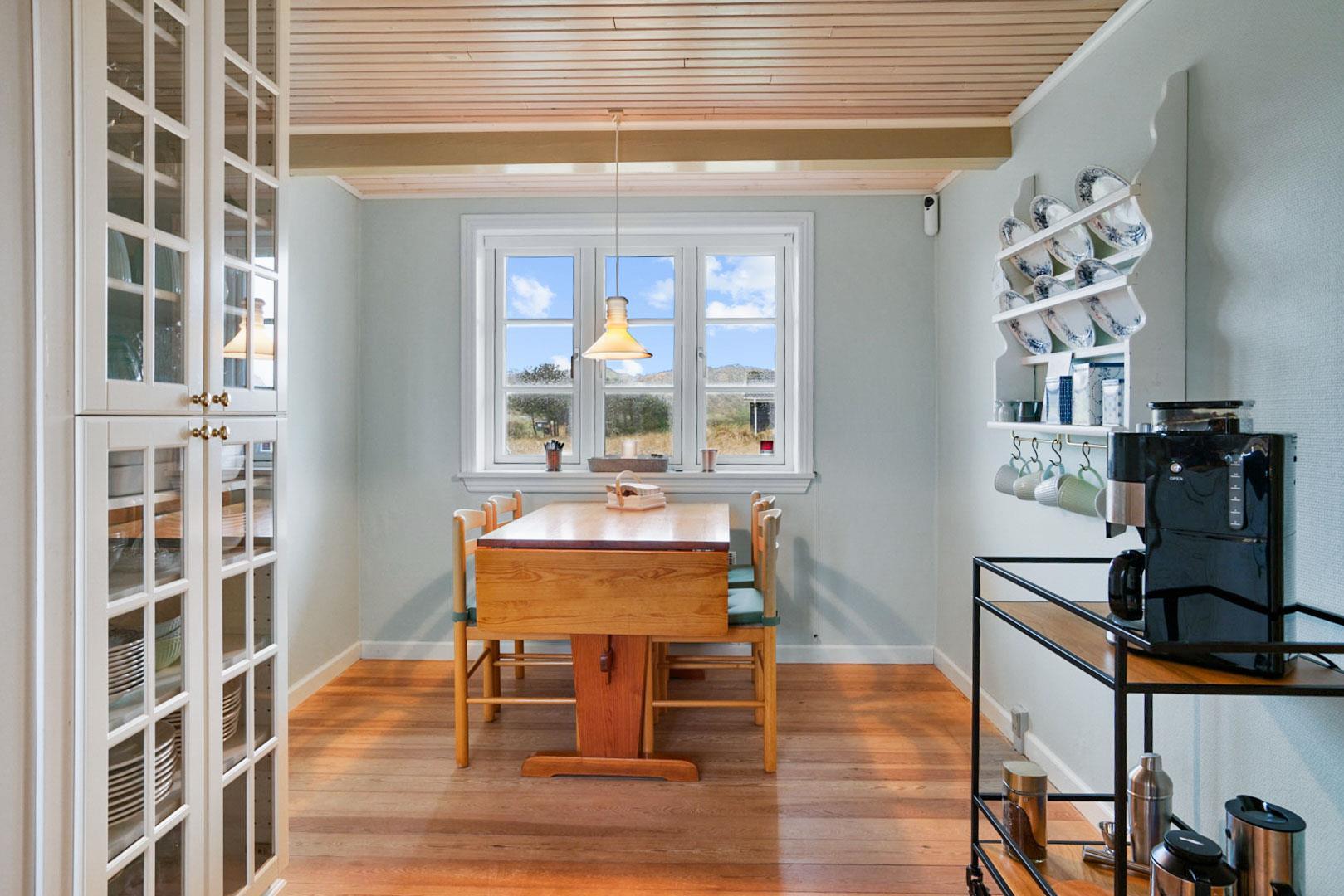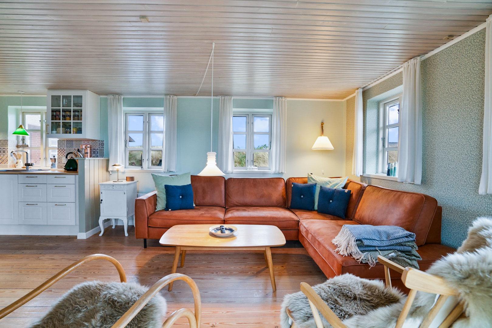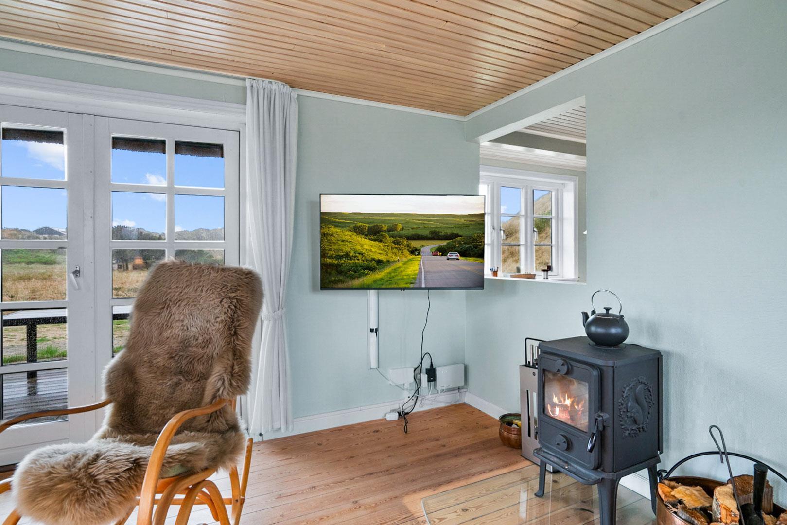 Der helle Wohn- und Essbereich überzeugt mit großen Fensterfronten und herrlichem Dünenblick. Hier kannst du es dir am Kamin gemütlich machen, während draußen der Wind durch die Heide weht. Eine Wärmepumpe sorgt ganzjährig für angenehme Temperaturen.