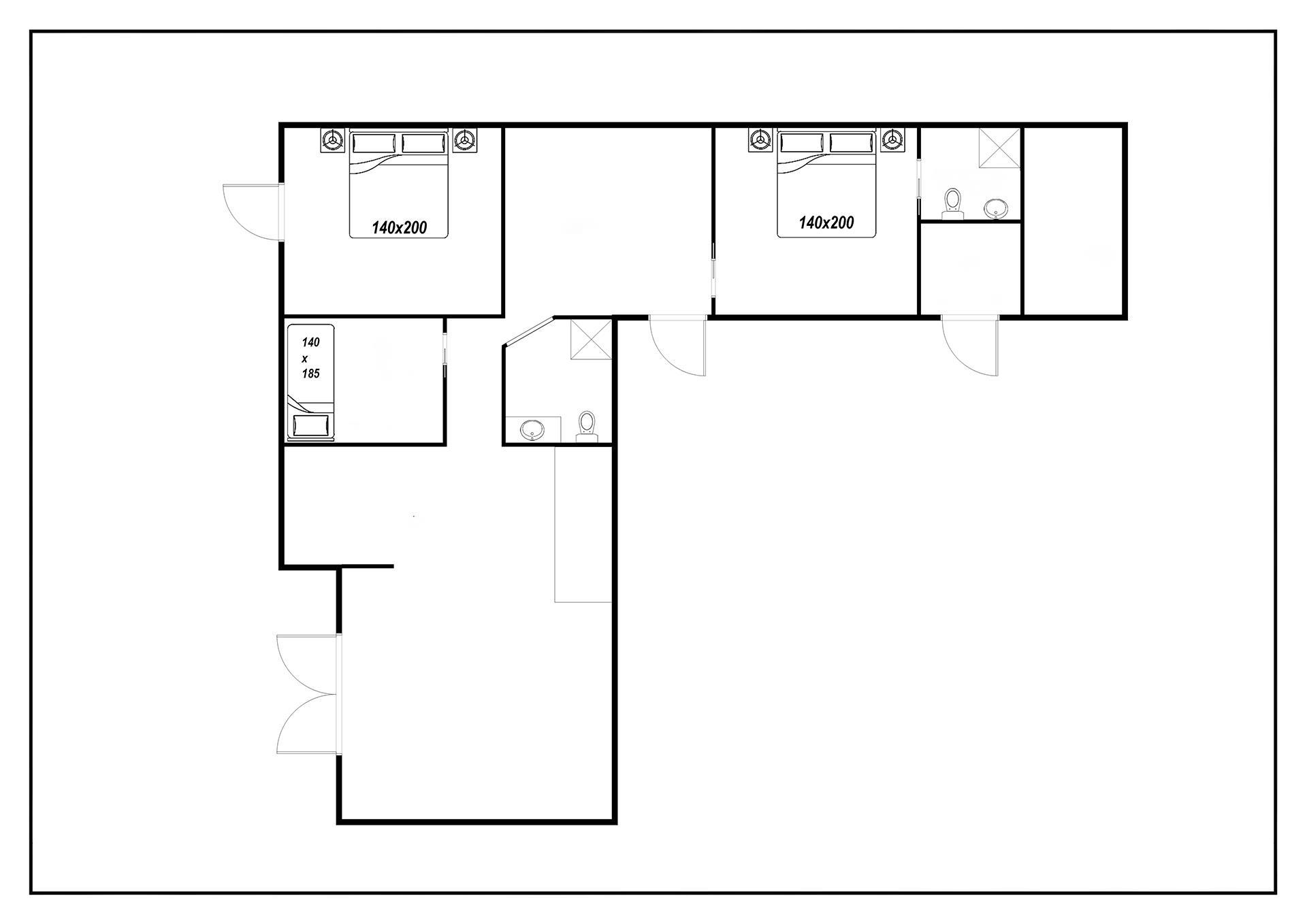 Bettengröße: 2 Doppelbetten 140 x 200 cm + 1 Doppelbett 140 x 185 cm.
