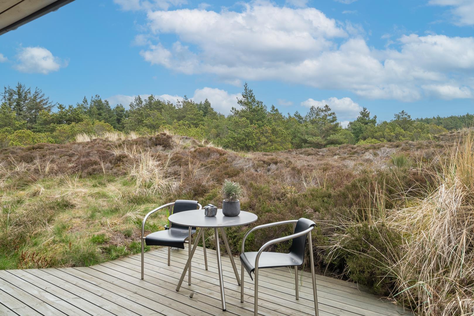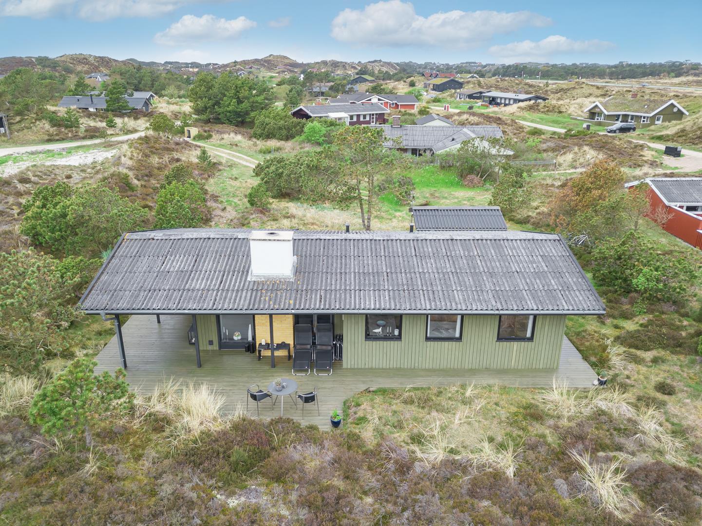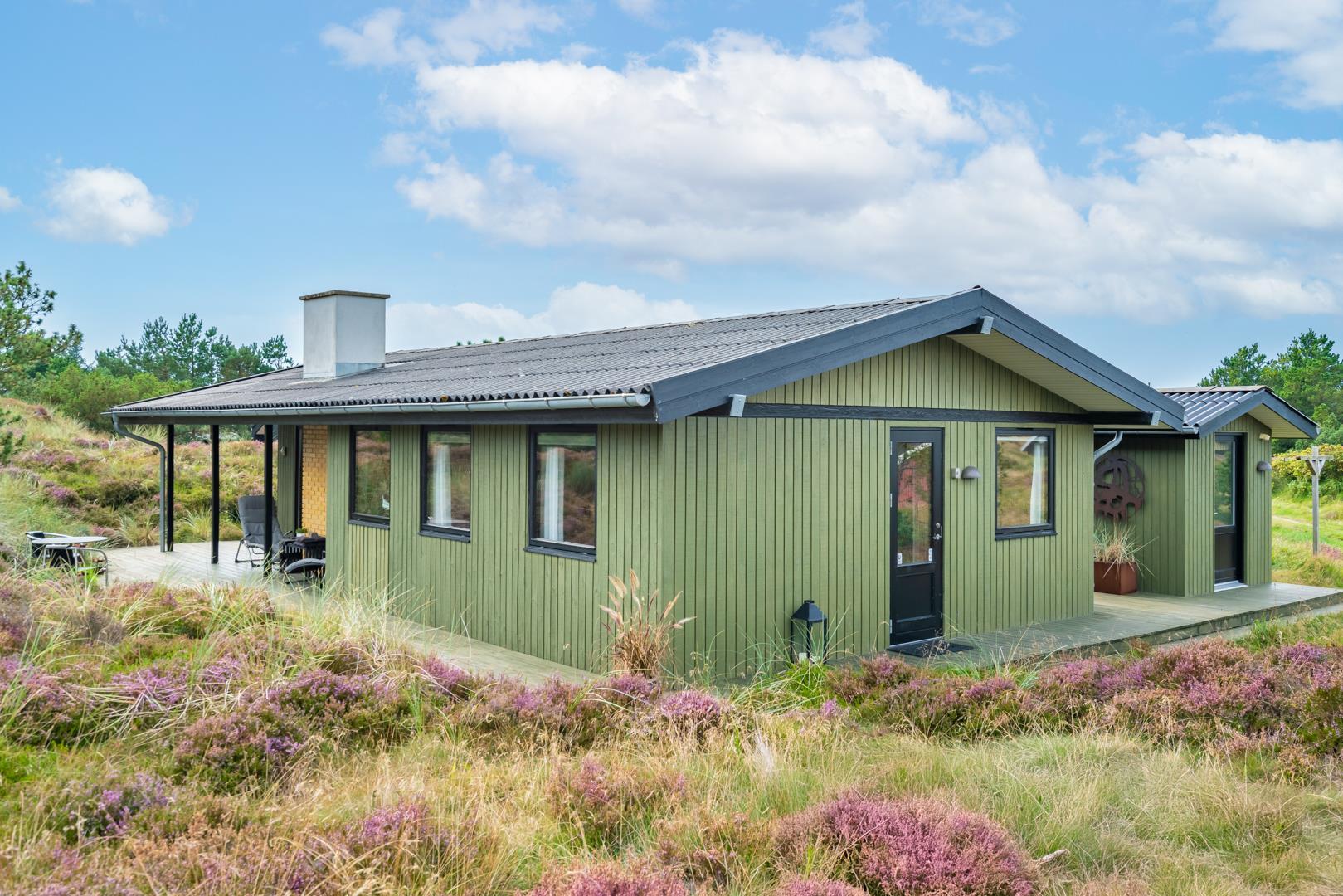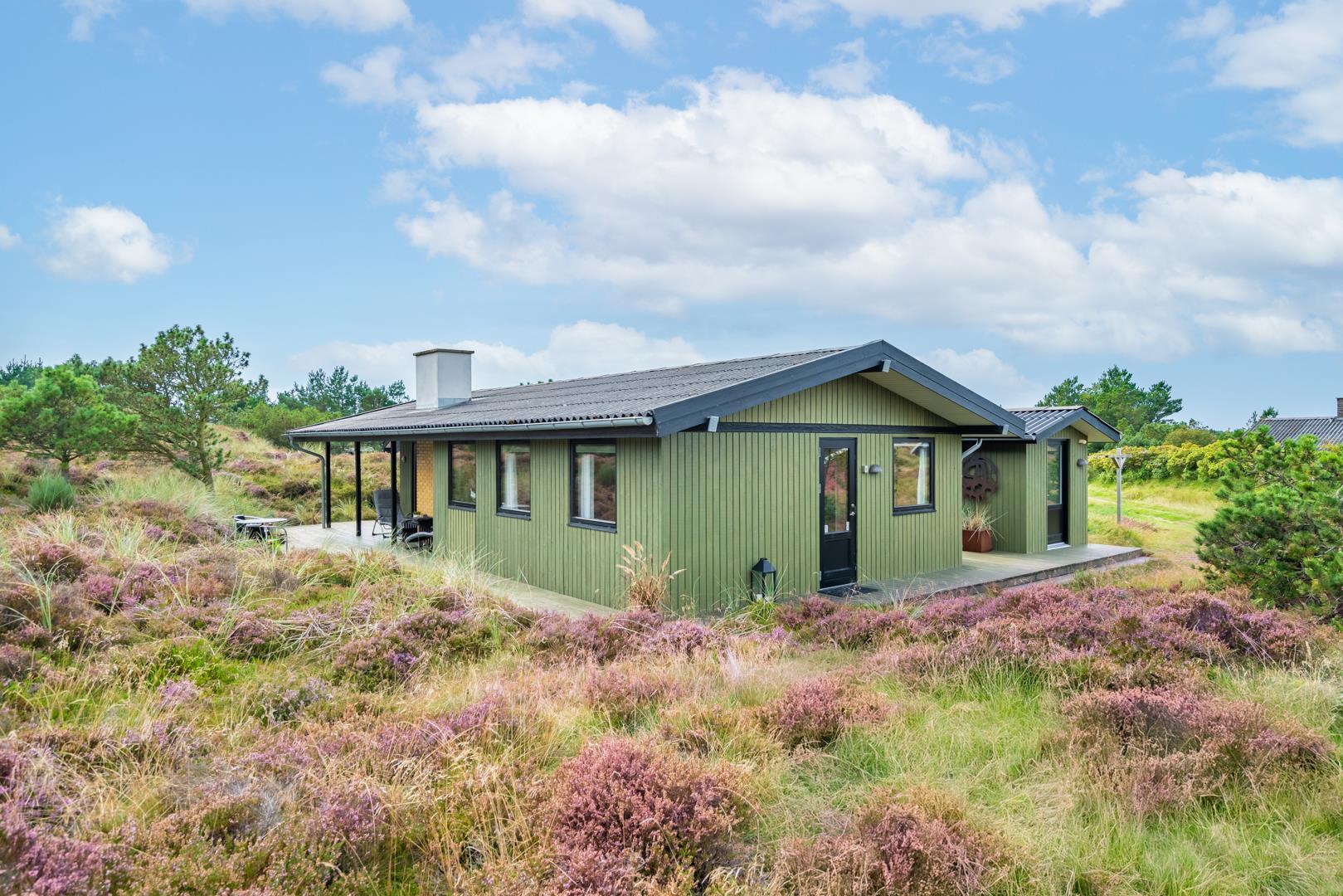 Dieses private, geschmackvoll eingerichtete Ferienhaus befindet sich auf einem ruhigen, hügeligen Naturgrundstück nahe dem Naturschutzgebiet. Das Haus liegt etwas abseits des Weges. Die ungestörte, teilweise überdachte Terrasse mit toller Aussicht über die mit Heide bewachsenen Dünen ist vom Wohnbereich aus zugänglich. Bettengrösse: Doppelbett 180x200 cm. (2 Matratzen), Einzelbetten 85x200 cm., dobbeltbett 140 x 200