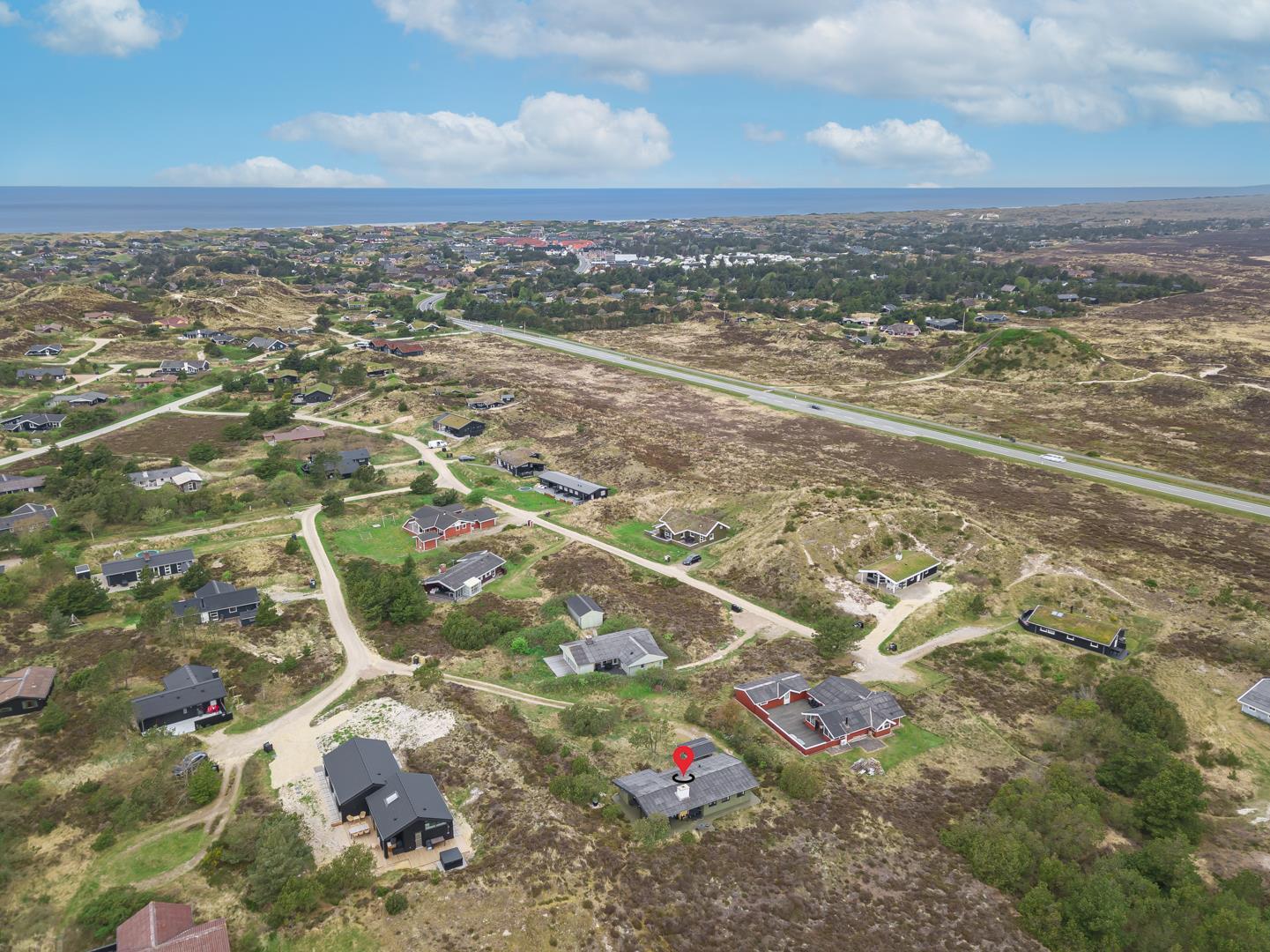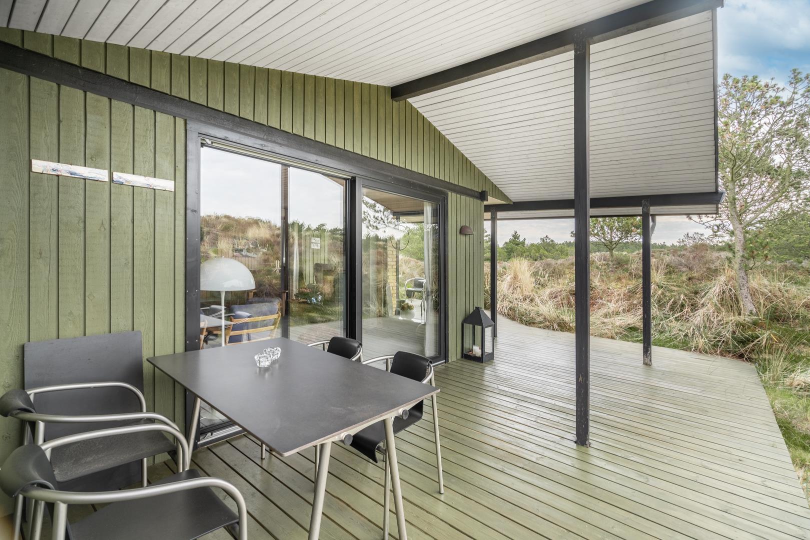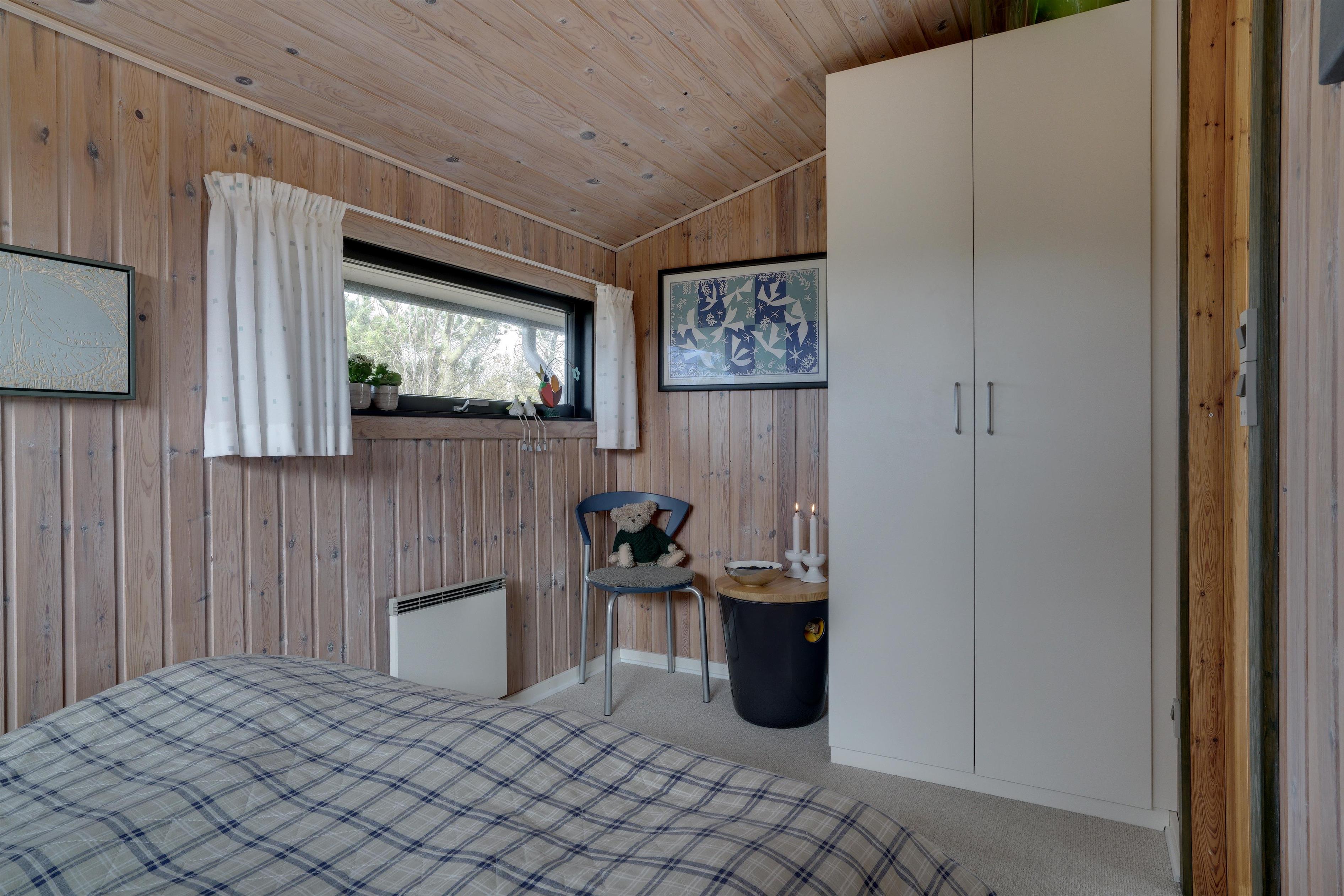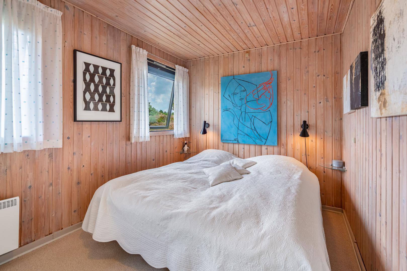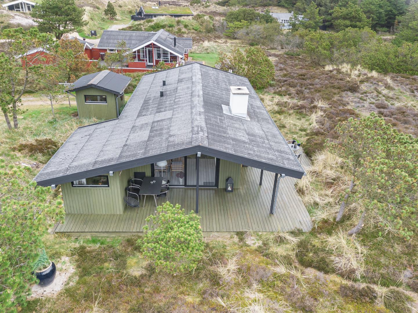 Dieses private, geschmackvoll eingerichtete Ferienhaus befindet sich auf einem ruhigen, hügeligen Naturgrundstück nahe dem Naturschutzgebiet. Das Haus liegt etwas abseits des Weges. Die ungestörte, teilweise überdachte Terrasse mit toller Aussicht über die mit Heide bewachsenen Dünen ist vom Wohnbereich aus zugänglich. Bettengrösse: Doppelbett 180x200 cm. (2 Matratzen), Einzelbetten 85x200 cm., dobbeltbett 140 x 200