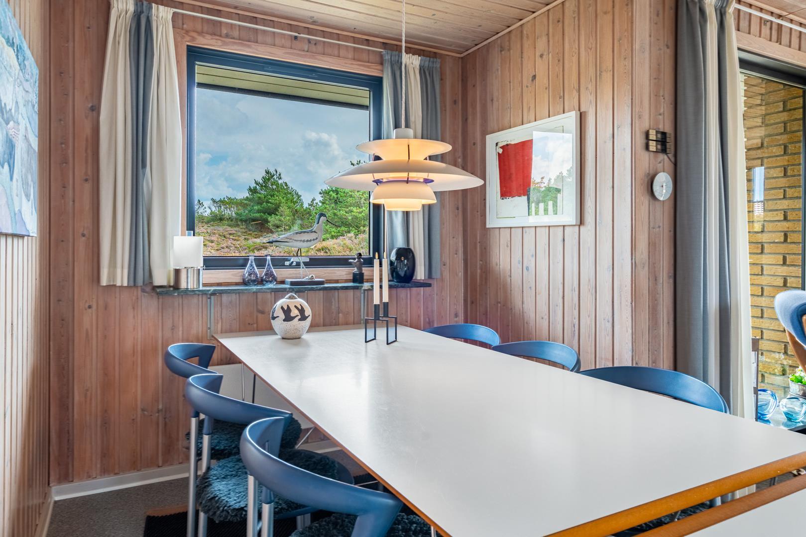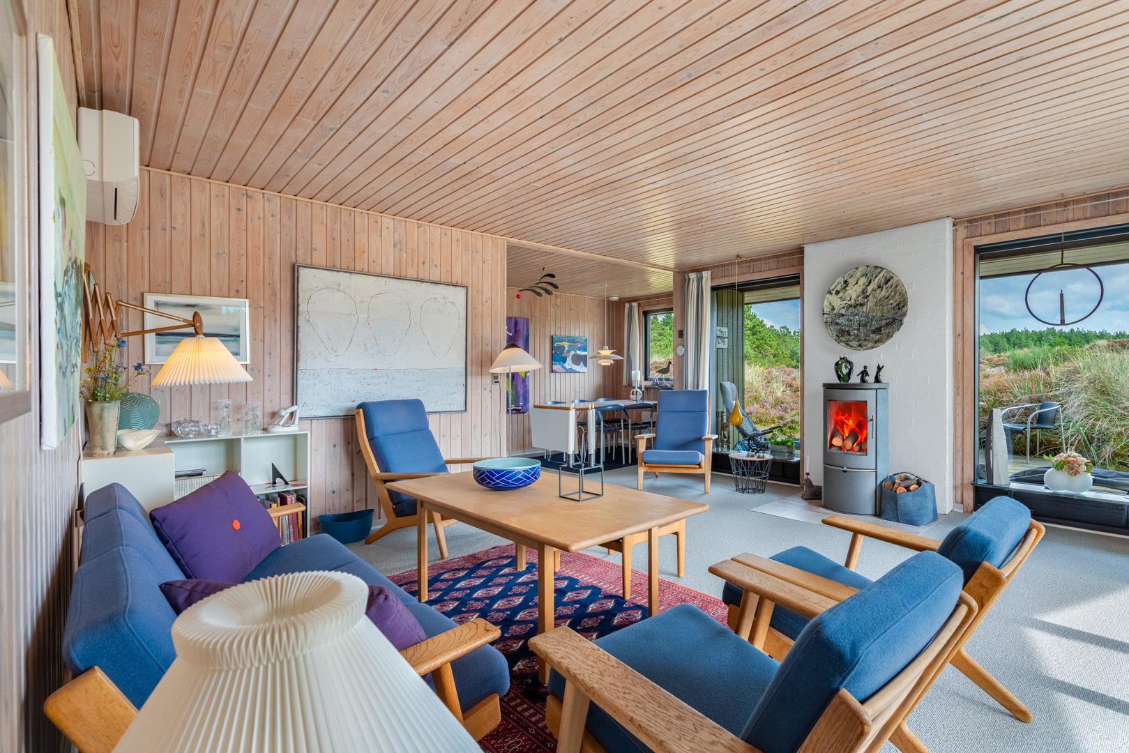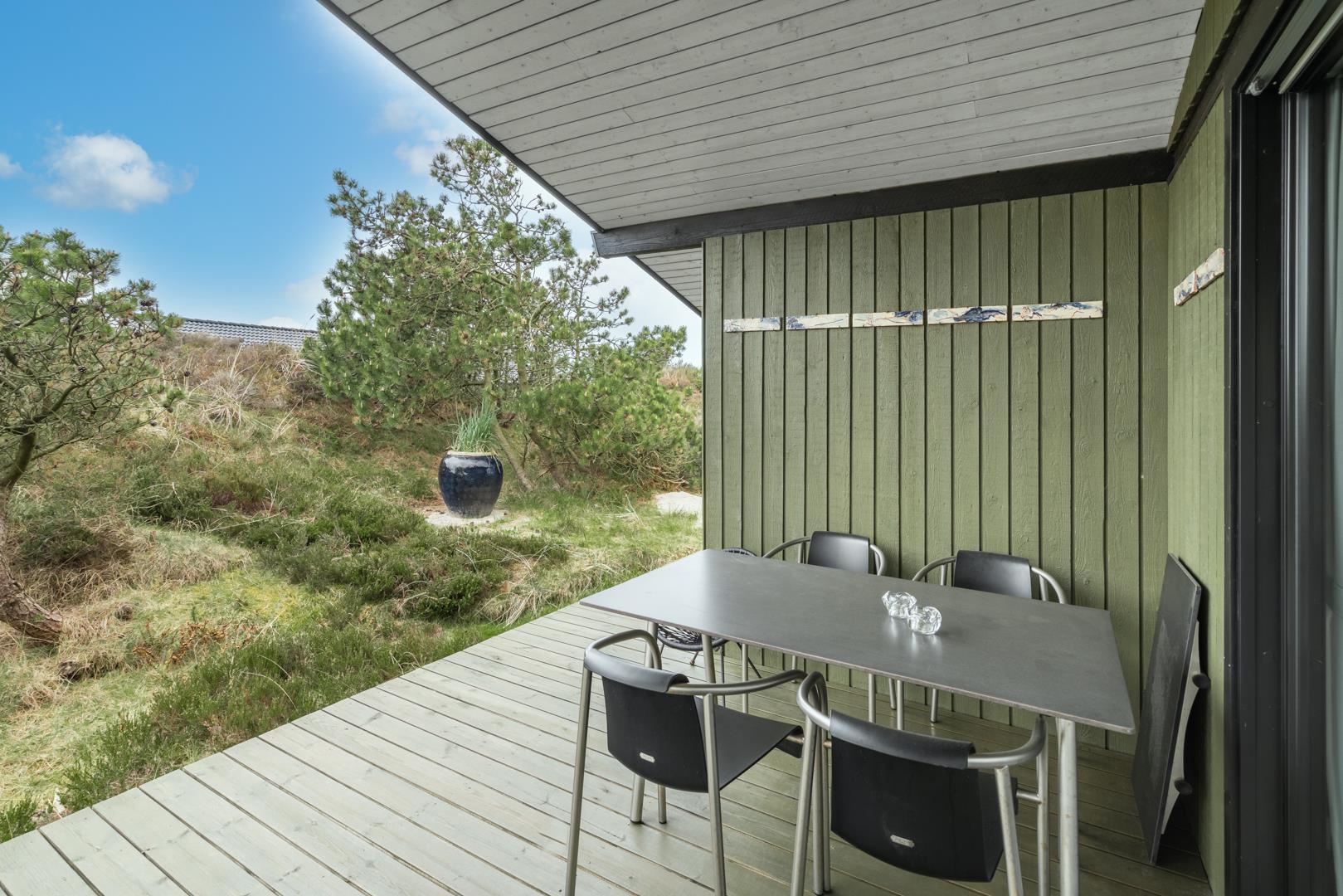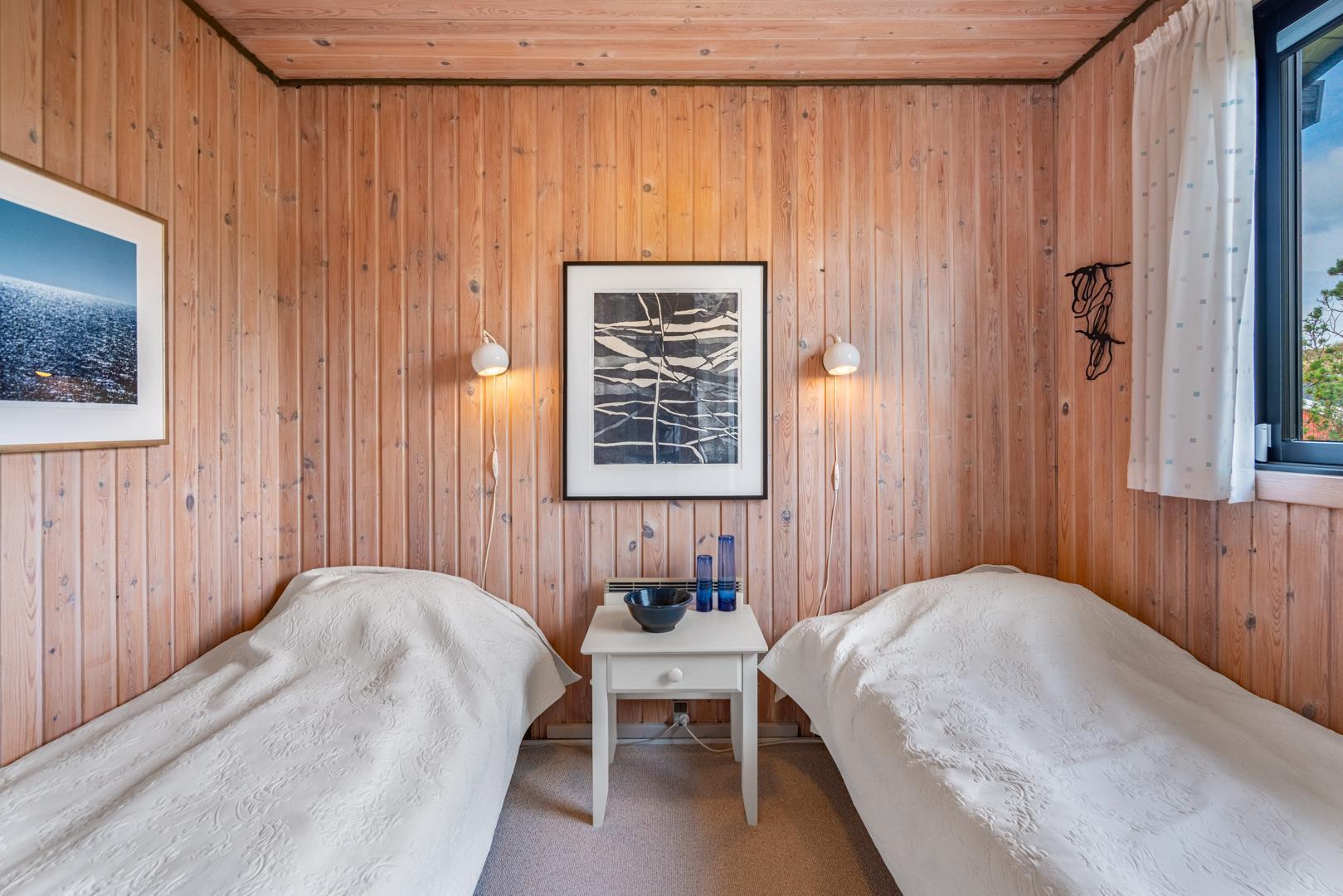 Dieses private, geschmackvoll eingerichtete Ferienhaus befindet sich auf einem ruhigen, hügeligen Naturgrundstück nahe dem Naturschutzgebiet. Das Haus liegt etwas abseits des Weges. Die ungestörte, teilweise überdachte Terrasse mit toller Aussicht über die mit Heide bewachsenen Dünen ist vom Wohnbereich aus zugänglich. Bettengrösse: Doppelbett 180x200 cm. (2 Matratzen), Einzelbetten 85x200 cm., dobbeltbett 140 x 200