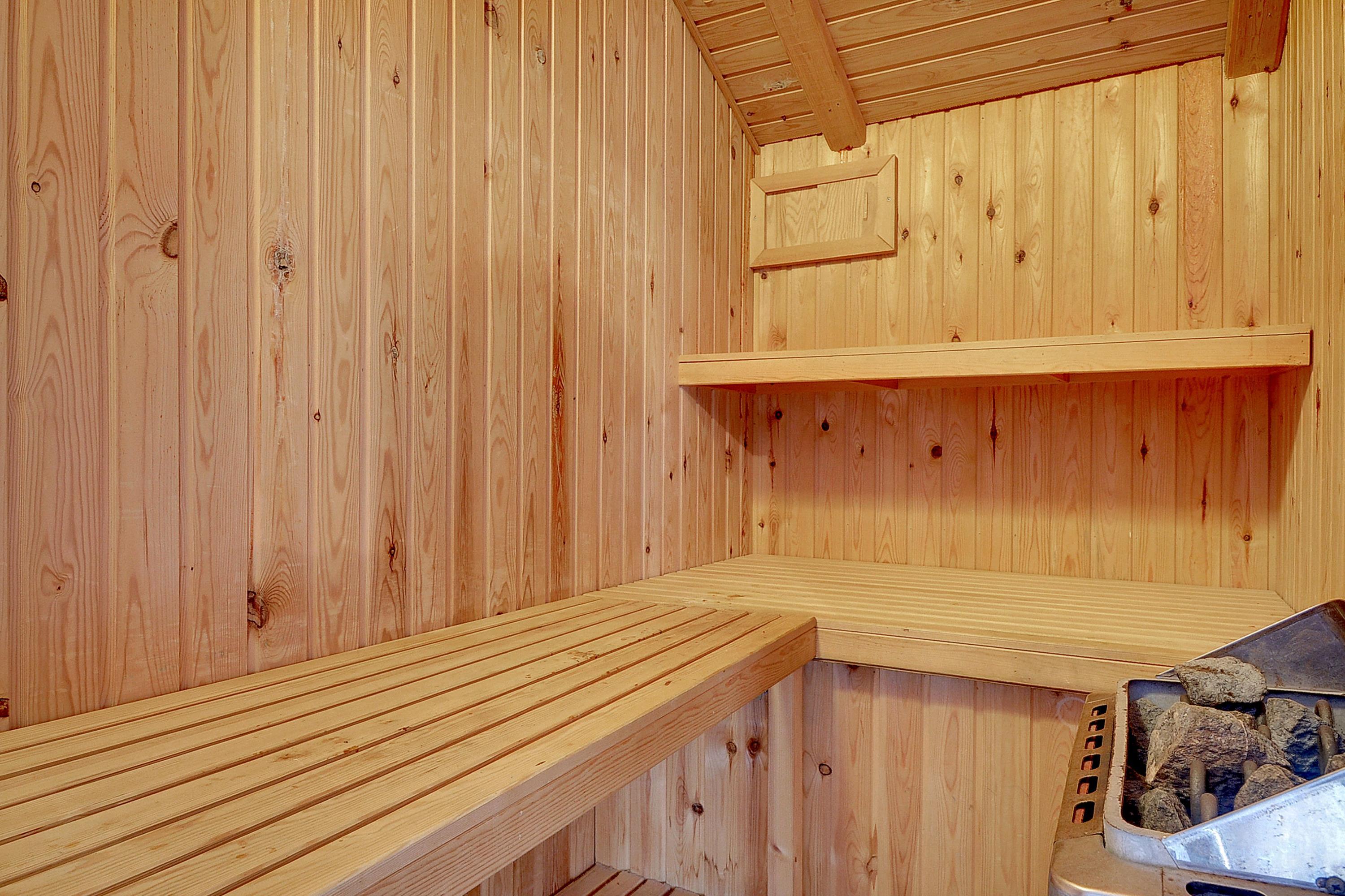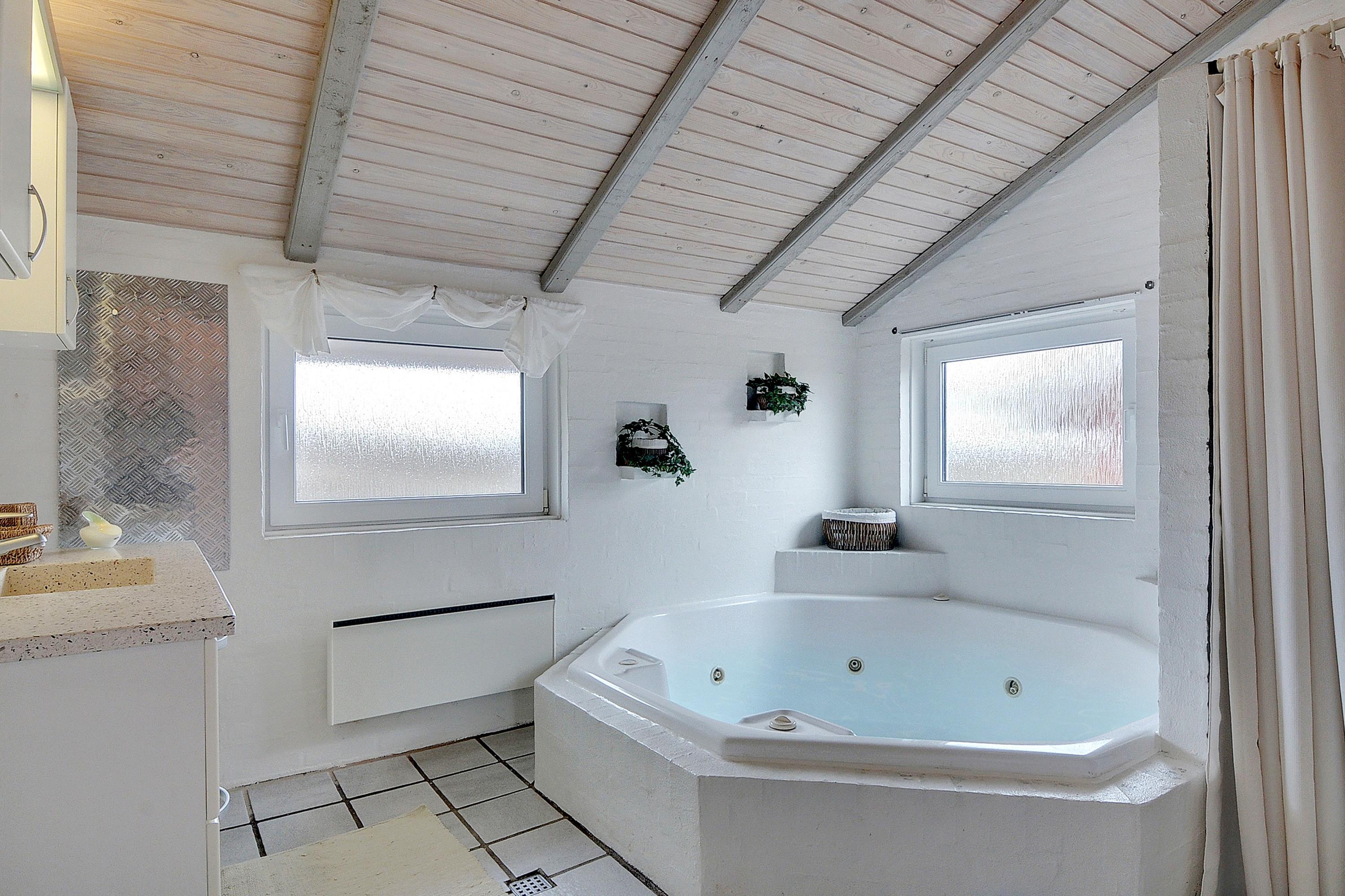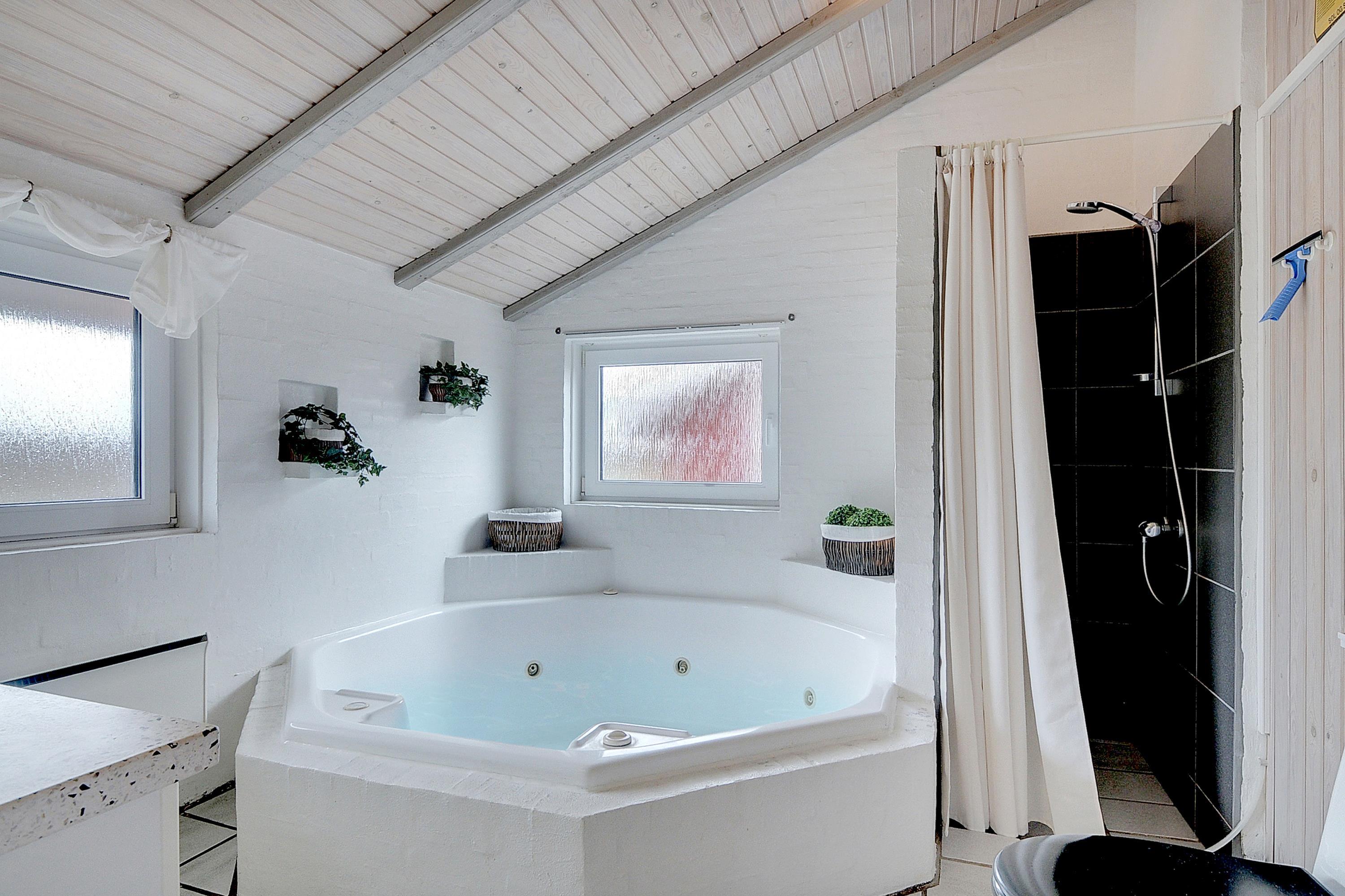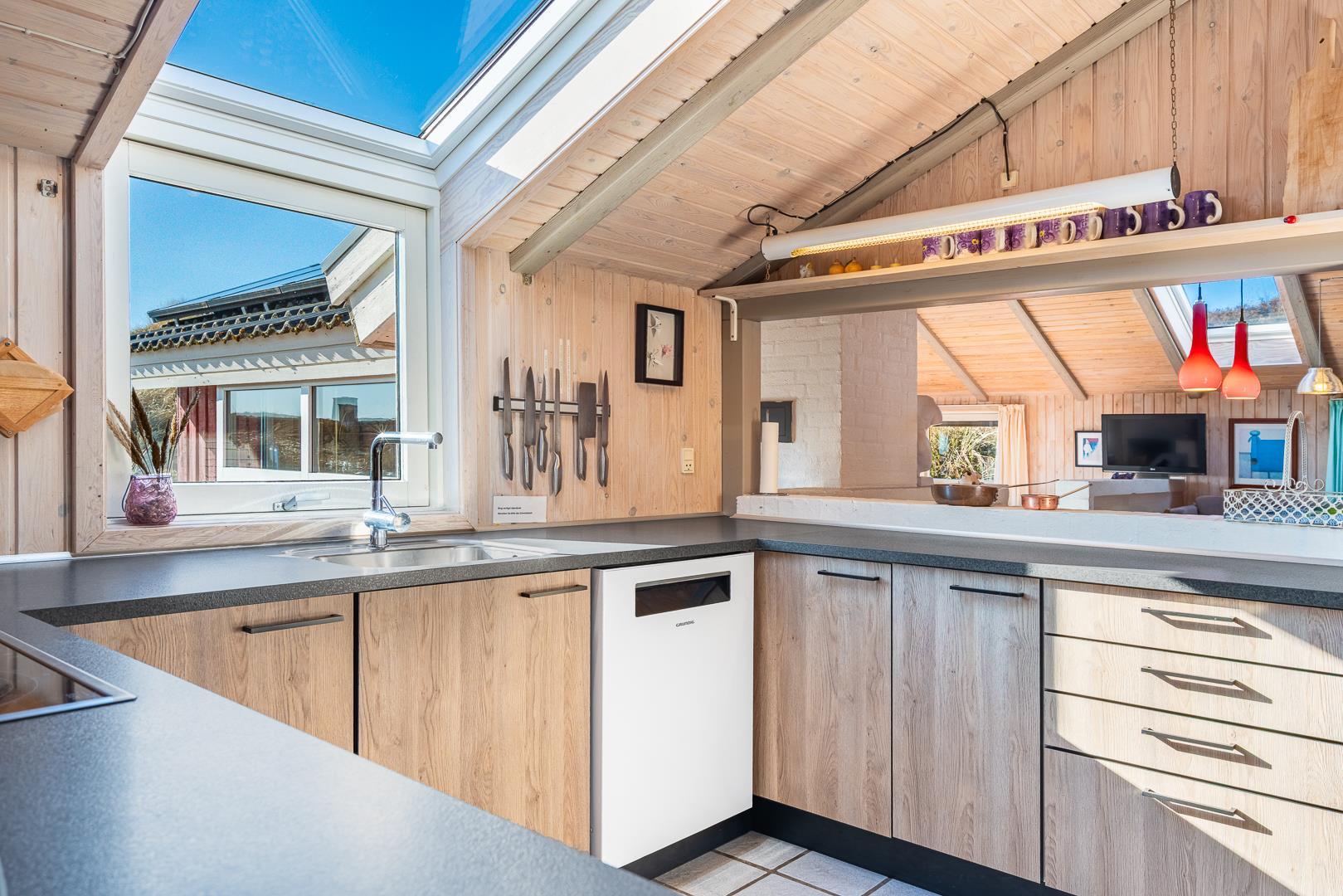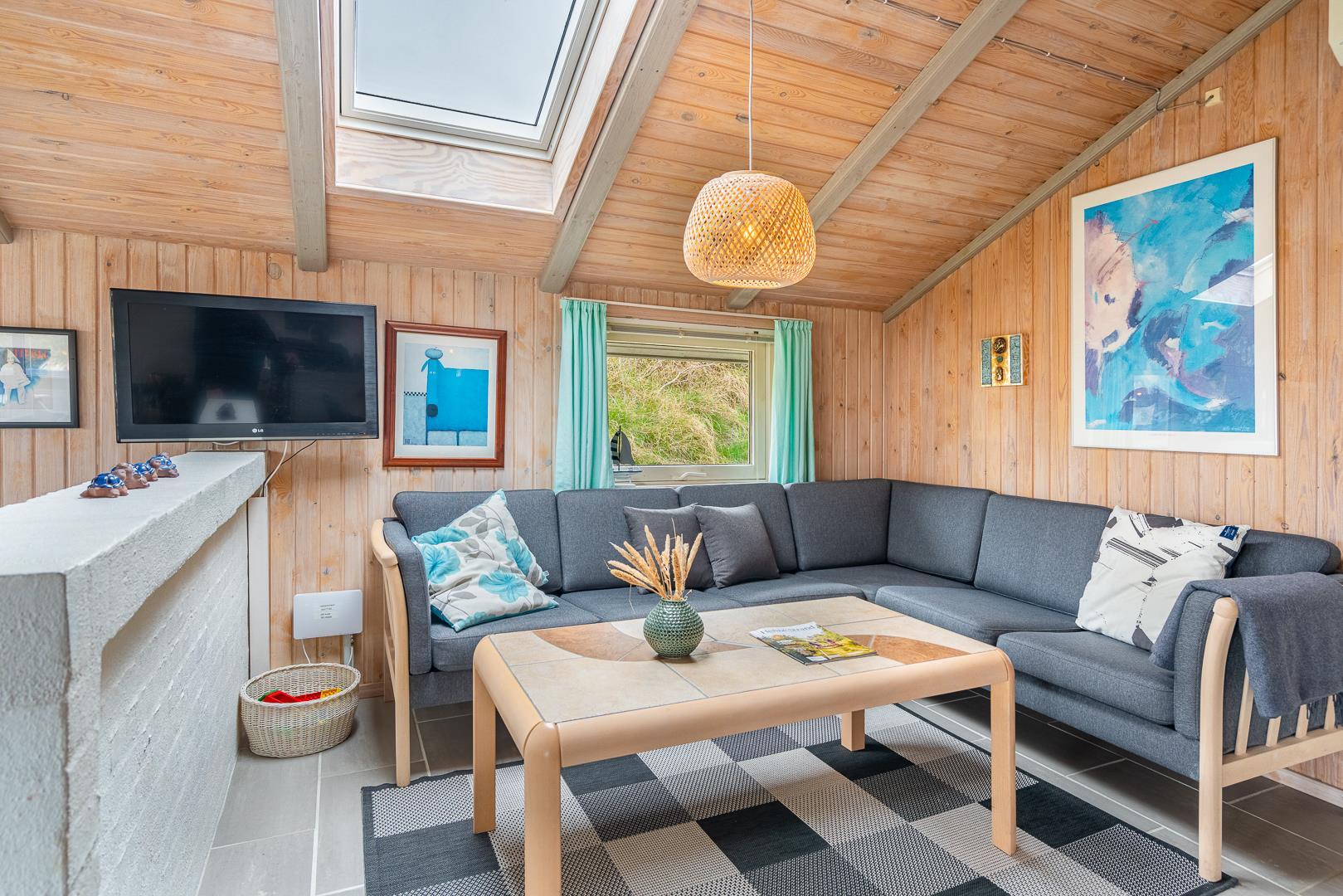 Dieses gemütliche Ferienhaus ist hoch gelegen und hat eine schöne Aussicht über das Sommerhausgebiet. Am Haus befindet sich eine schöne, große, Terrasse in Richtung Süden. Die schöne Küche mit viel Arbeitsfläche ist mit dem Wohn- und Essbereich kombiniert. In diesem Teil des Wohnbereichs befindet sich auch der Fernseher. Über eine Stufe gelangt man in einen weiteren Teil des Wohnbereichs hinunter, wo man vom Ecksofa aus wunderbar die Flammen im großen Brennofen mit Glasscheibe betrachten kann. Von hier aus besteht ebenfalls Zugang zur Terrasse. Im Haus befinden sich ein großes Badezimmer mit großem 4-Pers-Whirlpool und Sauna sowie ein zusätzliches WC. Im Hauswirtschaftsraum stehen eine Waschmaschine und ein Trockner zur Verfügung. Ein Safe ist ebenfalls vorhanden.