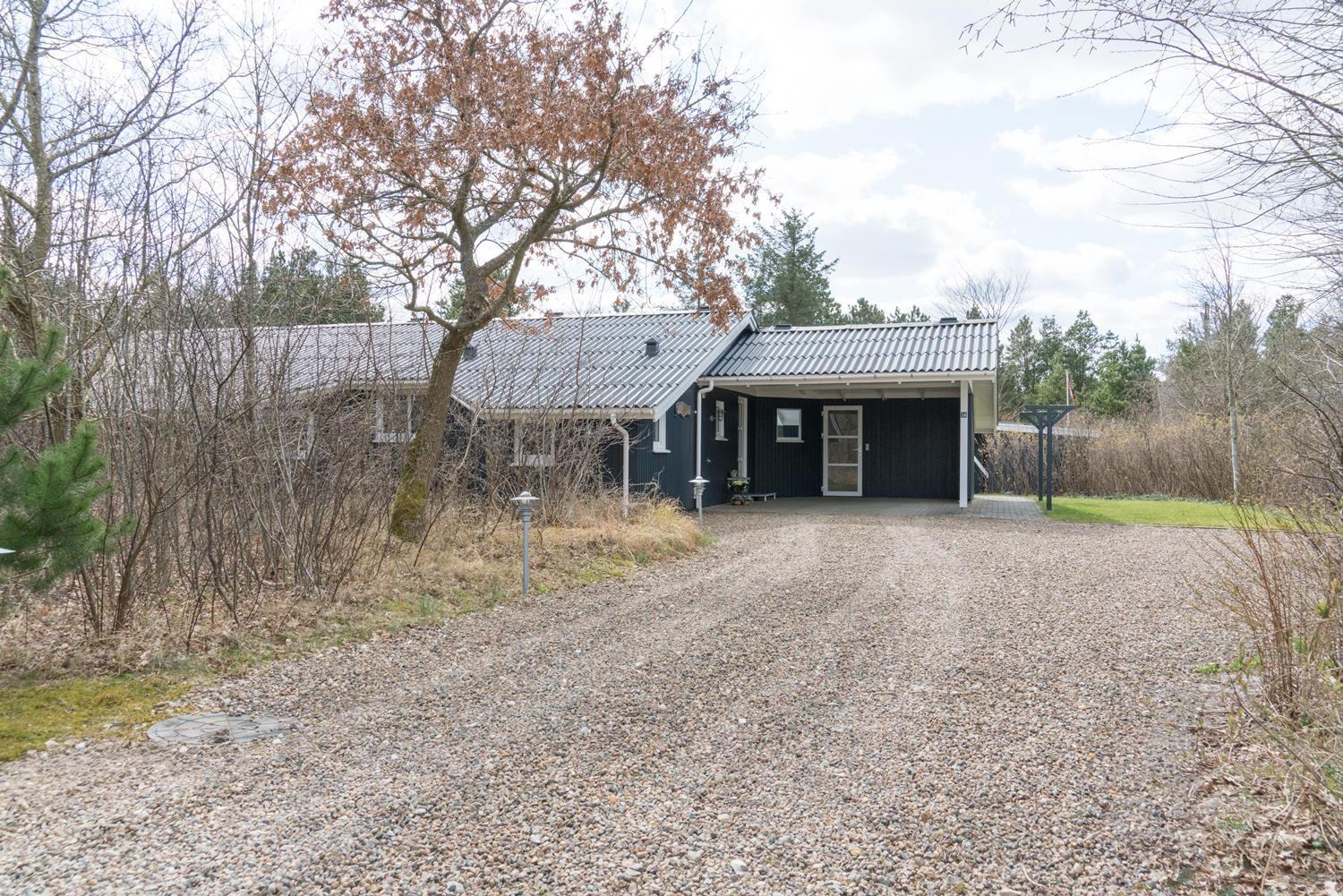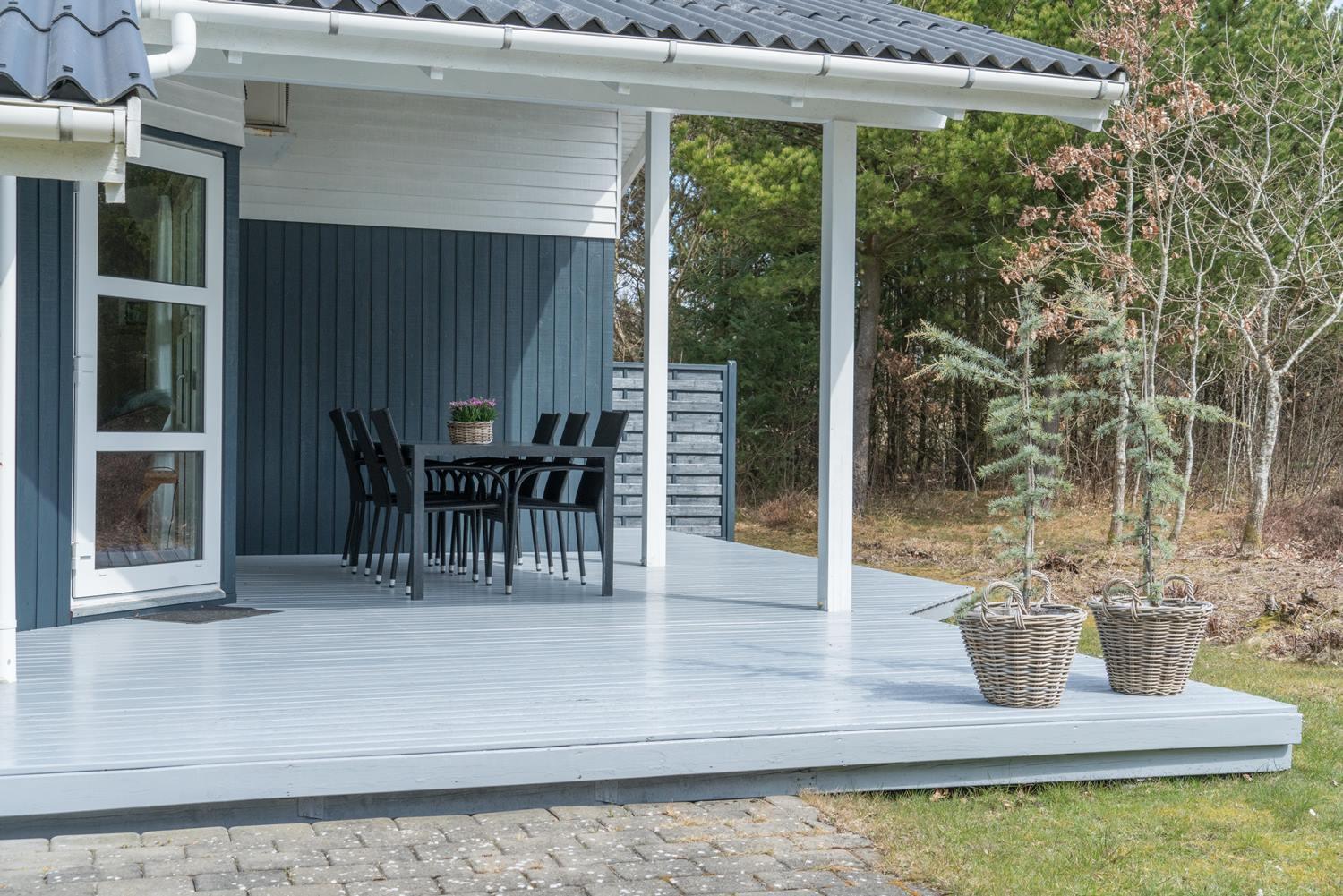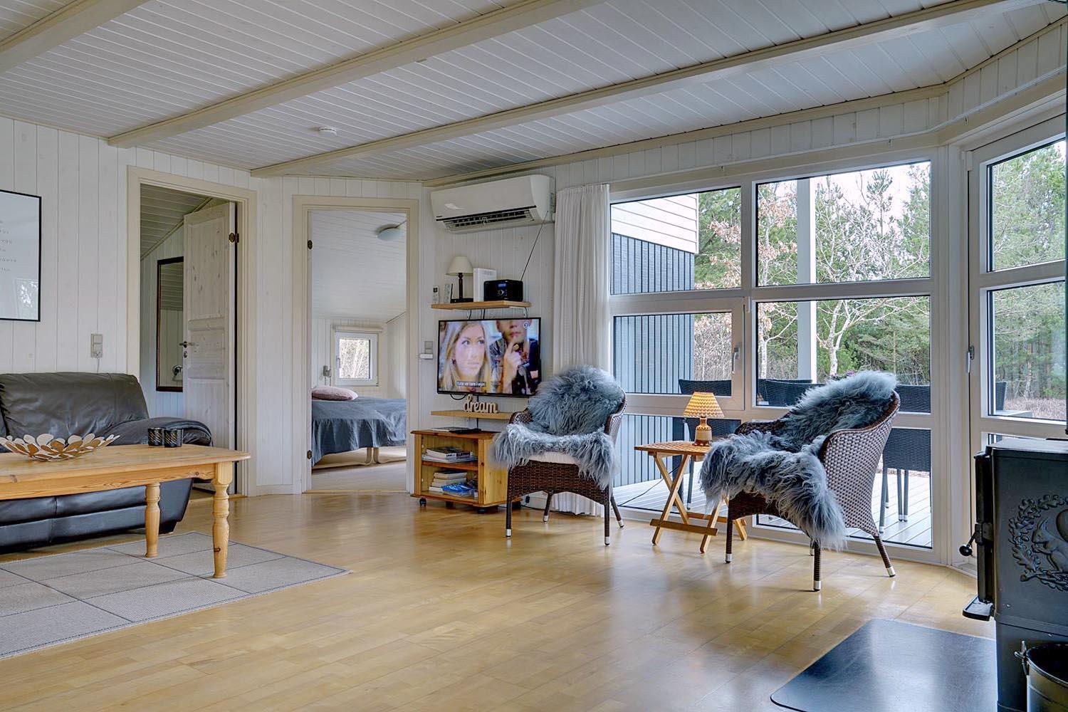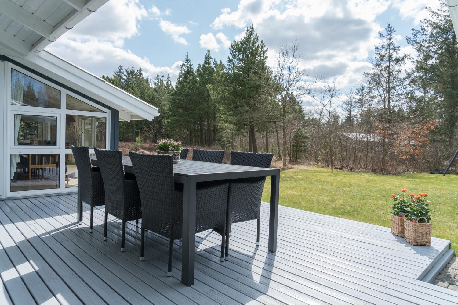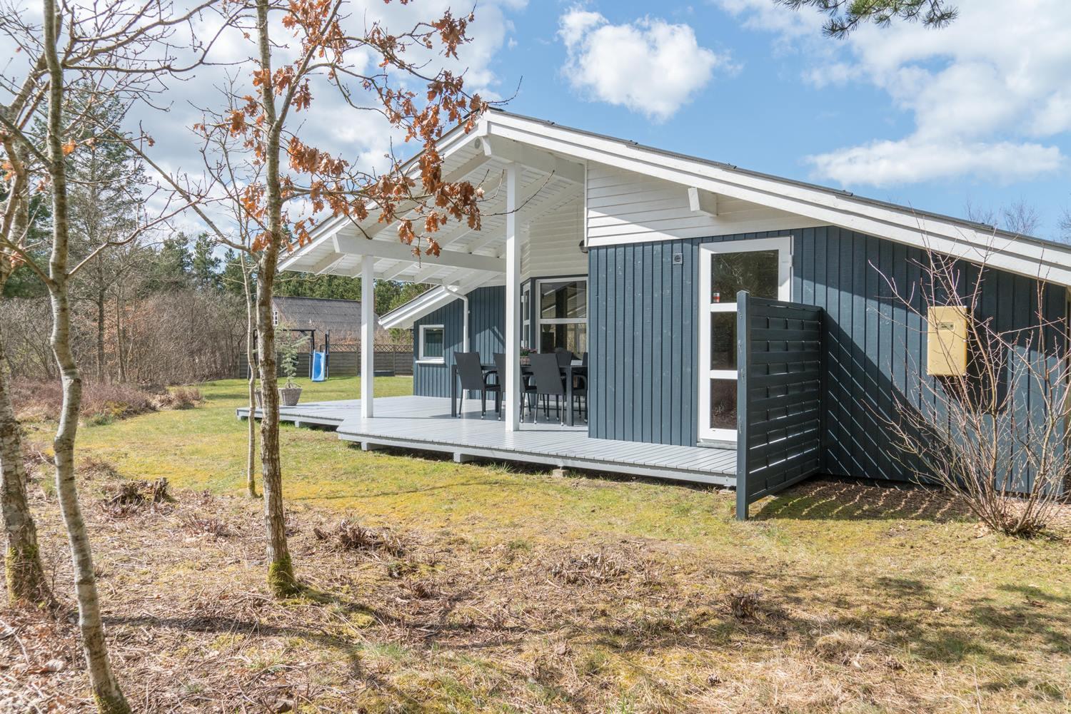 Schönes helles und gepflegtes Ferienhaus mit mehreren Holzterrassen. Das Haus liegt auf einem geschützten Waldgrund umgeben von Bäumen und mit viel Platz für Ballspiele. Hübsche und gut ausgestattete Küche in offener Verbindung zum Wohnraum. Vom großen Wohnraum gelang man auf zwei große Terrassen, von denen die eine teilweise überdacht ist. Auch von zwei Schlafräumen aus gelangt man auf die Terrassen. Großes Badezimmer mit Whirlpool, Duschnische und kleinerer Sauna. Carport mit Abstellraum für Fahrräder und Anderes.