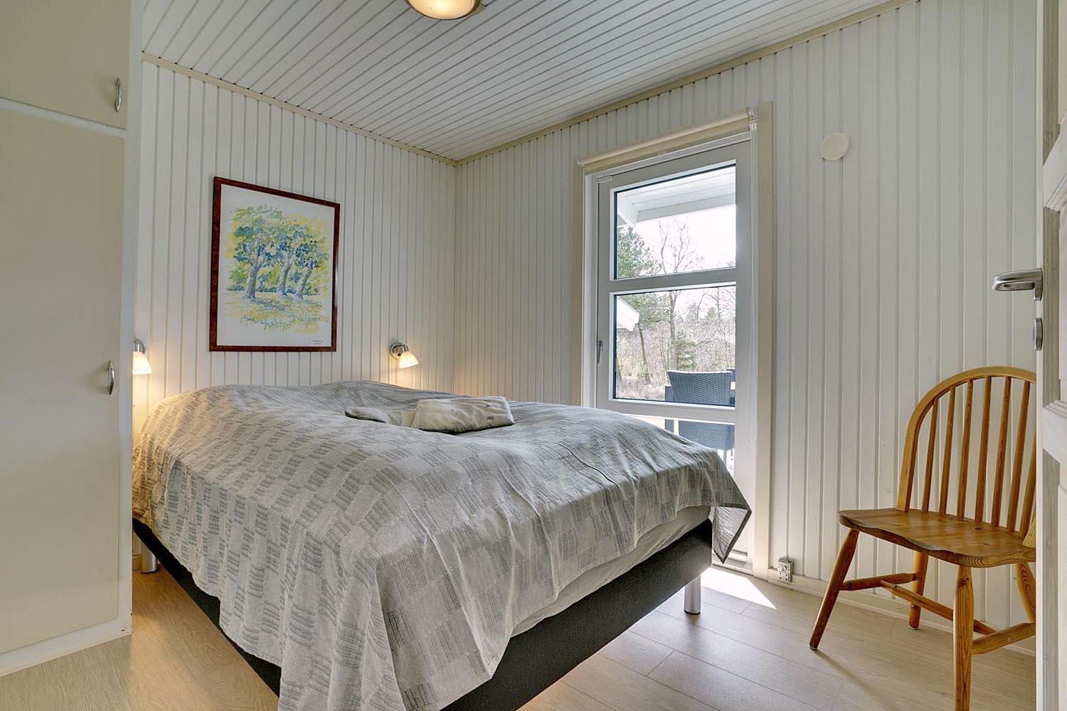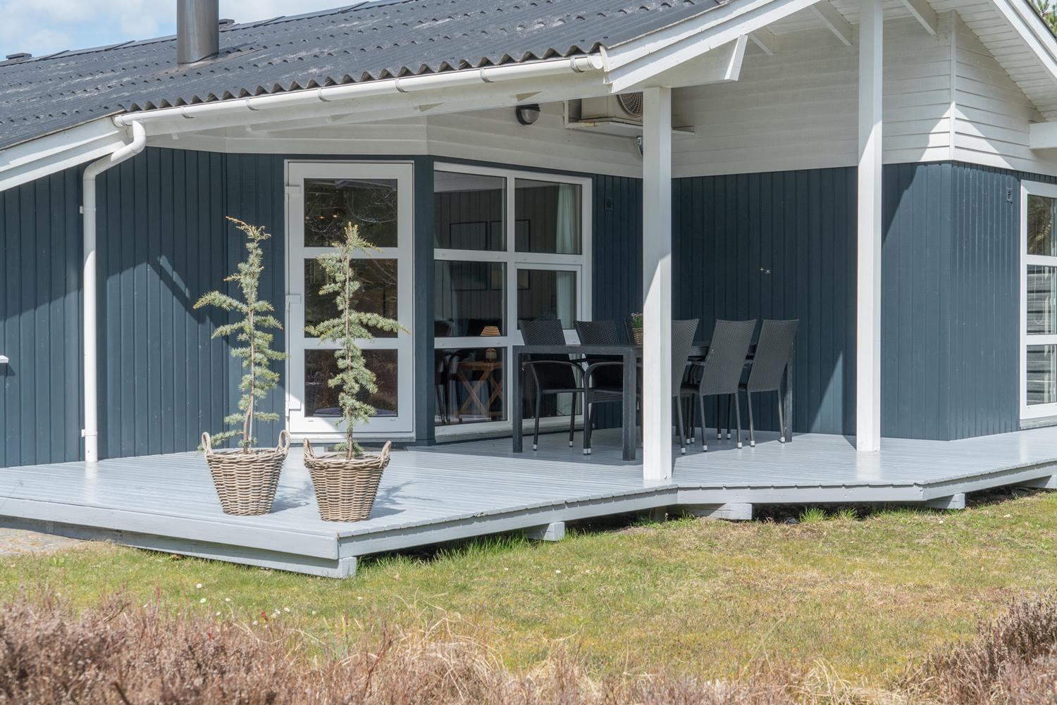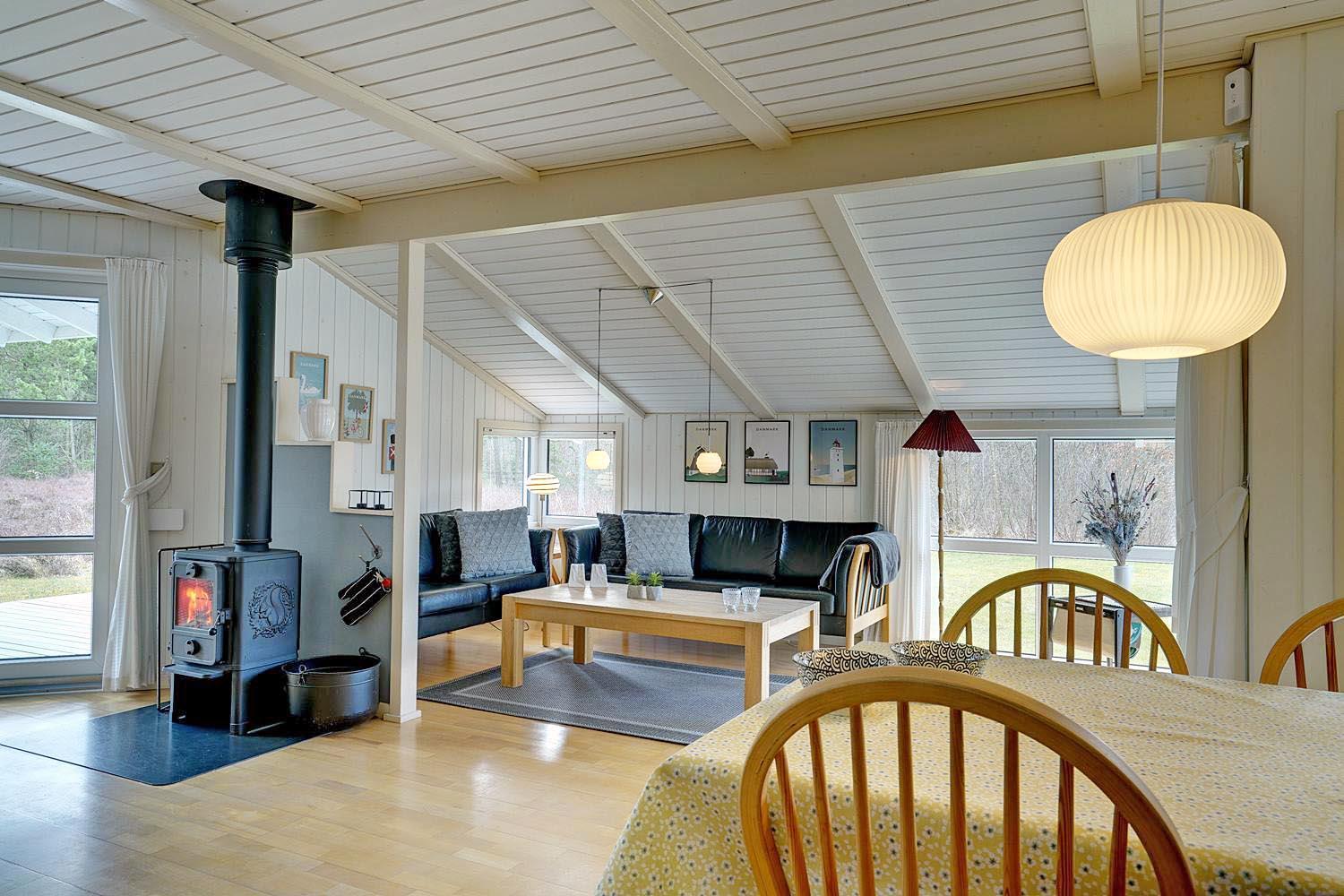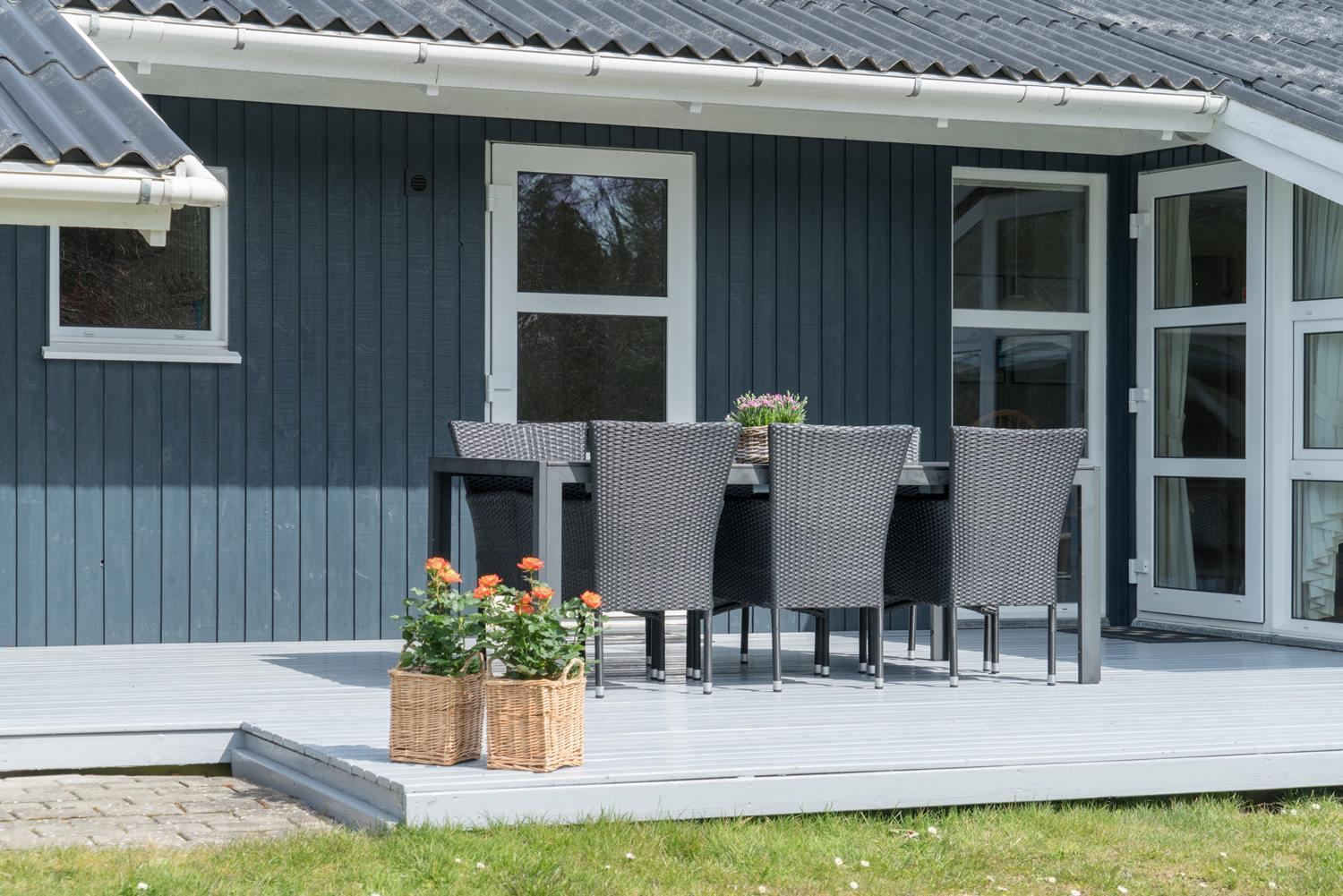 Schönes helles und gepflegtes Ferienhaus mit mehreren Holzterrassen. Das Haus liegt auf einem geschützten Waldgrund umgeben von Bäumen und mit viel Platz für Ballspiele. Hübsche und gut ausgestattete Küche in offener Verbindung zum Wohnraum. Vom großen Wohnraum gelang man auf zwei große Terrassen, von denen die eine teilweise überdacht ist. Auch von zwei Schlafräumen aus gelangt man auf die Terrassen. Großes Badezimmer mit Whirlpool, Duschnische und kleinerer Sauna. Carport mit Abstellraum für Fahrräder und Anderes.
