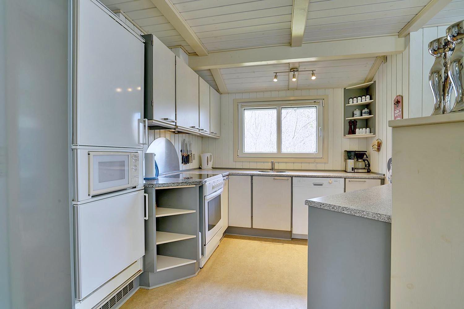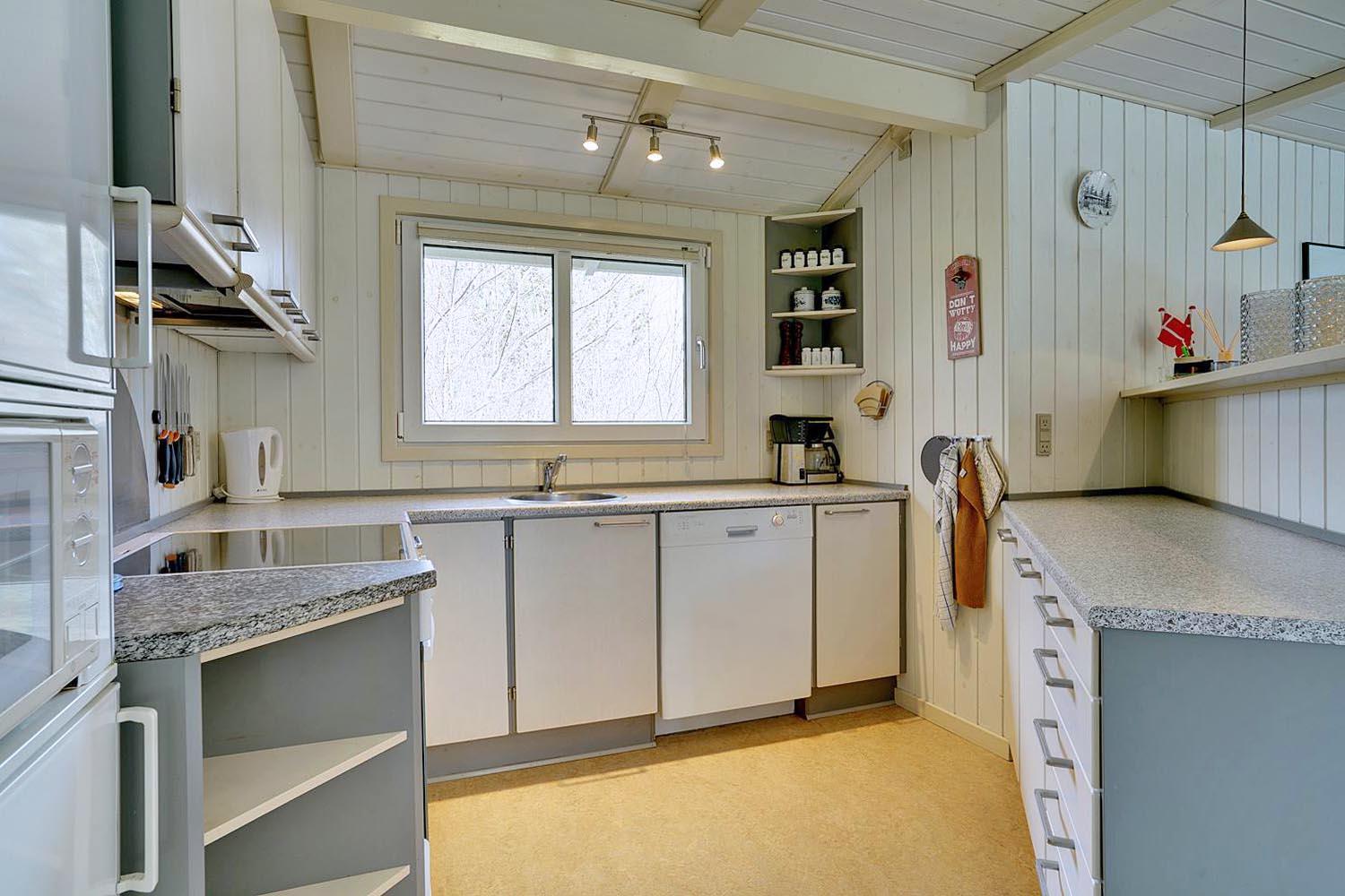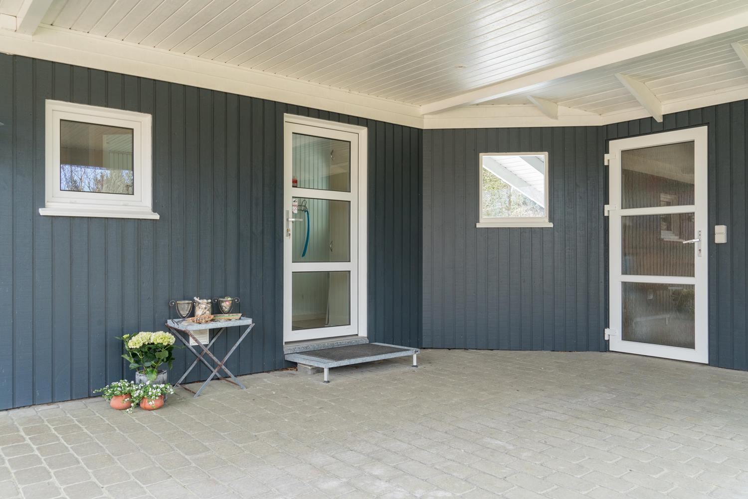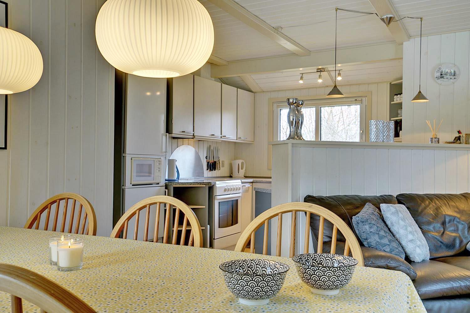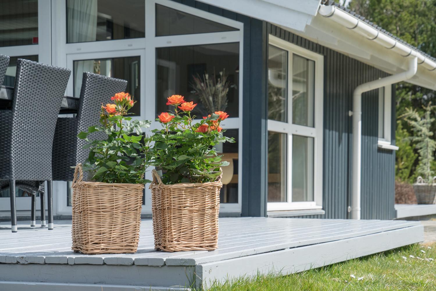 Schönes helles und gepflegtes Ferienhaus mit mehreren Holzterrassen. Das Haus liegt auf einem geschützten Waldgrund umgeben von Bäumen und mit viel Platz für Ballspiele. Hübsche und gut ausgestattete Küche in offener Verbindung zum Wohnraum. Vom großen Wohnraum gelang man auf zwei große Terrassen, von denen die eine teilweise überdacht ist. Auch von zwei Schlafräumen aus gelangt man auf die Terrassen. Großes Badezimmer mit Whirlpool, Duschnische und kleinerer Sauna. Carport mit Abstellraum für Fahrräder und Anderes.