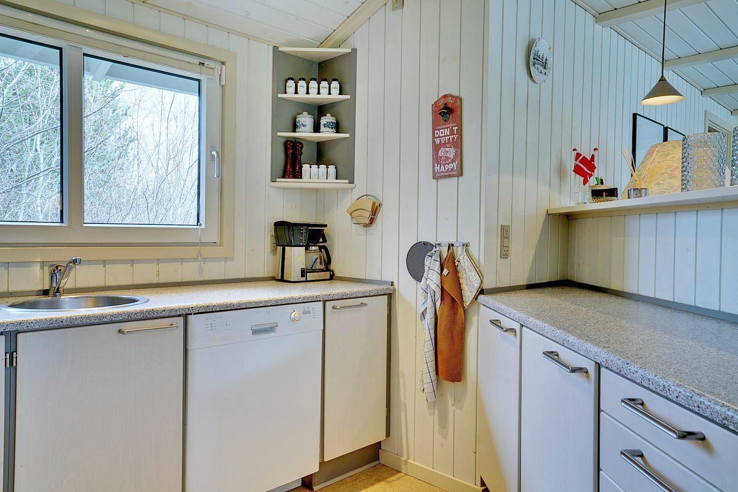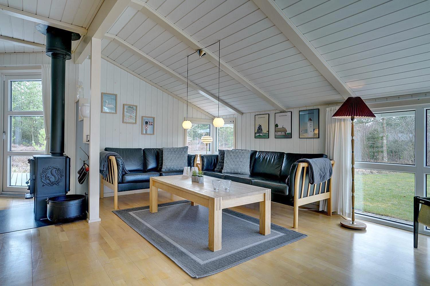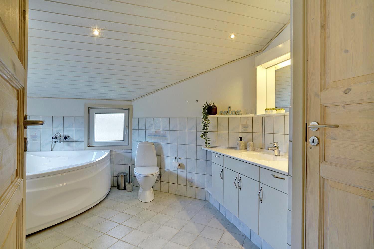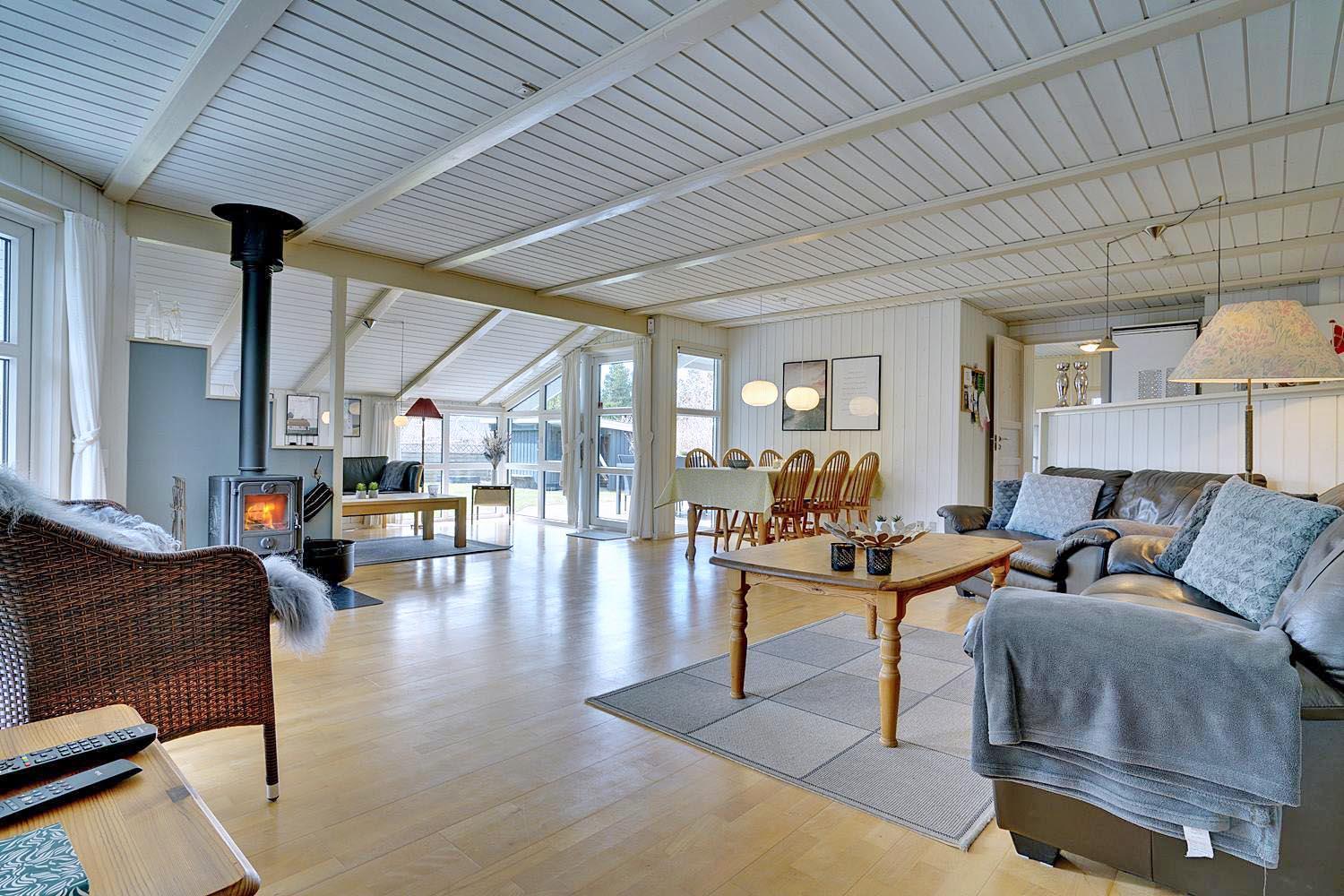 Schönes helles und gepflegtes Ferienhaus mit mehreren Holzterrassen. Das Haus liegt auf einem geschützten Waldgrund umgeben von Bäumen und mit viel Platz für Ballspiele. Hübsche und gut ausgestattete Küche in offener Verbindung zum Wohnraum. Vom großen Wohnraum gelang man auf zwei große Terrassen, von denen die eine teilweise überdacht ist. Auch von zwei Schlafräumen aus gelangt man auf die Terrassen. Großes Badezimmer mit Whirlpool, Duschnische und kleinerer Sauna. Carport mit Abstellraum für Fahrräder und Anderes.