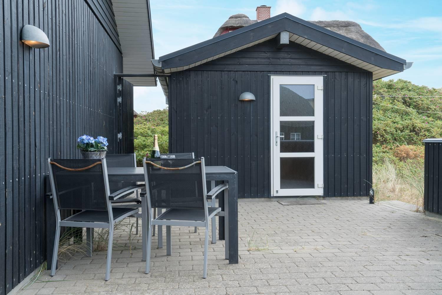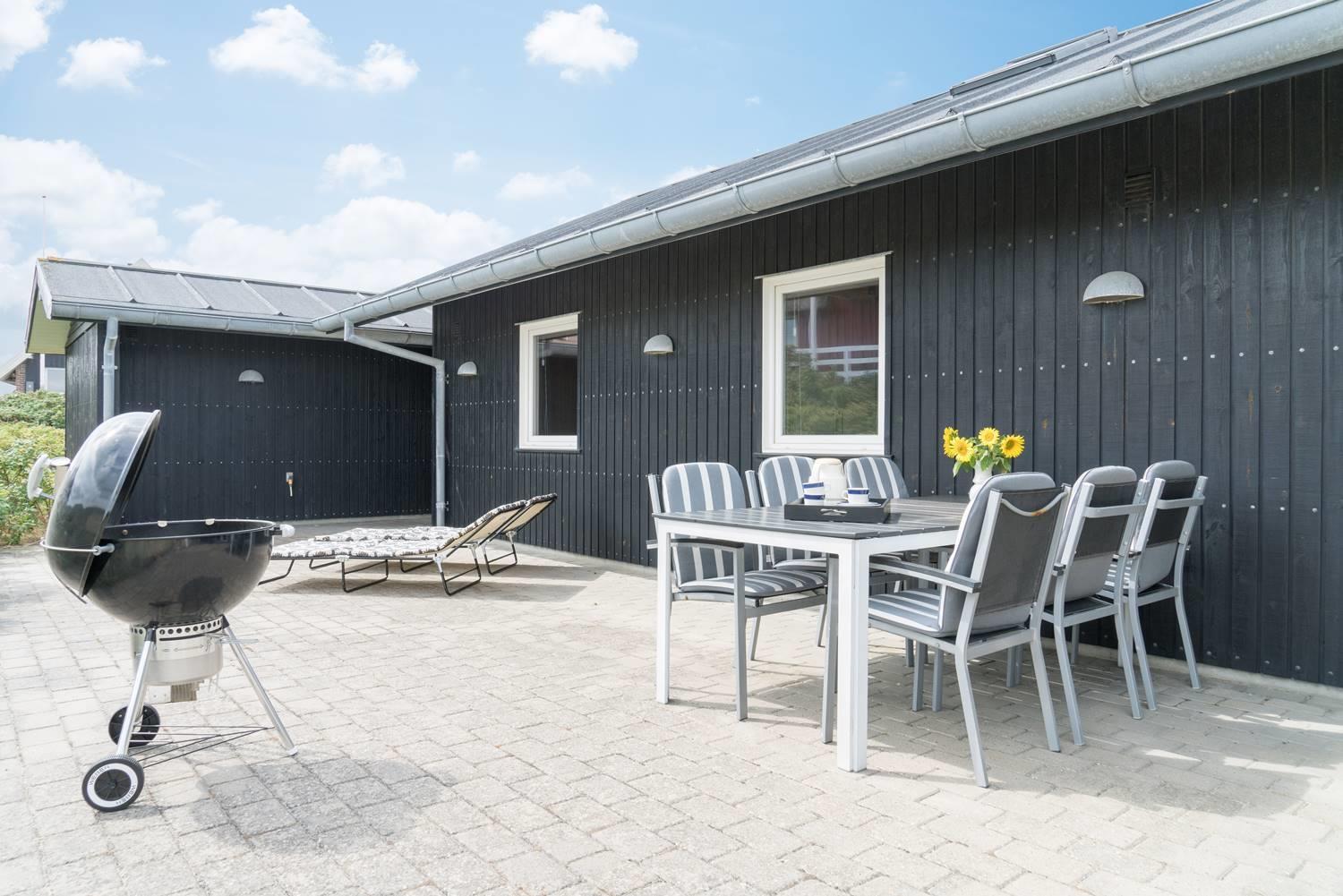 Auch im Außenbereich bietet dir dieses Ferienhaus in Henne Strand beste Voraussetzungen für einen gelungenen Urlaub. Die überdachte Terrasse lädt dazu ein, die frische Luft der Nordsee zu genießen – unabhängig vom Wetter.