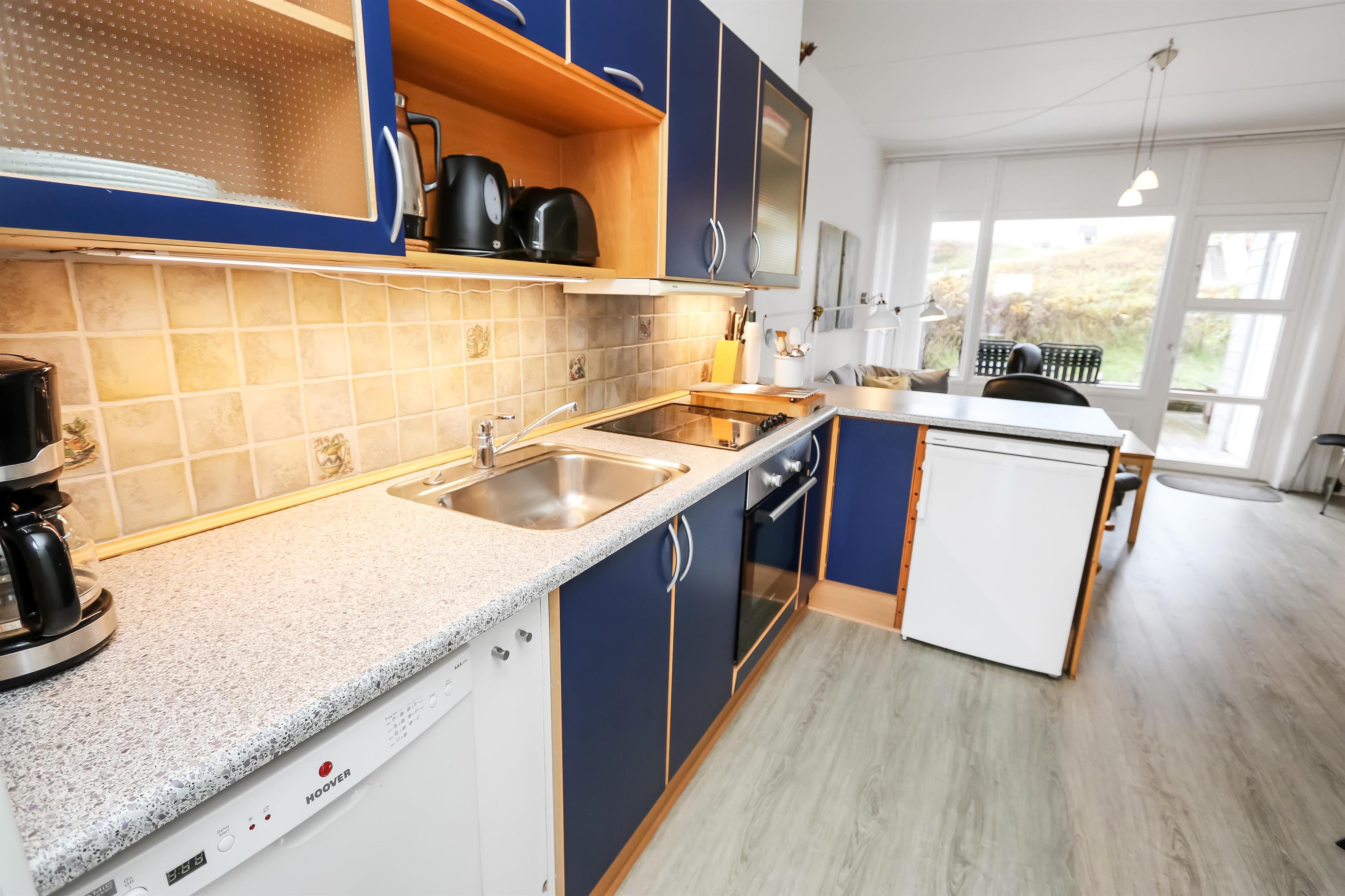 Richtig schöne Wohnung für 6 Personen im Erdgeschoss. 2 Schlafzimmer: 1DB und Pergofußboden und 1 3/4 Bett mit Über-Etagenbett. Badezimmer mit Toilette, Waschbecken und Dusche. Küche mit Glasskeramischem Herd, Kühlschrank mit kleiner Frost box, Spülmaschine, Abzugshaube und Linoleumsfußboden. Wohnzimmer mit Leder- und Polstermöbel, Kabel-TV nur mit Streaming, DVD und Linoleumsfußboden. Sofa kann ausgeschlagen werden, dass für 2 Personen Schlafplätze sind. Vom Wohnzimmer ist der Ausgang zu der kleinen teilweiseüberdeckten Terrasse mit Gartenmöbeln. Die Treppe zum ersten Stock besteht aus 10 Stufen.