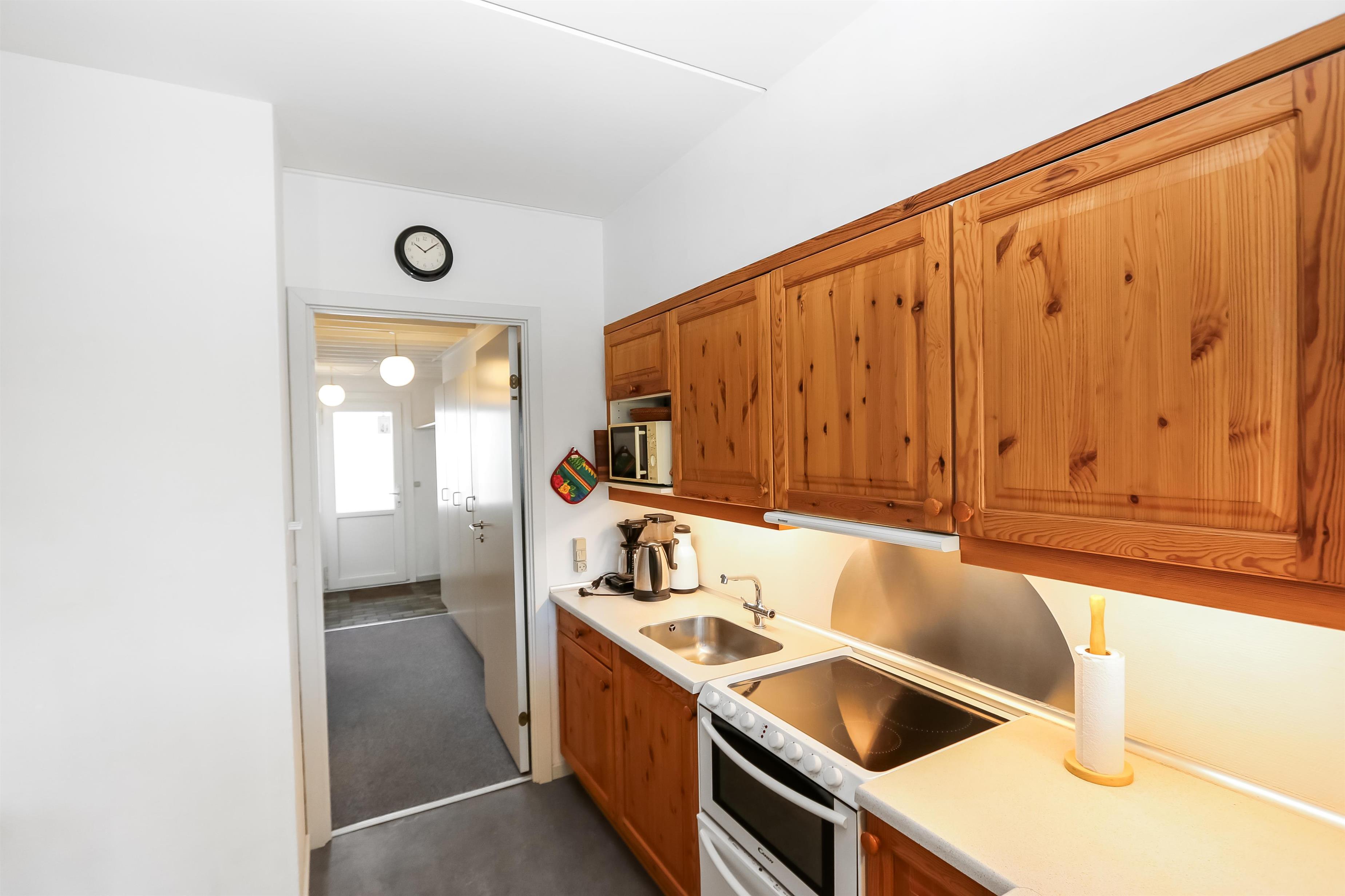 Schöne Ferienwohnung für 4 Personen im ersten Stock. Kombiniertes Wohnzimmer und Küche. Das Wohnzimmer ist eingerichtet mit Kabel-TV, Leder- und Polstermöbel und Teppich. Im Wohnzimmer ist ein Schlafsofa mit Platz für 2 Personen. Vom Wohnzimmer ist der Ausgang zu einem überdeckten Balkon mit Gartenmöbeln. Die Küche ist mit Glasskeramischem Herd, Abzugshaube, Kühlschrank mit kleiner 10 L Frostbox, Spülmaschine und Mikrowelle, Linoleumsfußboden. Badezimmer mit Toilette, Waschbecken und Dusche. 1 Schlafzimmer: 1DB und Teppich. Die Treppe zum ersten Stock besteht aus 14 Stufen.