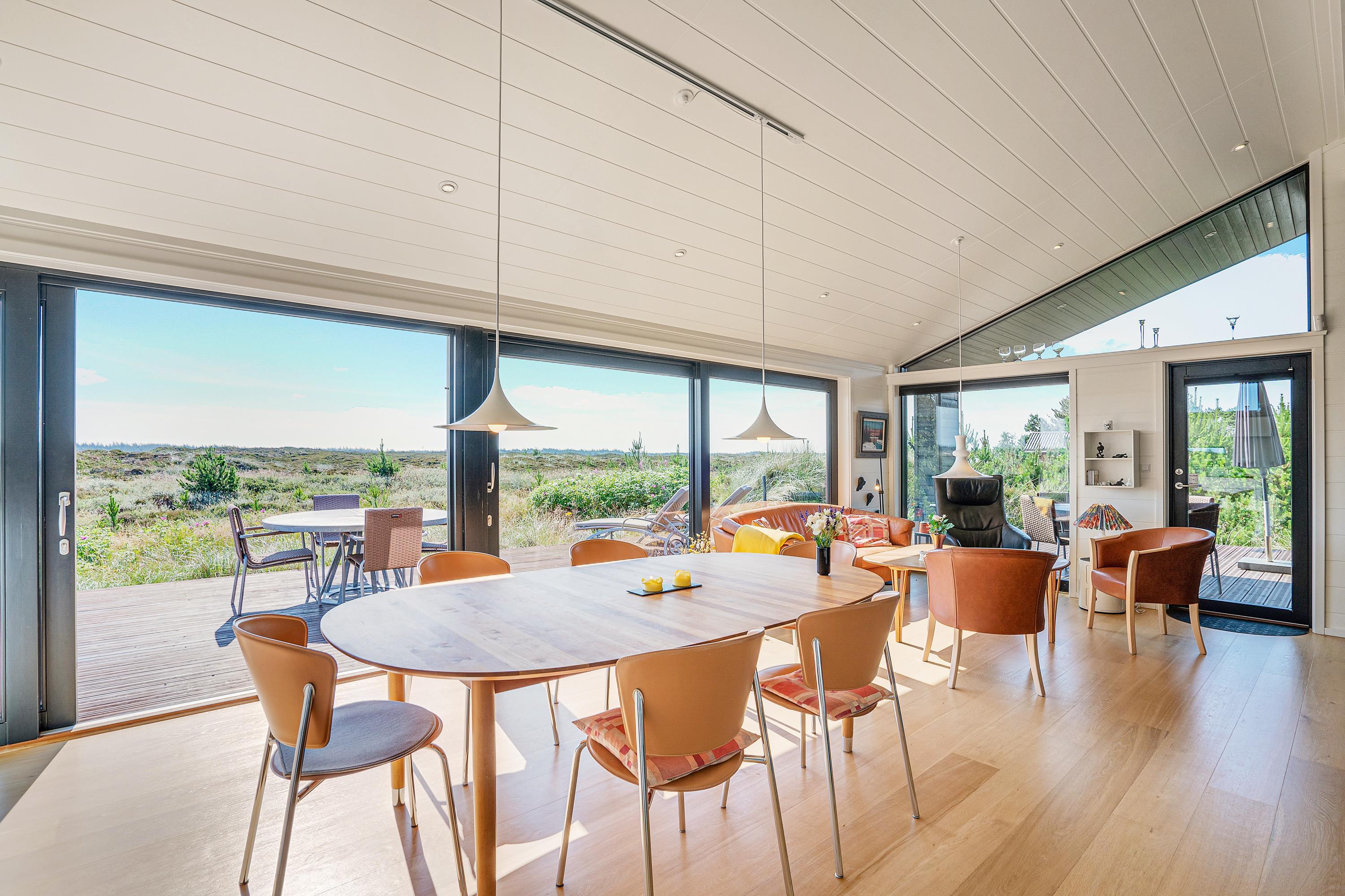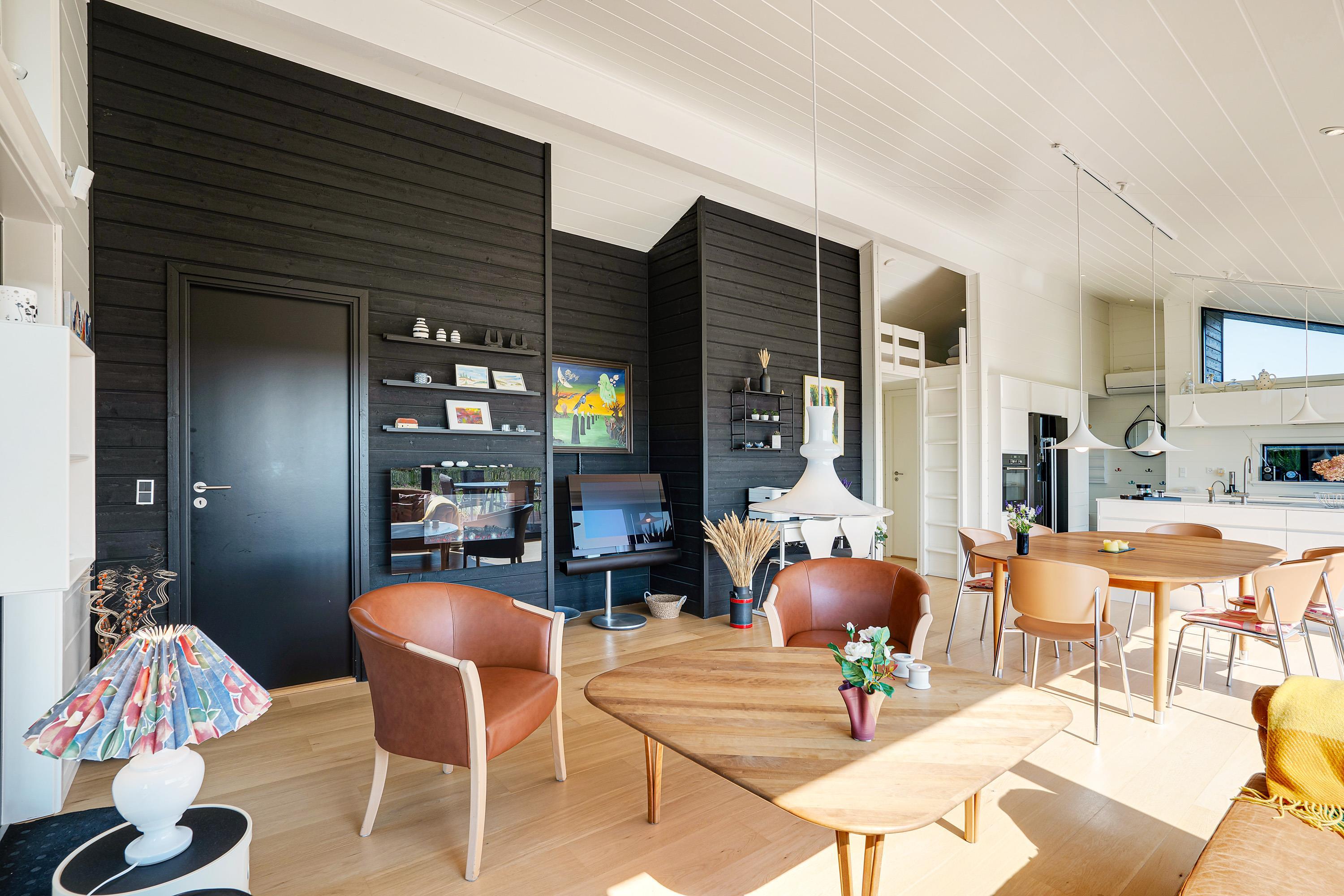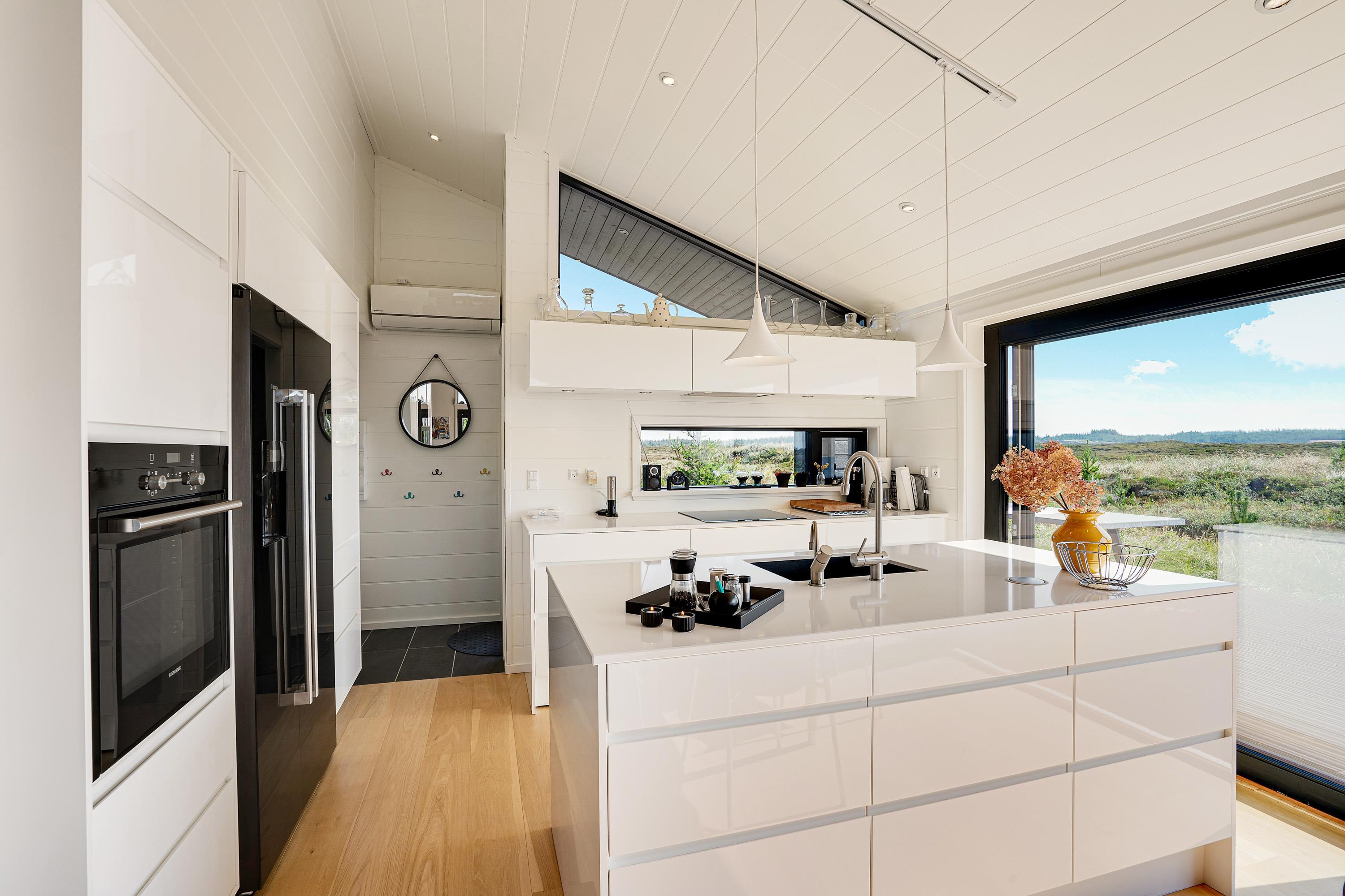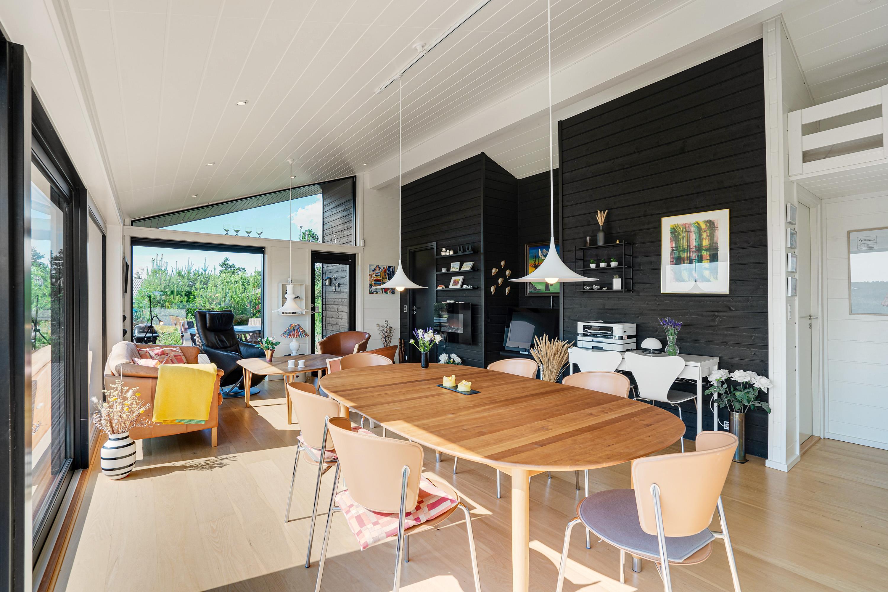 The kitchen, living room and dining area are in one large space, allowing the whole family to stay together whether you're preparing the next meal or relaxing comfortably on the sofa. From the main area, you have access to the adjoining terrace, where you can enjoy the morning's first rays of sunshine with a fresh cup of coffee while listening to birdsong. The view over the vast heathland is uniquely beautiful, especially in late summer when everything is in bloom!
