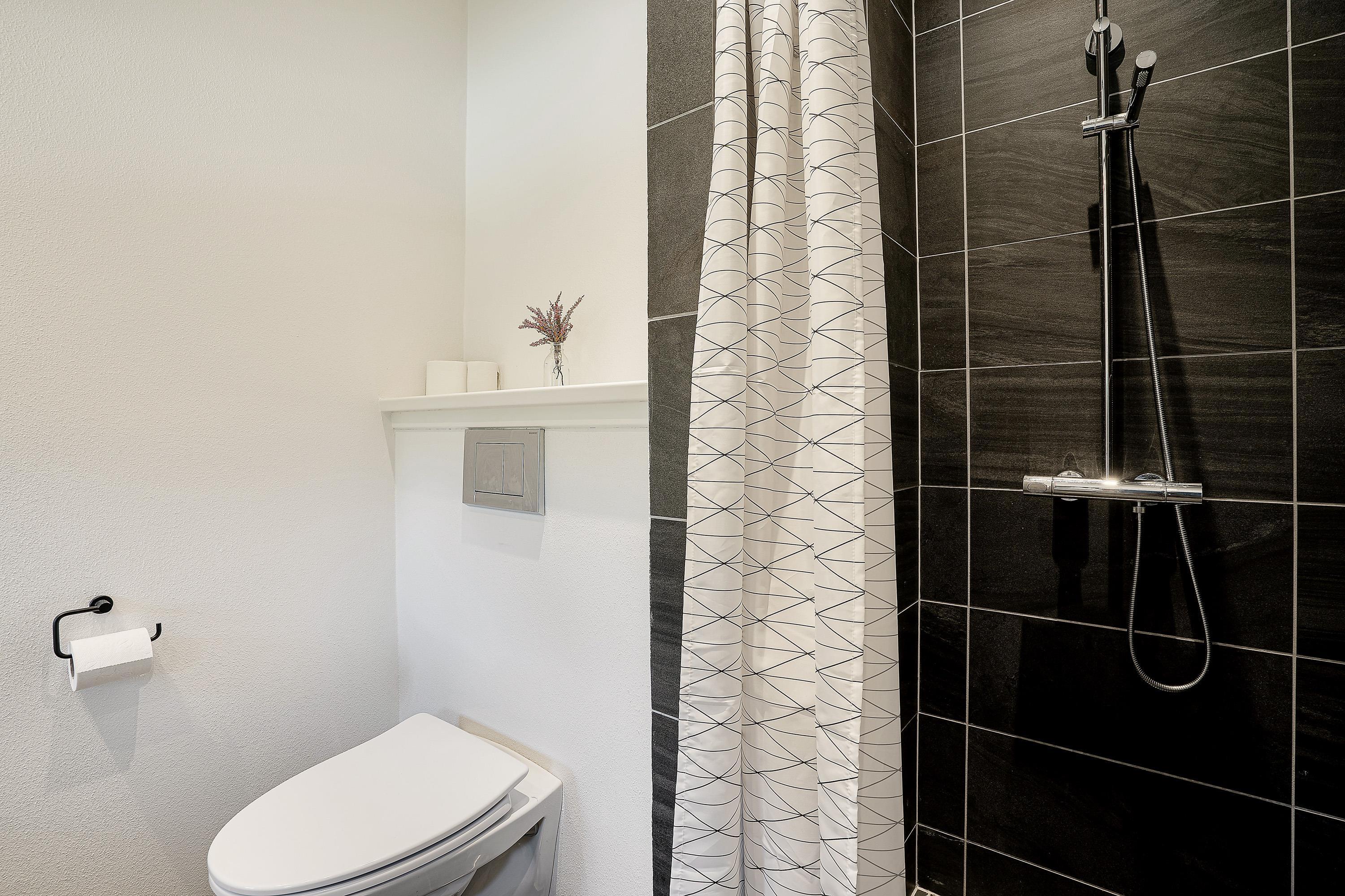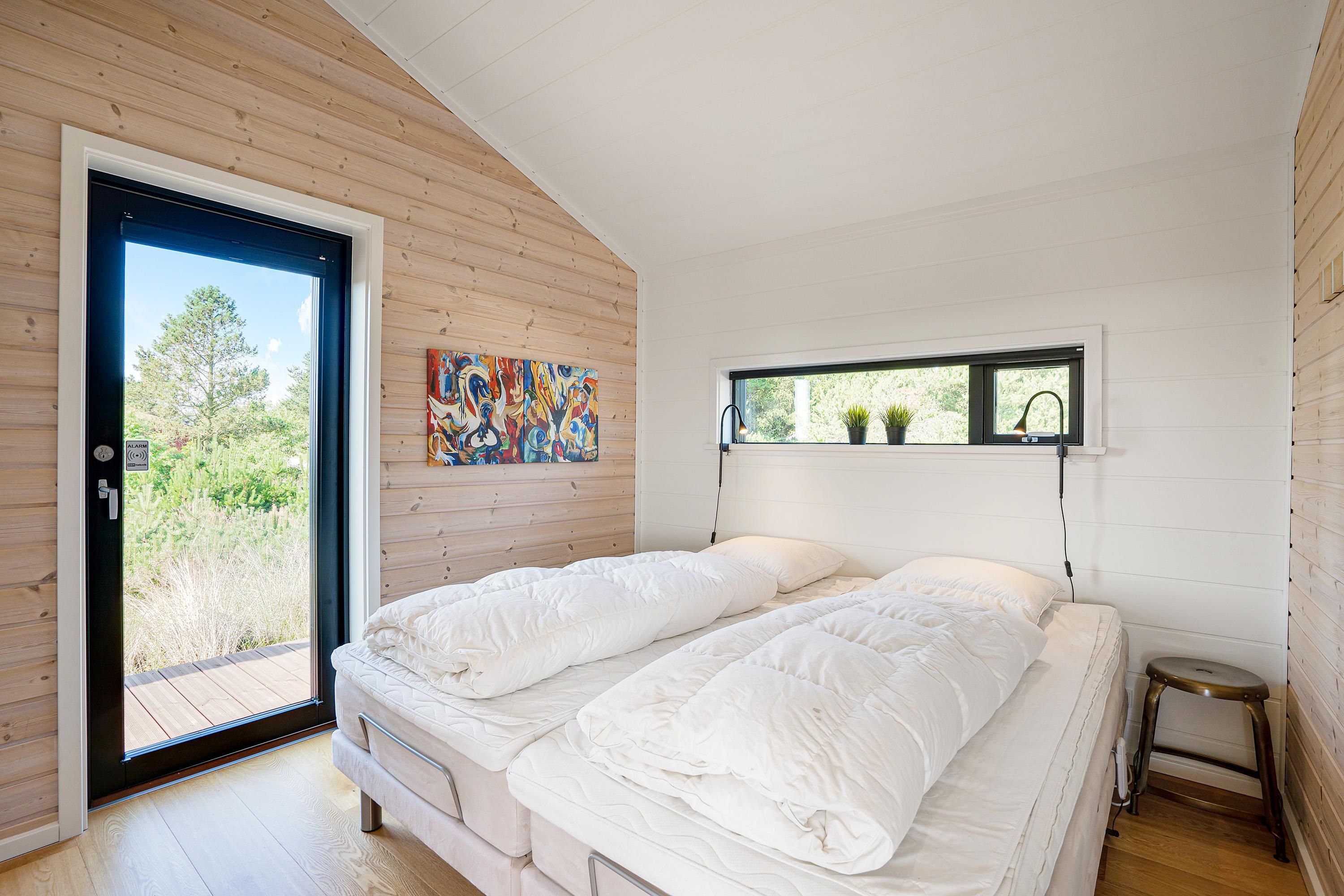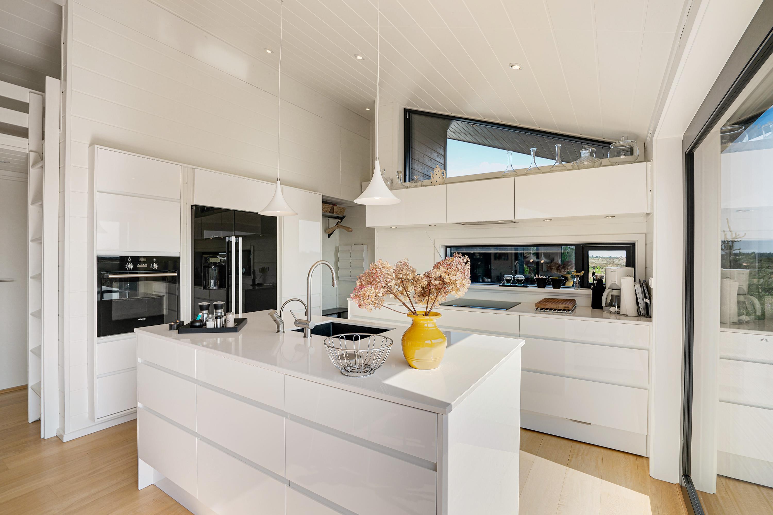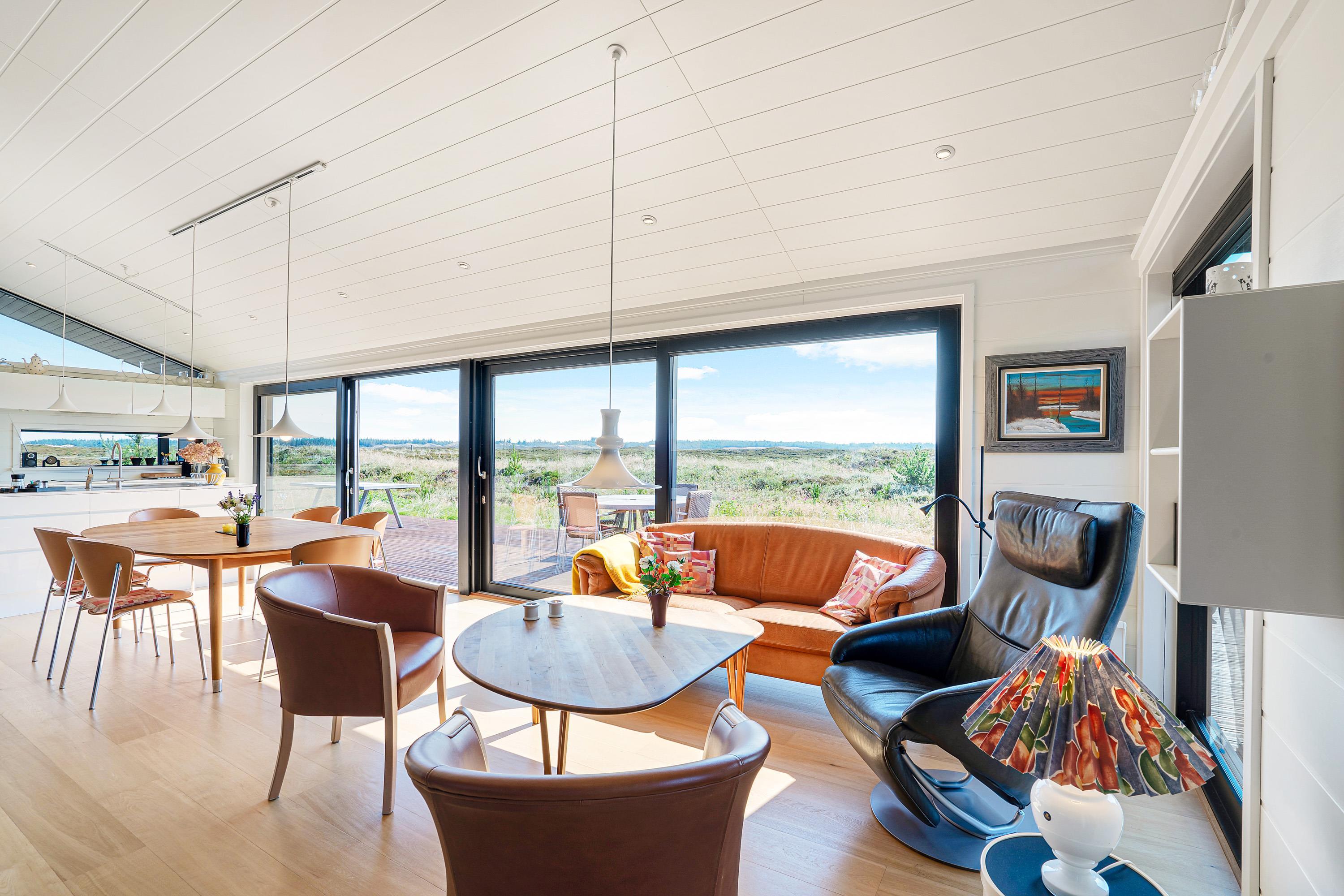 The kitchen, living room and dining area are in one large space, allowing the whole family to stay together whether you're preparing the next meal or relaxing comfortably on the sofa. From the main area, you have access to the adjoining terrace, where you can enjoy the morning's first rays of sunshine with a fresh cup of coffee while listening to birdsong. The view over the vast heathland is uniquely beautiful, especially in late summer when everything is in bloom!