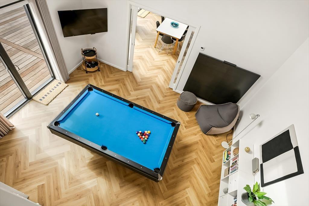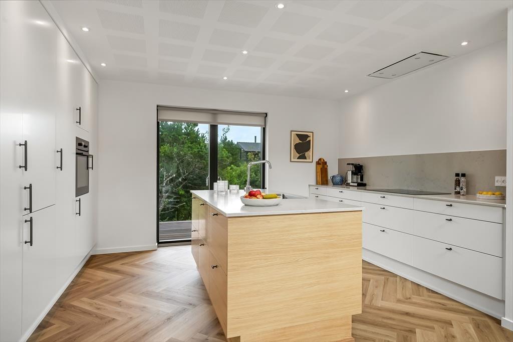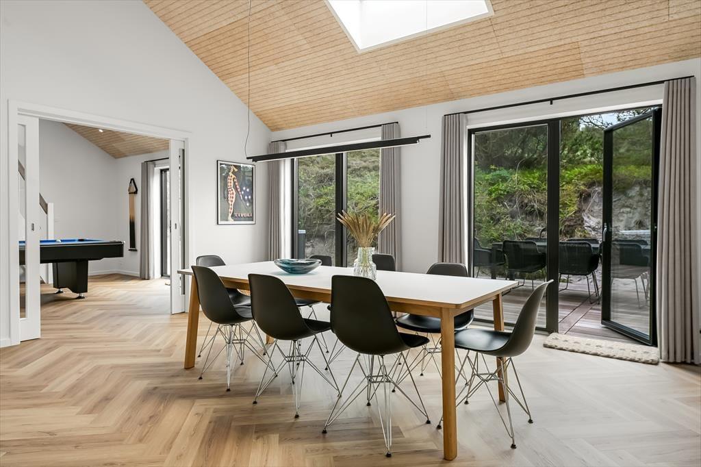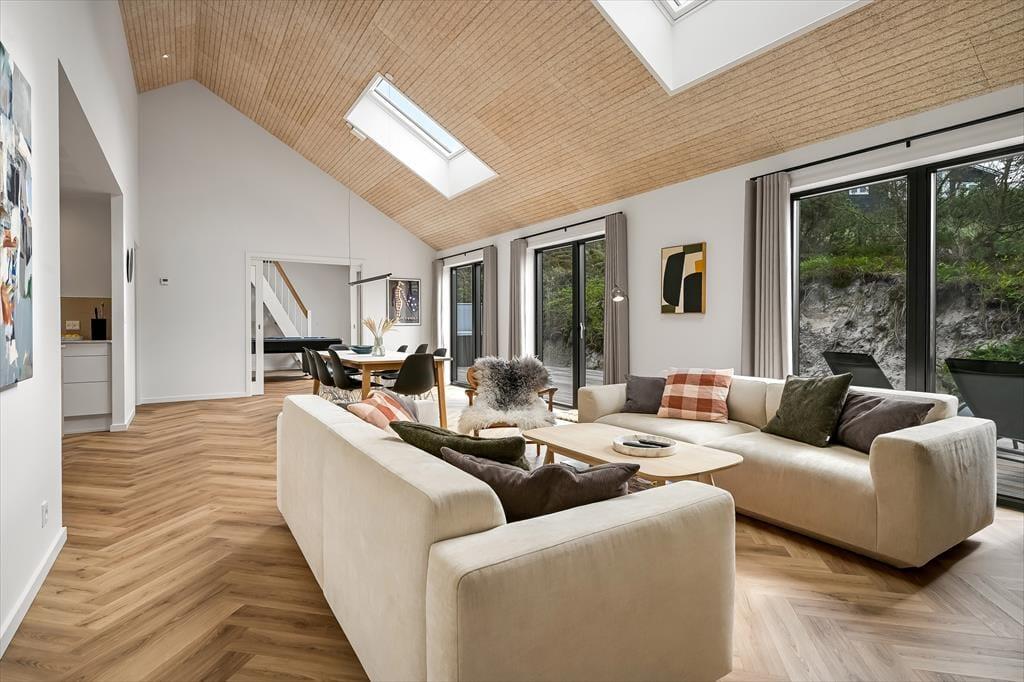 Beim Betreten des Ferienhauses wirst du von einer hellen und einladenden Einrichtung empfangen, die sofort Urlaubsstimmung aufkommen lässt. Hier kannst du dich im gemütlichen Wohnraum versammeln, wo die großen Fenster viel Tageslicht hereinlassen und eine offene Verbindung zur Natur draußen schaffen. Die Küche ist offen mit dem Essbereich verbunden, sodass ihr gemeinsam kochen oder bei einer Tasse Kaffee und einem guten Gespräch zusammensitzen könnt, während das Essen vor sich hin köchelt. Die Einrichtung ist auf Entspannung ausgerichtet – egal, ob du dich mit einem Buch zurücklehnen, mit der Familie Brettspiele spielen oder einfach die Gedanken schweifen lassen möchtest. Hier ist Platz für geselliges Beisammensein ebenso wie für kleine stille Momente, in denen sich Ruhe breitmacht.