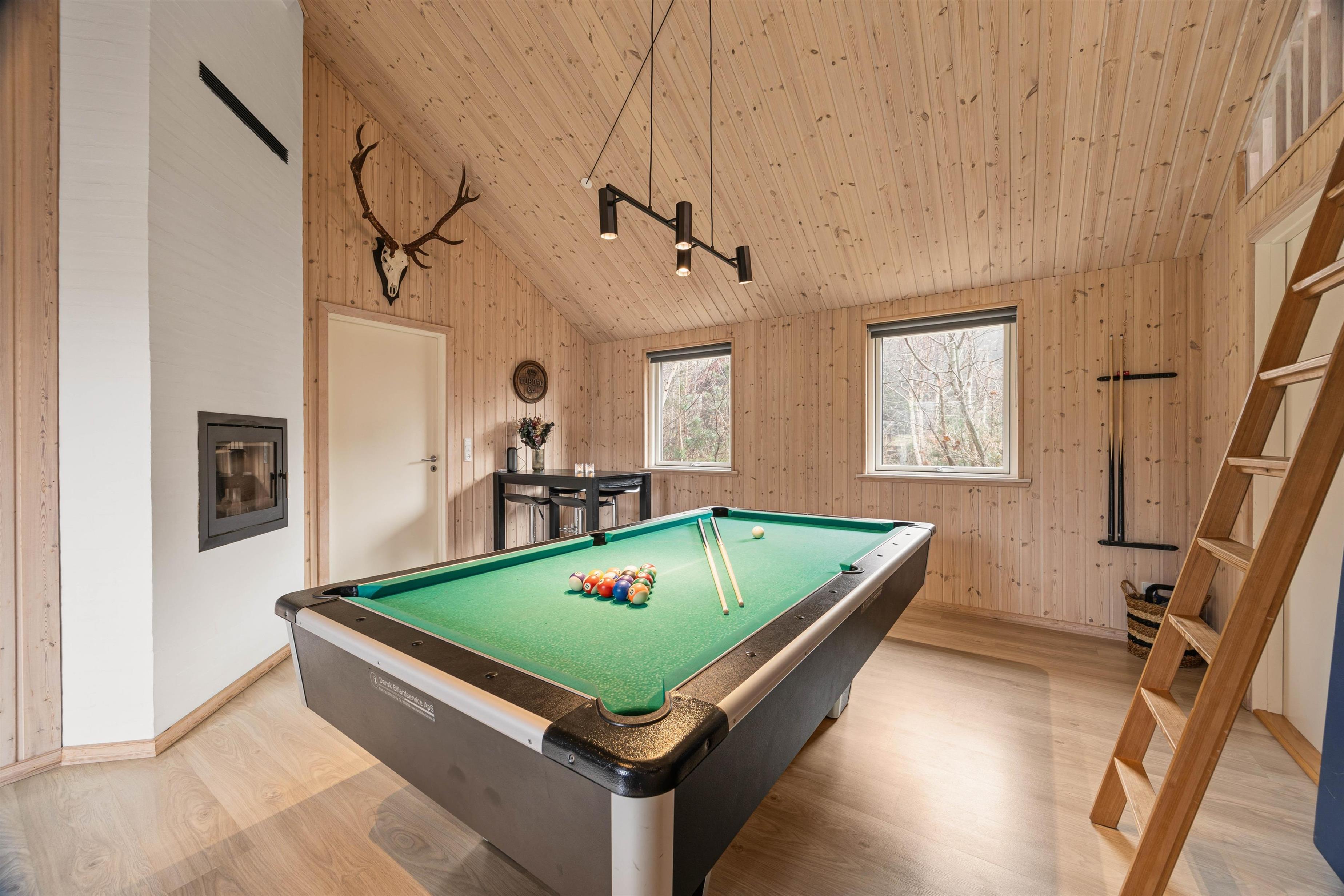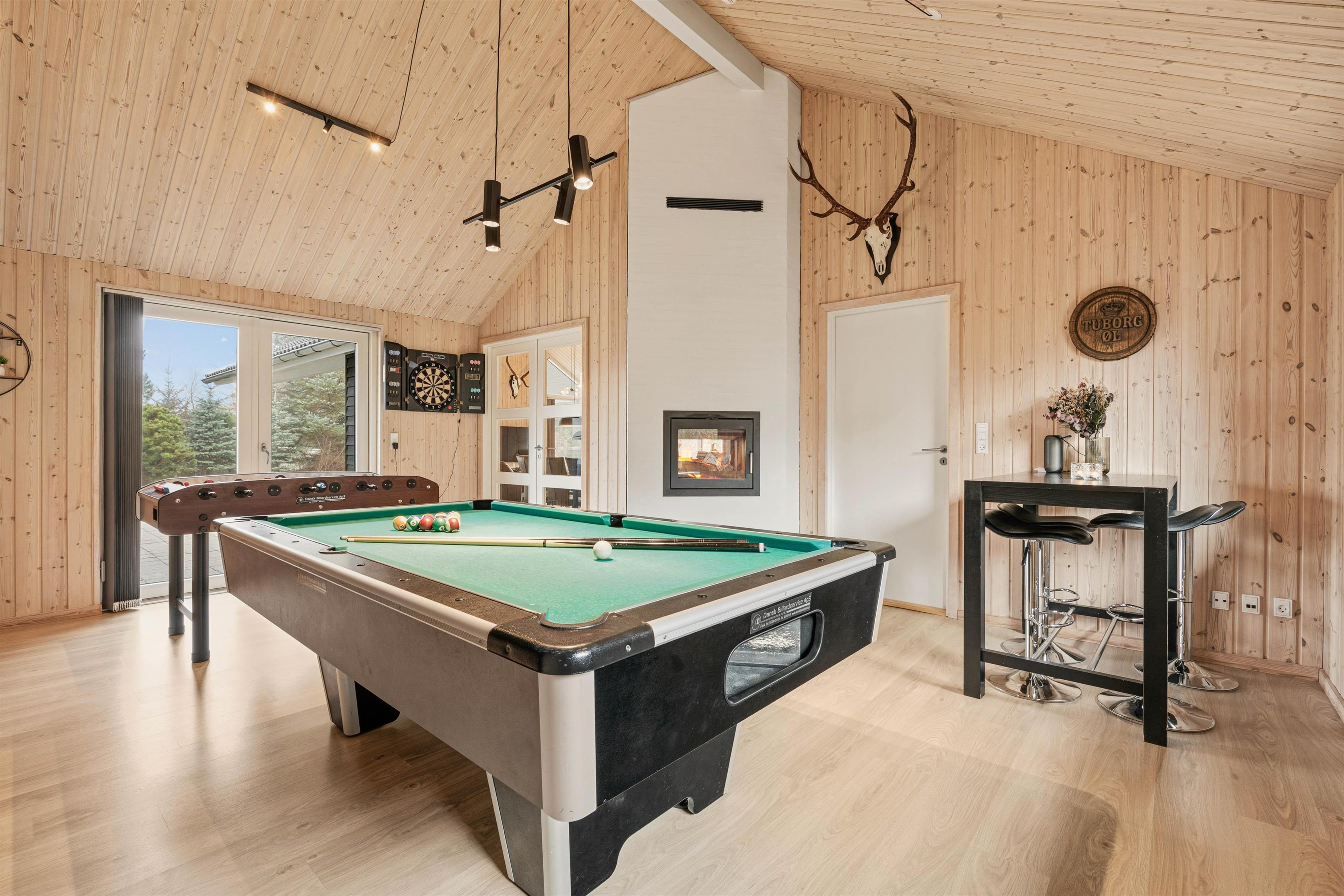 Extensive games room with pool table, table tennis, table football and darts