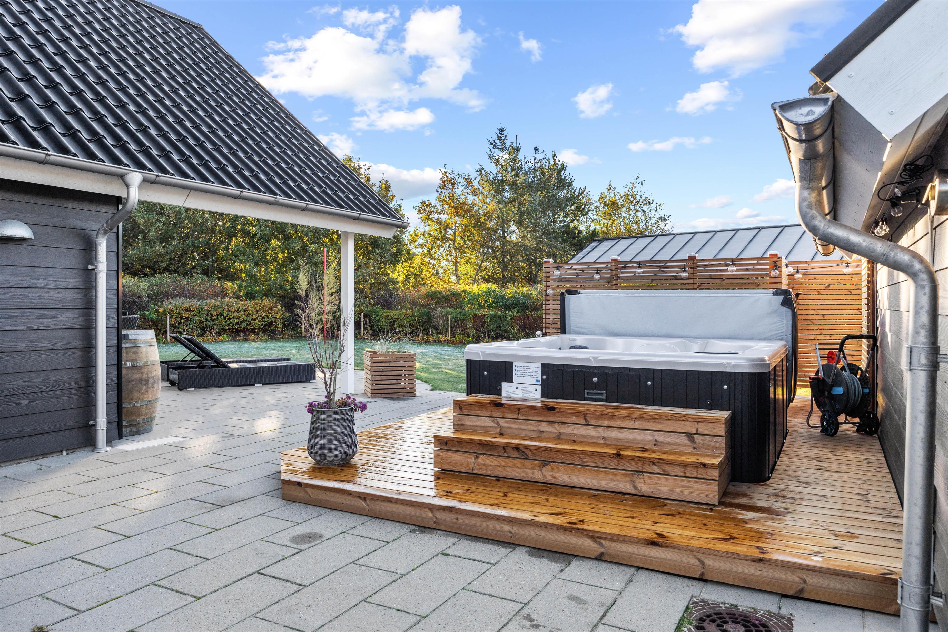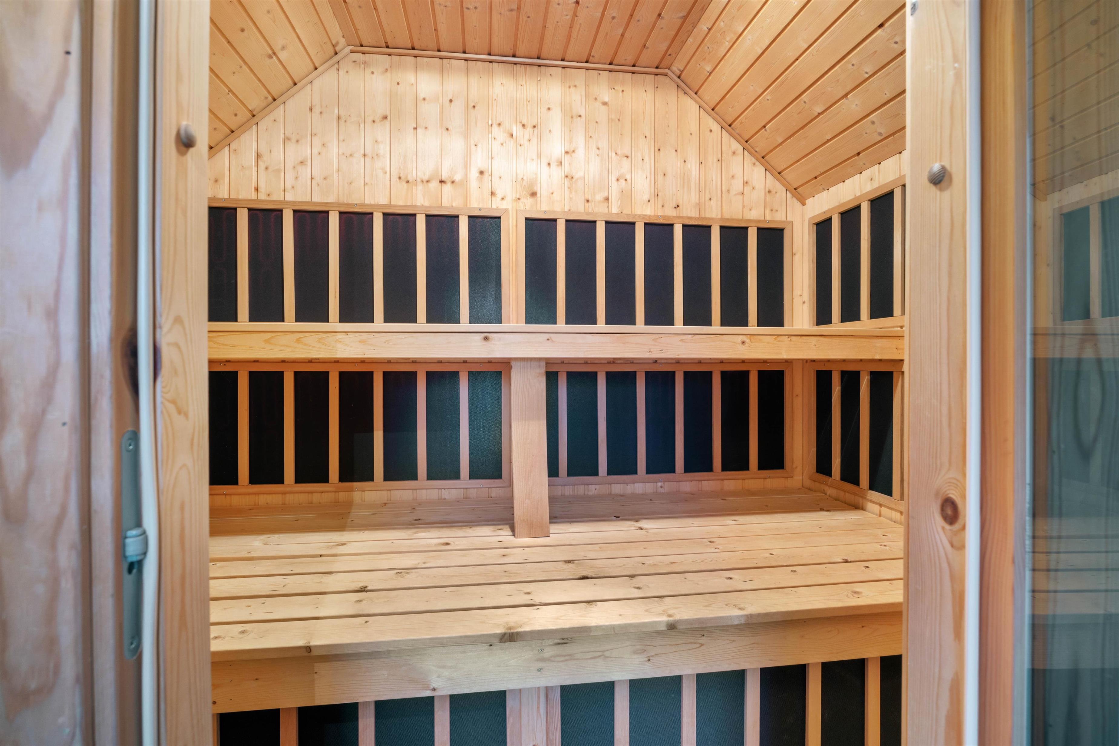 The outdoor area offers plenty of relaxation opportunities. You'll find a six-person hot tub and an infrared sauna in the sauna house, which extends from the terrace.