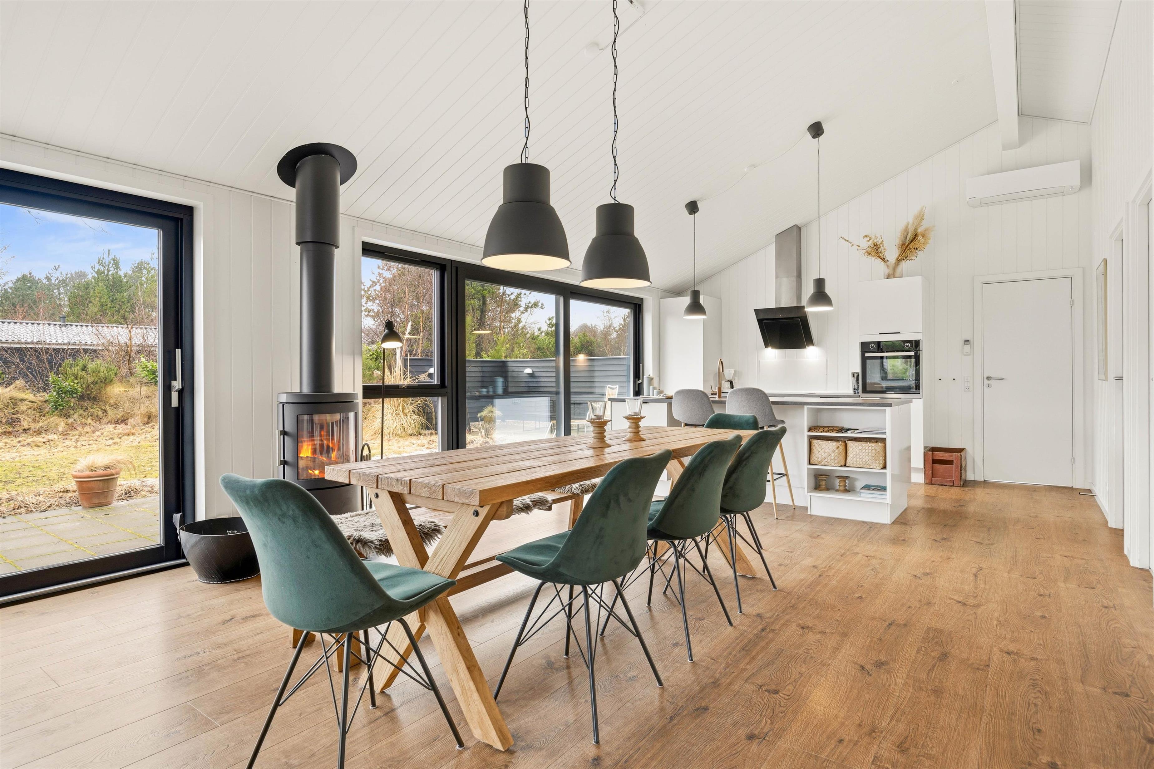 The accommodation comprises 2 bathrooms with underfloor heating, a sauna, 4 bedrooms and a spacious open-plan living and dining area with integrated kitchen. The holiday home also features a wood-burning stove for cosy evenings and an energy-efficient heat pump.