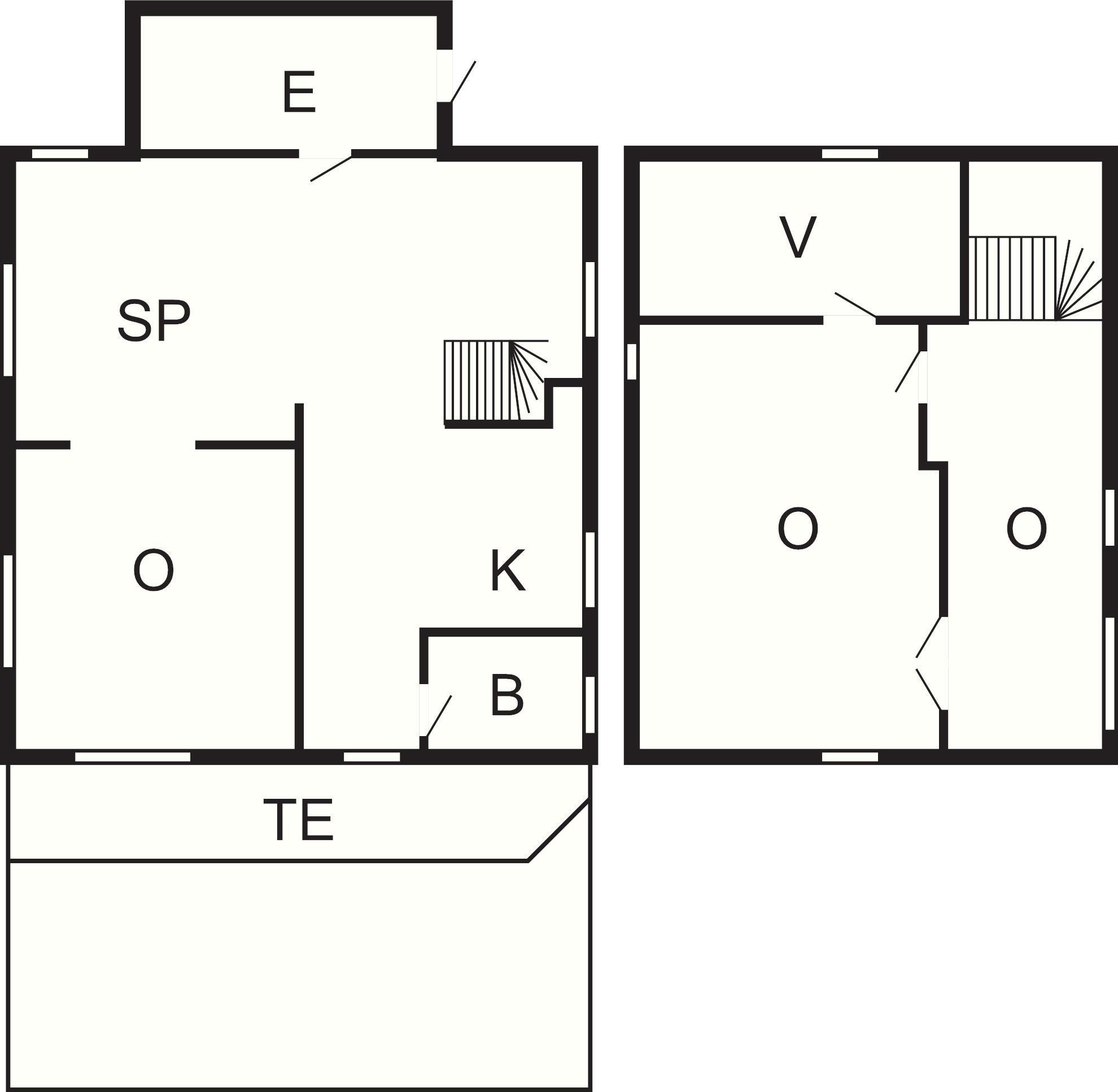 Der er en vindeltrappe op til første sal. Her er der en stue med udkig til marker og havet og der to opholdsrum med sovepladser i begge samt et soveværelse i gavlen.