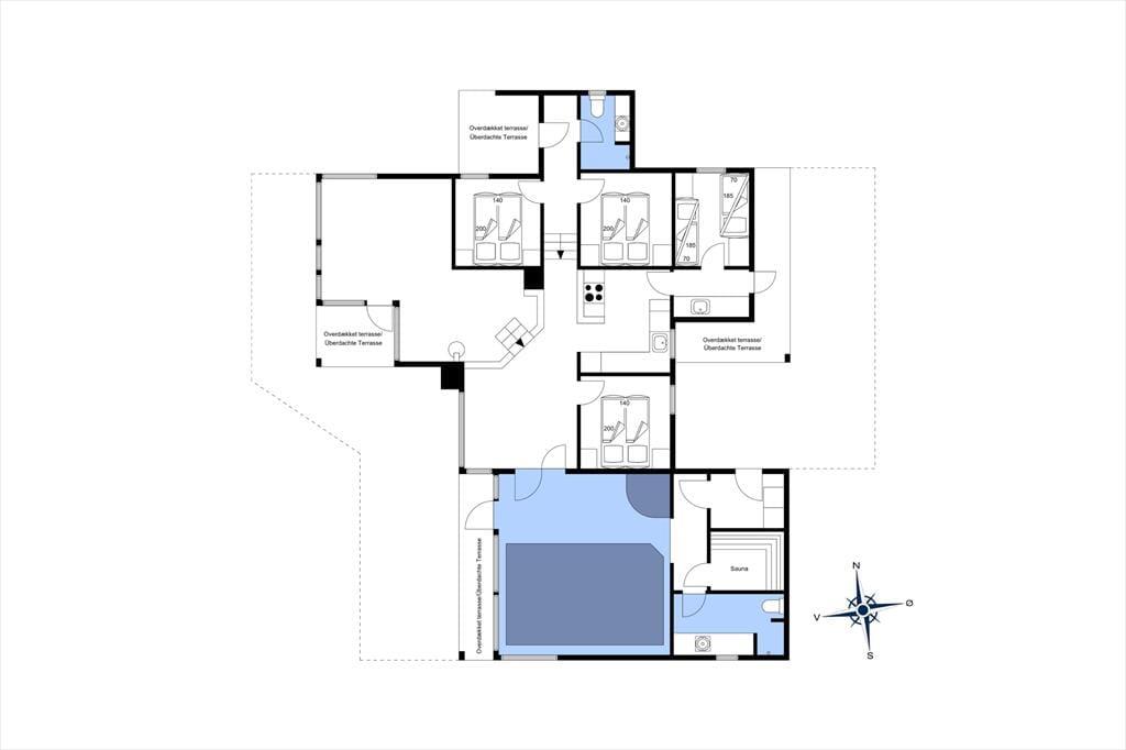 Dieses schöne Sommerhaus liegt erhöht. Der Zugang erfolgt über eine steile Zufahrt, dafür kannst du sowohl vom Grundstück als auch vom Haus aus den Blick über Dünen und die Nordsee genießen. Es gibt 10 Schlafplätze, verteilt auf vier Schlafzimmer, sowie zwei Badezimmer – ideal für eine große oder zwei kleinere Familien, die hier gemeinsam Urlaub machen möchten. Das Ferienhaus ist in versetzten Ebenen gebaut: Küche und Essbereich liegen ein paar Stufen höher als das Wohnzimmer, das mit einem schönen Kaminofen, TV und gemütlichen Sofas zum Entspannen einlädt. In Verlängerung des Essbereichs befindet sich der Poolbereich, und mit Waschmaschine und Trockner ist stets für saubere und trockene Handtücher nach dem Badevergnügen gesorgt.