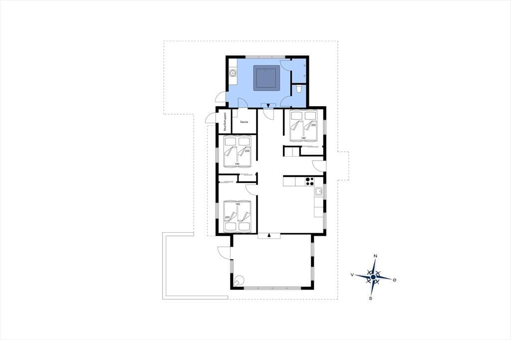 Im hinteren Teil des Ferienhauses befindet sich der wunderbare Spa-Bereich mit einem großen Whirlpool für fünf Personen. Da sich das Becken im Inneren befindet, kann es das ganze Jahr über genutzt werden. Stell dir vor, wie du nach einem langen Tag am Strand oder im Wald im warmen Wasser sitzt und den Blick auf die schöne Natur vor der Tür genießt. Duschen und Sauna sind ebenfalls Teil des Raumes, und von hier aus hat man Zugang zu diesem Teil der Terrasse.