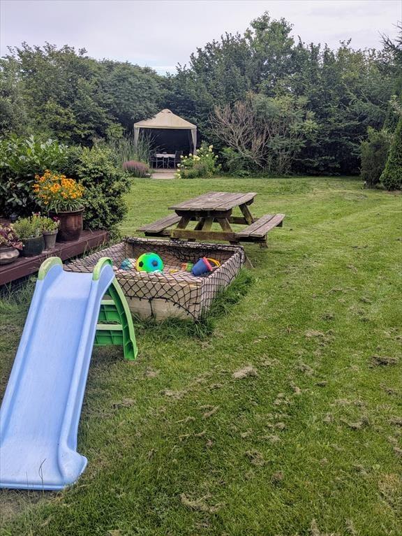 Diese Unterkunft hat eine Fläche von 50 m² und befindet sich auf einem 800 m² Grundstück, u.a. mit Schaukel, Sandkasten und Trampolin.
