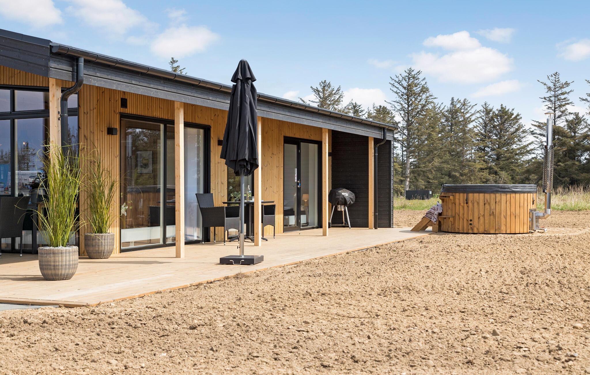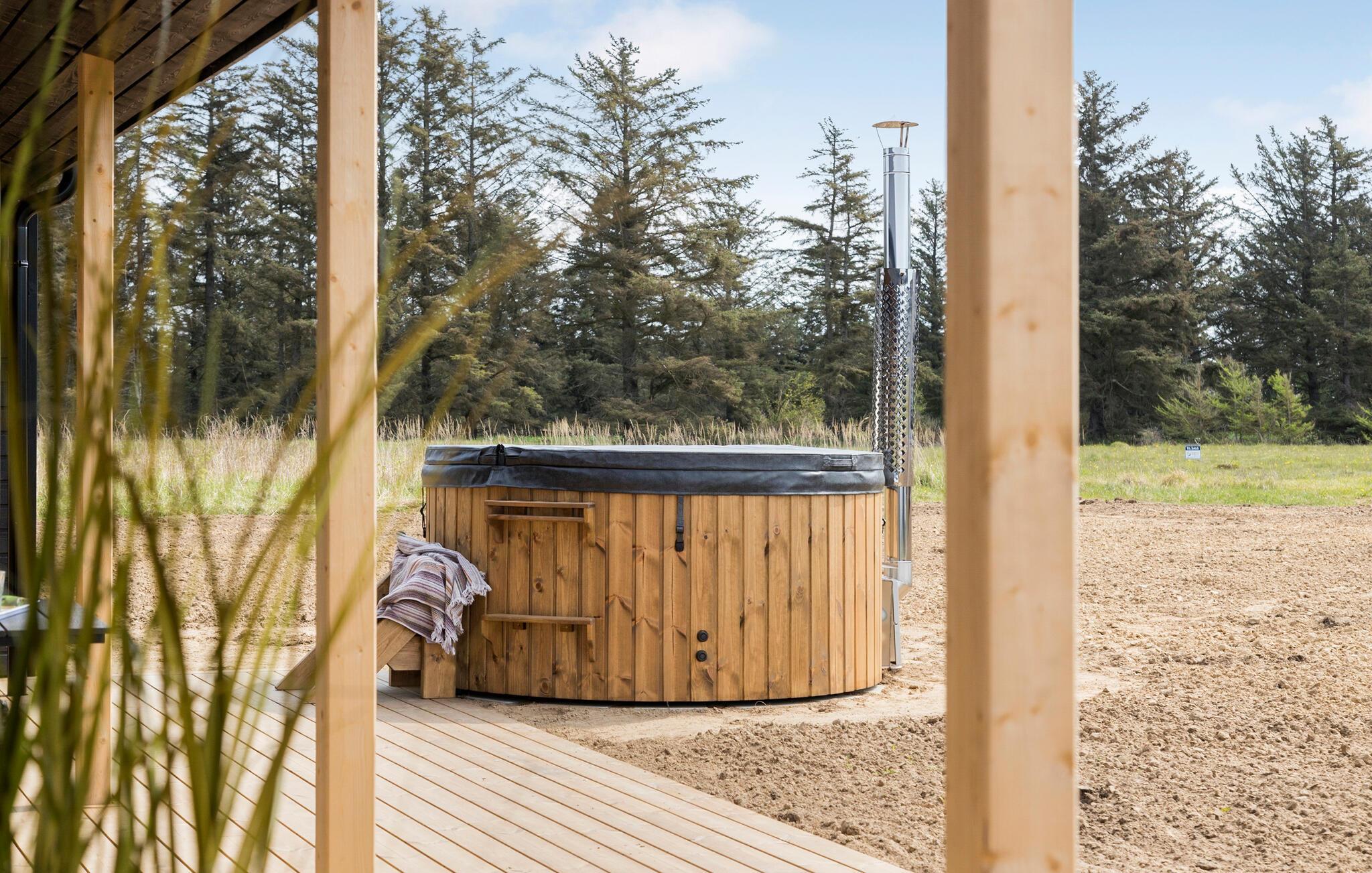Utenfor inviterer boblebadet deg til å slappe av i friluft. Den romslige terrassen byr også på en rekke avslapningsmuligheter. Her finner du komfortable solsenger og et spisebord hvor du kan nyte måltidene dine utendørs.