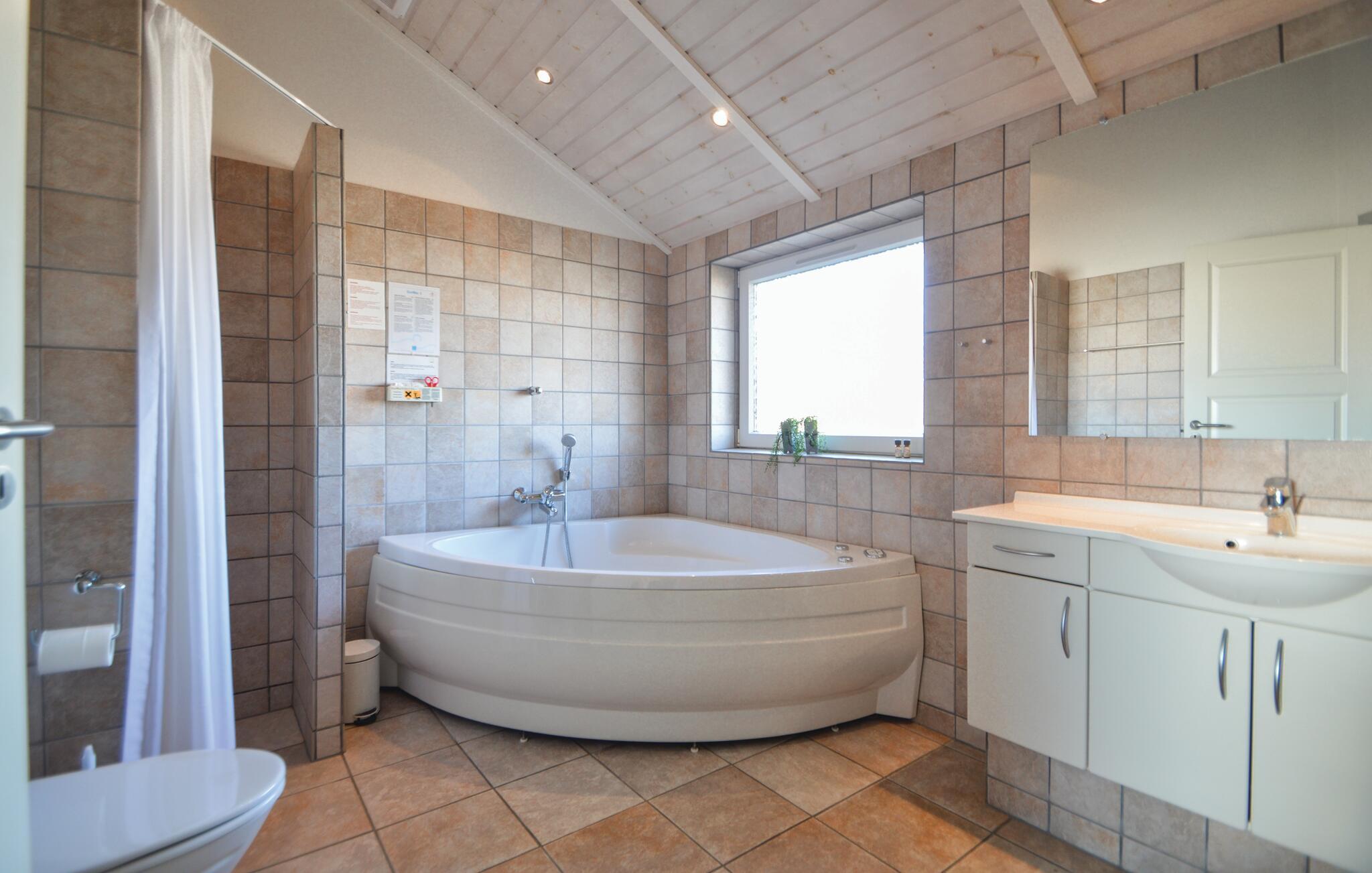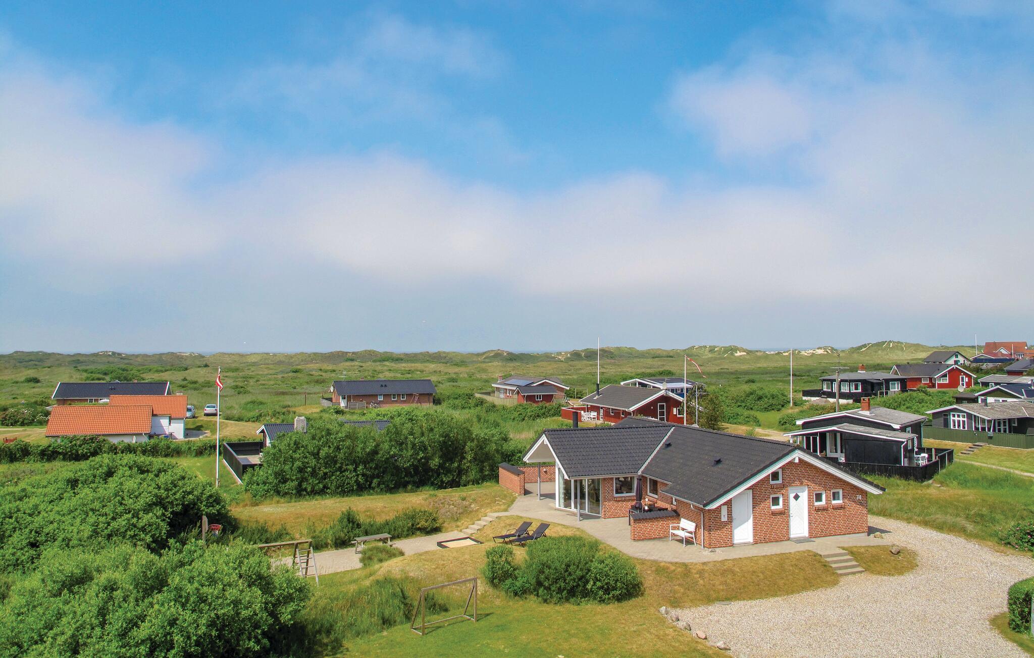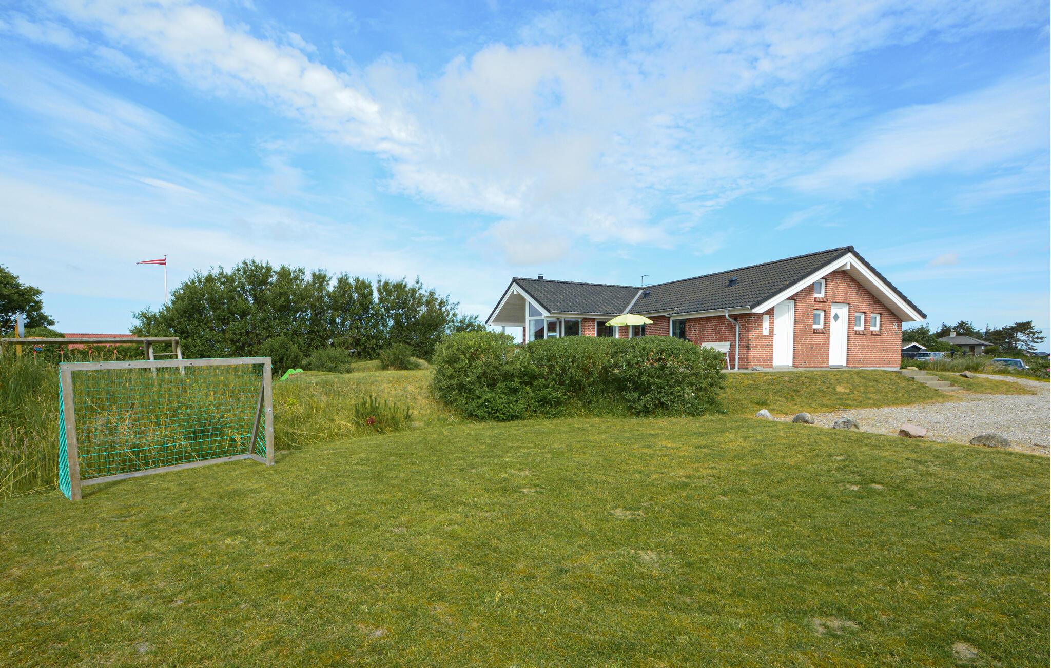 Dette stilfulle luksushuset ligger på en naturtomt i nærheten av Lakolk-stranden og kjøpesenteret, og ble bygget som et energisparende hus med bare de beste materialene. Det er ideelt for to familier og tilbyr all tenkelig komfort, inkludert en ekstra TV på soveloftet og to luksuriøse bad - ett med boblebad og badstue. Det er ingen trapper eller dørstokker. En stor, vakker og delvis inngjerdet terrasse omgir huset på tre sider. Det er god plass til å leke på den store eiendommen til tross for at terrassen ligger mellom sanddynene. Besøk dette vakre området i Danmark og nyt fred og avslapning!