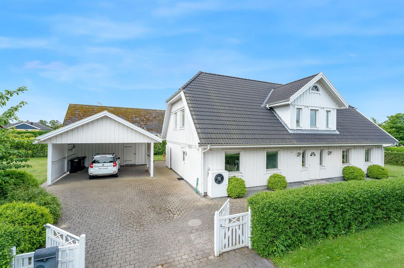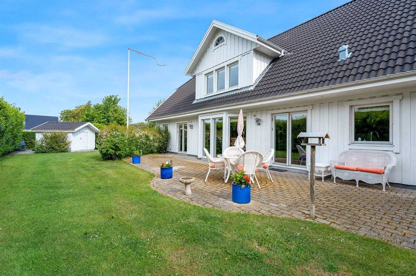 Ferieboligen er beliggende på en 1067 m² stor anlagt have. Avstand til hav er 300 m. Nærmeste butikk ligger i en avstand på 7000 m. Til ferieboligen hører åpent terrasseareal. Det er carport til rådighet. P-plass ved huset.