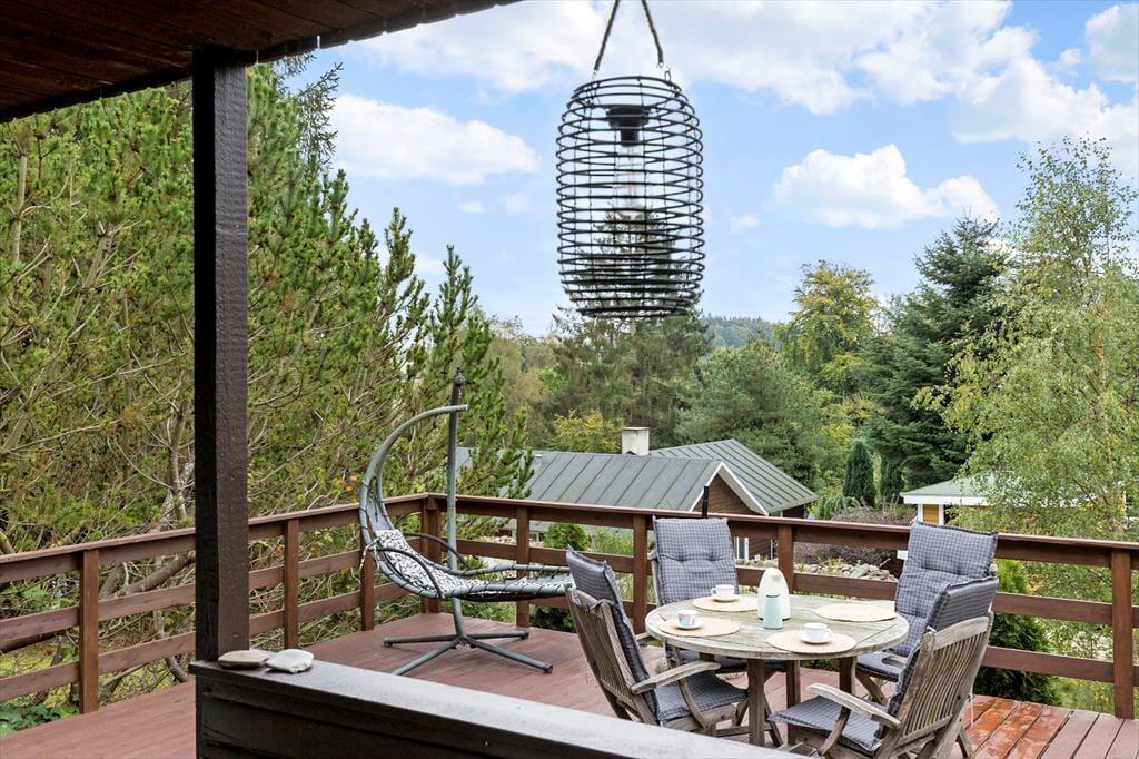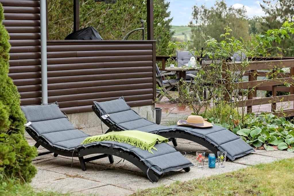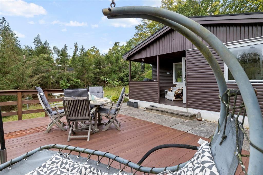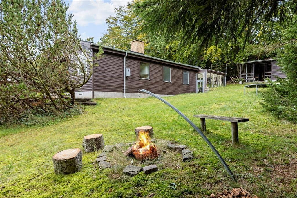 Dein Ferienhaus liegt auf einem schönen Naturgrundstück mit einer großen Rasenfläche, die reichlich Platz zum Erholen und Spielen bietet. Die Feuerstelle lädt zu stimmungsvollen Abenden mit gerösteten Stockbroten und Ausblicken auf den Sternenhimmel ein. Besonders die kleinen Urlauber werden vom Trampolin begeistert sein. Auf der erhöht gelegenen Terrasse wirst du auf guten Gartenmöbeln mit viel Sonne und einem schönen Ausblick verwöhnt. Lange Urlaubstage rundet ihr am besten mit einem stimmungsvollen Abendessen vom Grill ab. Hinter dem Haus begrüßt dich eine überdachte Terrasse mit einem schönen Tagesbett - perfekt für einen heißen Becher Kaffee im Morgengrauen oder das ein oder andere kleine Nickerchen an der frischen Luft.
