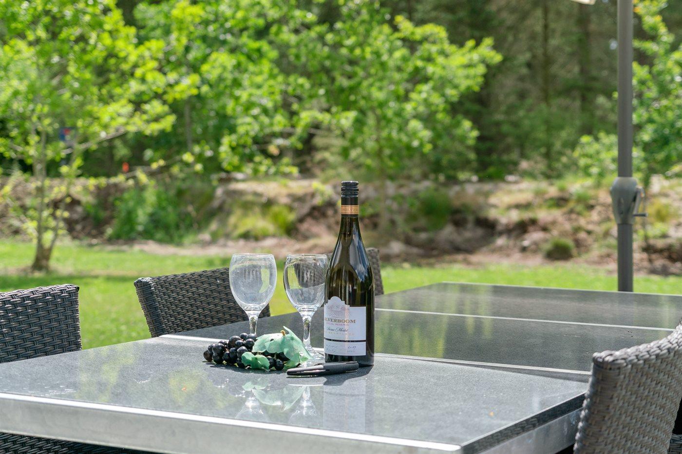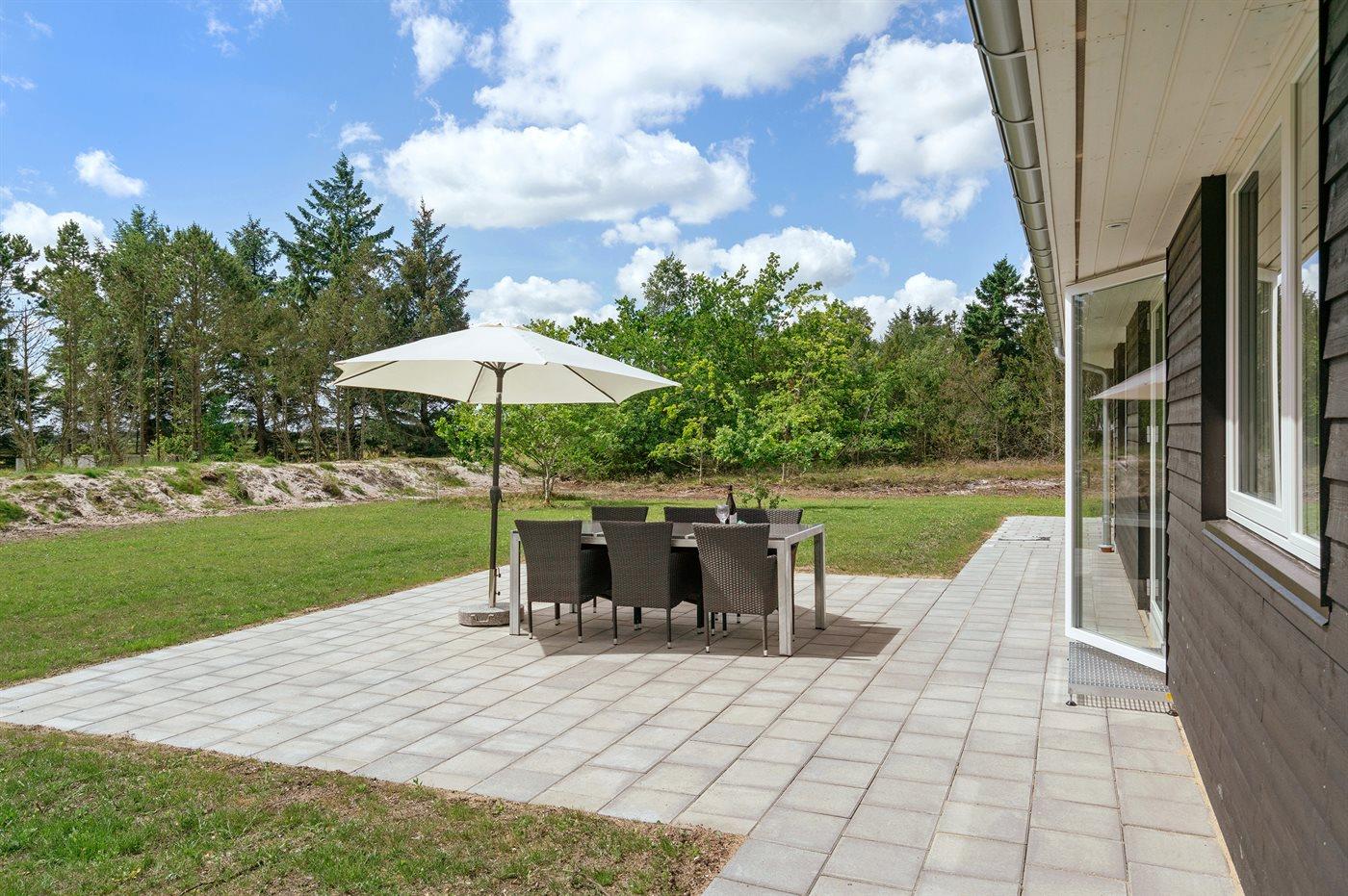 Ferieboligen er beliggende på en 3029 m² stor naturtomt. Avstand til hav er 250 m. Nærmeste butikk ligger i en avstand på 2500 m. Til ferieboligen hører 36 m² terrasseareal. I tillegg er det 27 m² overdekket terrasse. Det er carport til rådighet. P-plass ved huset.