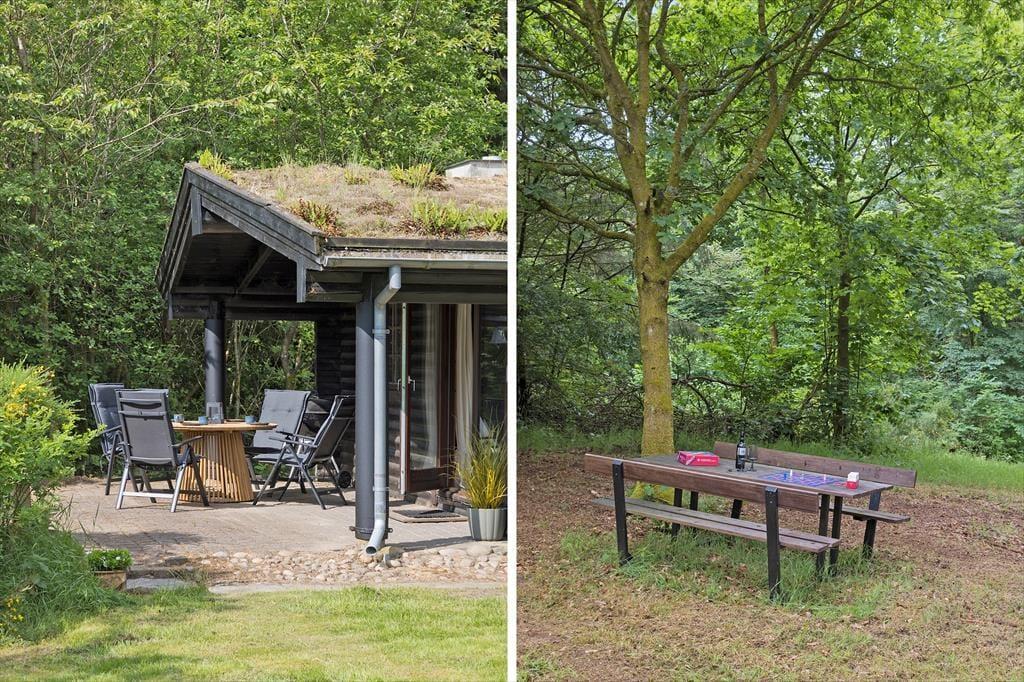 Vom Ferienhaus aus blickst du direkt ins Grüne – doch wenn das Wetter sonnig und sommerlich ist, bietet es sich natürlich an, das Urlaubsleben vollständig nach draußen zu verlegen, um alle Sinne anzusprechen. Lausche dem Vogelgesang aus den Baumwipfeln und spüre die Sonne auf deiner Haut, während du auf der Terrasse eine duftende Tasse Kaffee oder ein erfrischendes Eis genießt. Angrenzend an das Wohnzimmer gibt es eine teilweise überdachte Terrasse, die schnell zum Lieblingsplatz wird, falls du dich nicht gleich in die Sitzgruppe im Schatten der Laubbäume verliebst. Und dann ist da natürlich noch das Wildnisbad, das im Abenddunkel besonders reizvoll ist – es gibt kaum etwas Erholsameres als ein heißes Bad unter dem funkelnden Sternenhimmel.