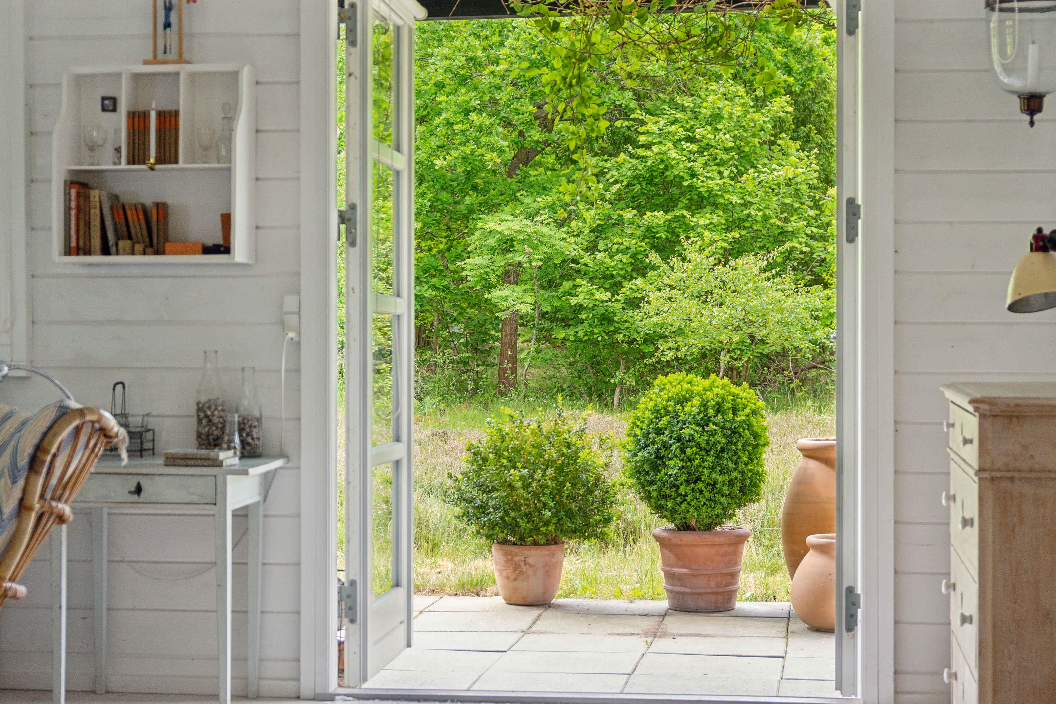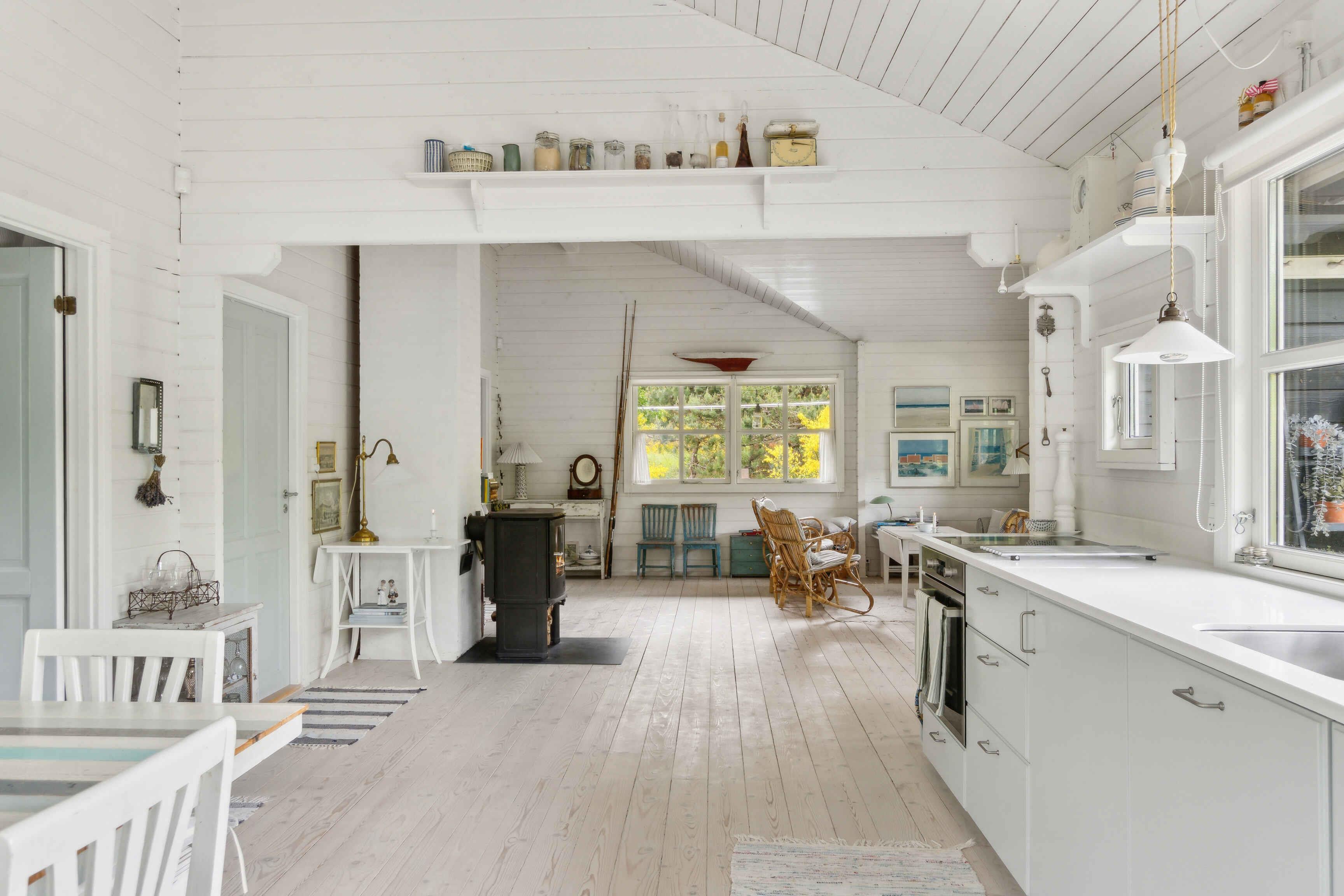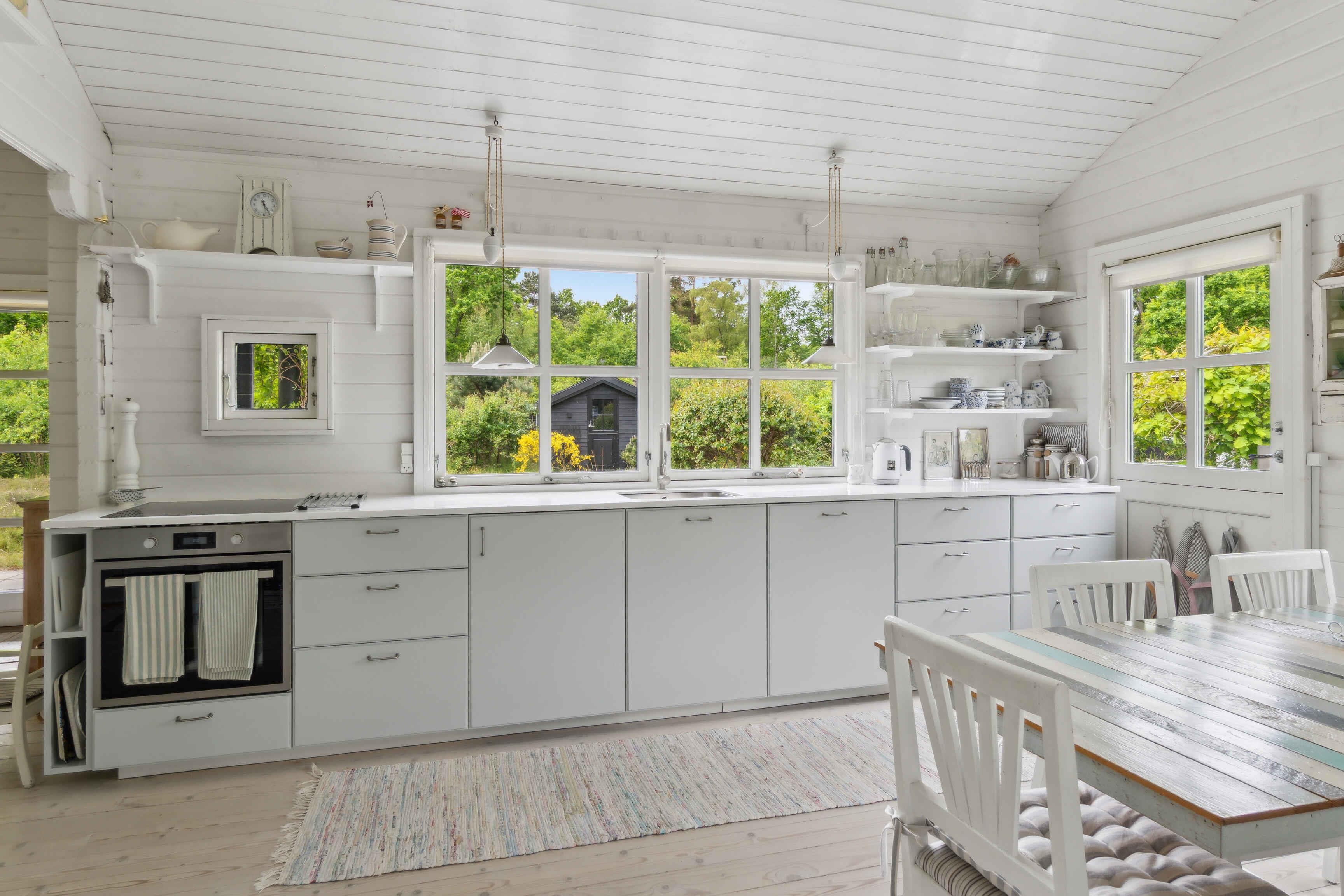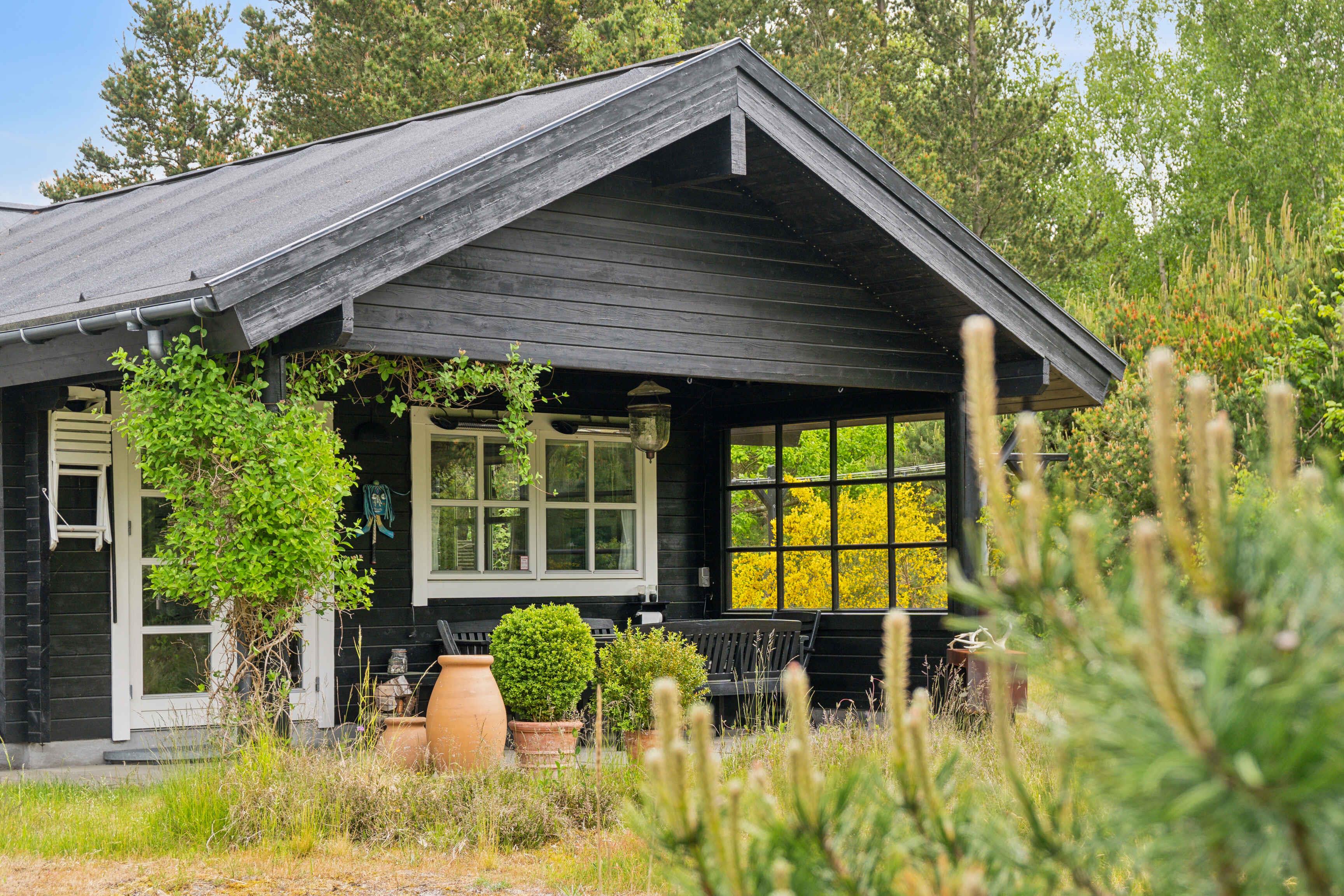 Charming holiday home 300 m from a private beach with garden furniture and a pier. The house features a large kitchen, wood stove, outdoor shower, and an outdoor kitchen with a gas stove and BBQ. Lovely terrace and multiple bedrooms.