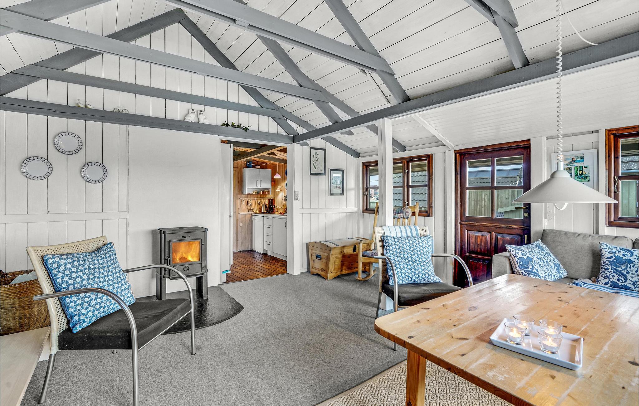 Feriehuset i Rindby er åpent og innbydende og er klassisk innredet. Her kan du nyte den sjarmerende atmosfæren og det behagelige lyset som kommer inn gjennom de sprossede vinduene, mens du varmer deg foran vedovnen etter en lang spasertur. På det romslige kjøkkenet er det god plass til kulinariske prosjekter, mens barna kan hygge seg med brettspill eller puslespill ved spisebordet. Huset har også en lukket gårdsplass mellom feriehuset og uthuset.