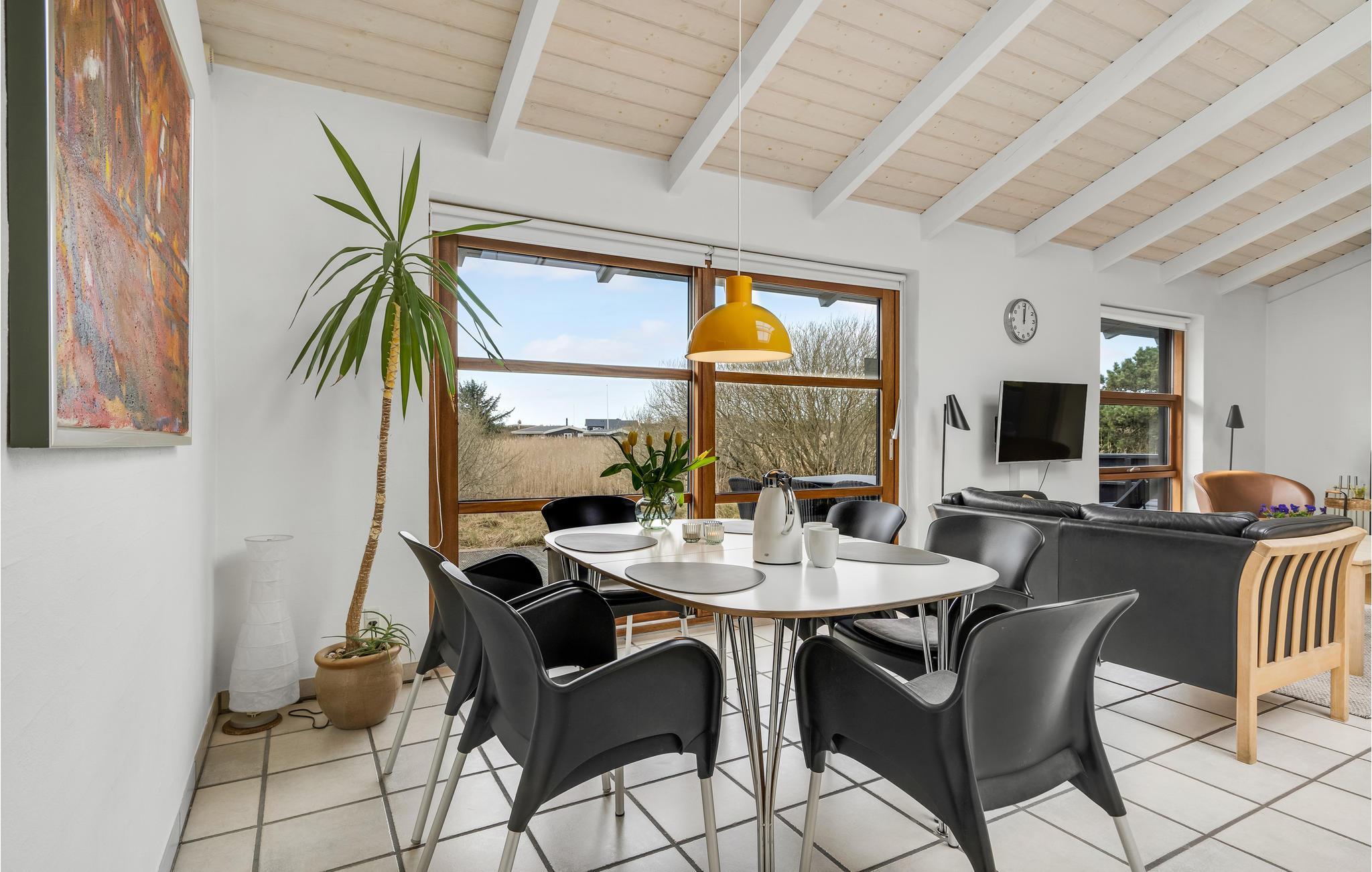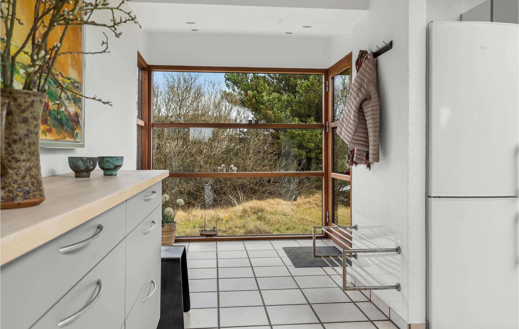 Dette imponerende, arkitekttegnede feriehuset ligger på en vakker, tilbaketrukket naturtomt, bare noen minutters gange fra stranden. Huset er utstyrt med en stor vedovn. Store glassfronter slipper inn rikelig med naturlig lys og skaper en unik atmosfære der hver eneste detalj er nøye gjennomtenkt. Den elegante inngangsportalen leder inn til et åpent, velutstyrt kjøkken, som ligger i direkte tilknytning til en koselig spiseplass. Herfra har du tilgang til den vestvendte terrassen gjennom en stor skyvedør. Dette feriehuset imponerer med sin høye kvalitet og mange gjennomtenkte detaljer.