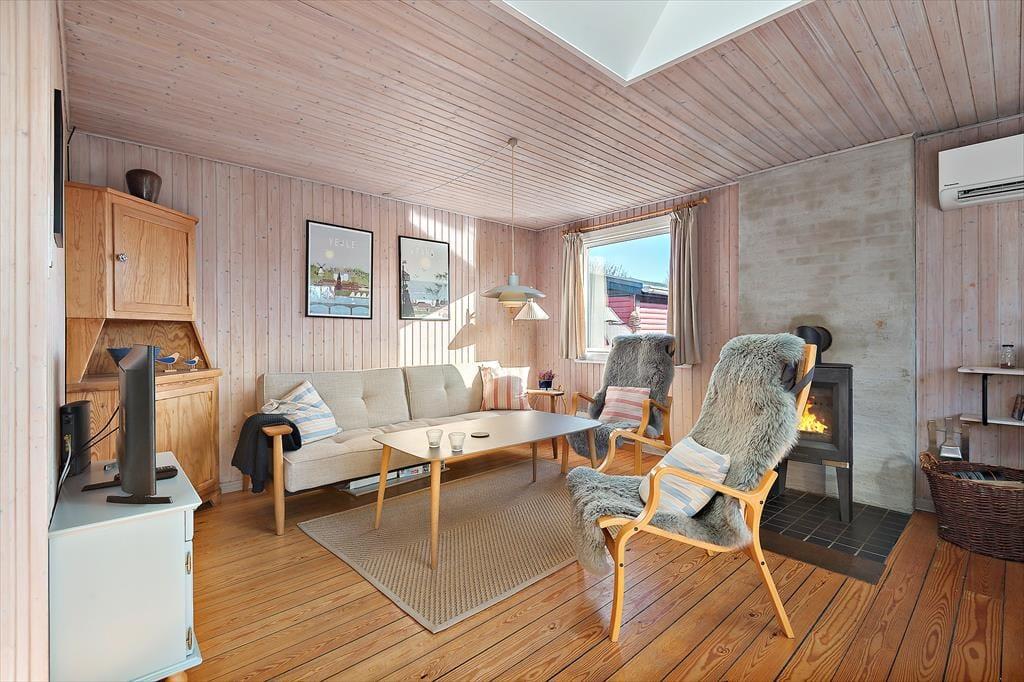Wenn ihr das Haus betretet, werdet ihr von einer warmen und einladenden Atmosphäre empfangen. Die hellen Holzpaneele unterstreichen den klassischen Ferienhausstil. Durch die großen Fenster und Oberlichter strömt Tageslicht in den Wohnbereich und sorgt für ein großzügiges Raumgefühl. Das Wohnzimmer ist mit weichen Möbeln, gemütlichen Sesseln und einem knisternden Kamin ausgestattet, der an kühlen Abenden für eine perfekte Wohlfühlstimmung sorgt. Der Essbereich ist offen mit dem Wohnzimmer verbunden, sodass ihr eure Mahlzeiten gemeinsam am gemütlichen Esstisch genießen könnt. Die Küche ist funktional ausgestattet und bietet alles, was ihr für die Zubereitung eurer Ferienmahlzeiten benötigt – hier könnt ihr euren Morgenkaffee mit Blick auf die Dünen durch das große Fenster genießen. Die zwei Schlafzimmer sind gut eingerichtet mit bequemen Betten und ausreichend Stauraum, während das Badezimmer modern und praktisch mit einer Dusche ausgestattet ist.