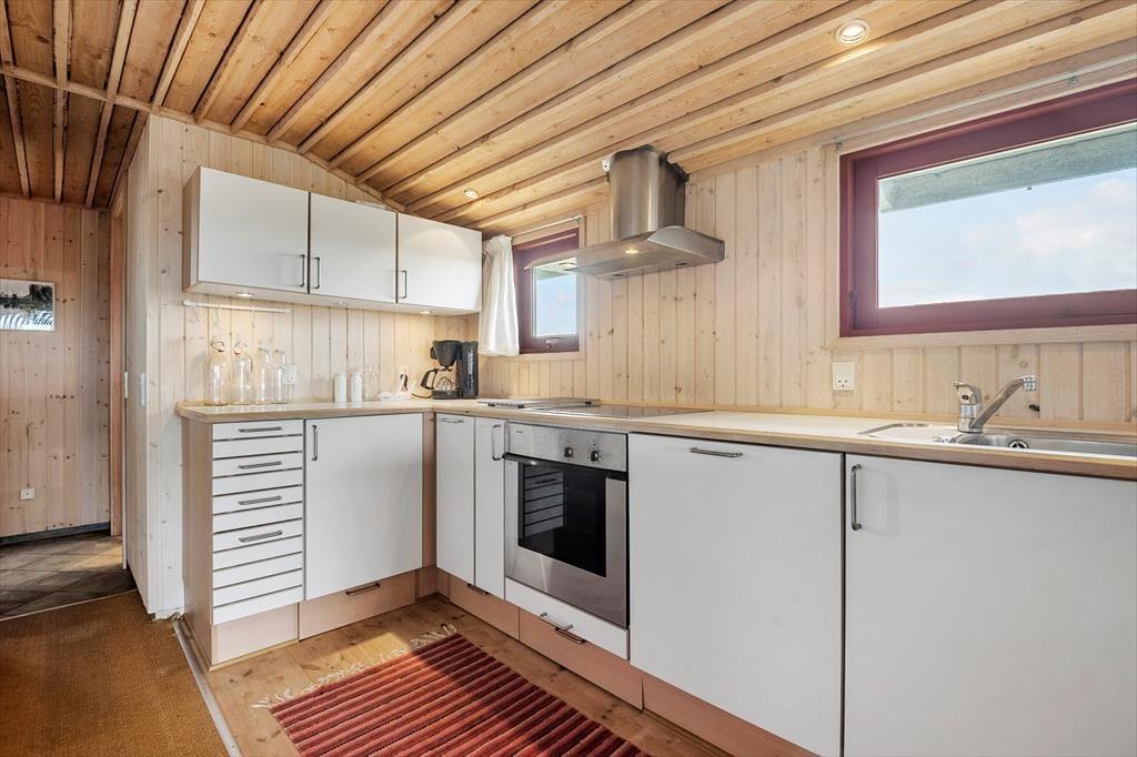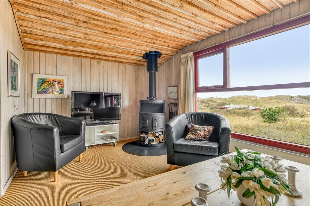 Die versetzten Ebenen verleihen diesem Ferienhaus eine besondere räumliche Tiefe und machen es gleichzeitig gemütlich und interessant. Vom hellen, offenen Küchen- und Wohnbereich führen drei Stufen hinunter zum gemütlichen Essbereich, der leicht abgesenkt in einem eigenen Bereich liegt. Hier könnt ihr eure Mahlzeiten gemeinsam genießen – mit einem fantastischen Blick auf die Dünenlandschaft direkt vor den Fenstern. Die verschiedenen Wohnebenen sorgen für eine angenehme Struktur im Raum und schaffen Bereiche, in denen man zusammen sein und sich trotzdem auch mal zurückziehen kann. Im Wohnzimmer laden bequeme Sitzmöbel zum Entspannen ein, während der Kamin eine behagliche Atmosphäre zaubert. Die Materialwahl und die originalen Details des Hauses tragen zur besonderen Stimmung bei, die typisch ist für die echte dänische Ferienhauskultur.Bitte beachte, dass die Etagenbetten nur 180 cm lang sind. Aufgrund von Stufen und Niveauunterschieden im Haus sowie des Zugangs über Treppen ist das Haus für Personen mit eingeschränkter Mobilität nicht geeignet.