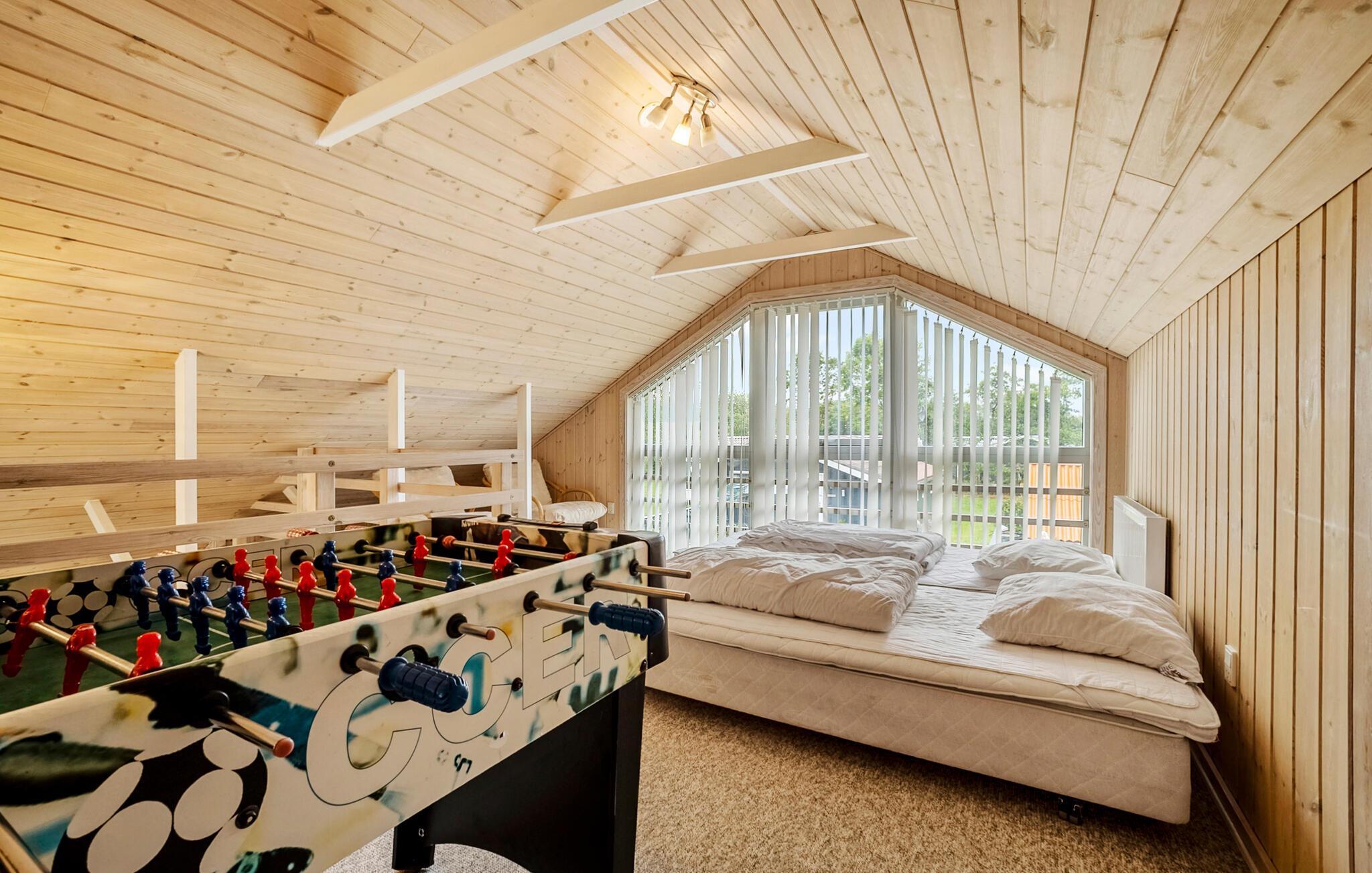 Start dagen avslappet og nyt frokosten i den treaktige atmosfæren i oppholdsrommet. Sett deg godt til rette i sofaene og la blikket vandre gjennom de store vinduene ut i hagen. Tilbered måltider sammen i det åpne kjøkkenet, og sosialiser rundt spisebordet. Slapp av i boblebadet eller lad batteriene i badstuen. Eller trekk deg tilbake til øverste etasje, der et annet oppholdsrom med sofaer og bordfotball innbyr til sosialt samvær.
