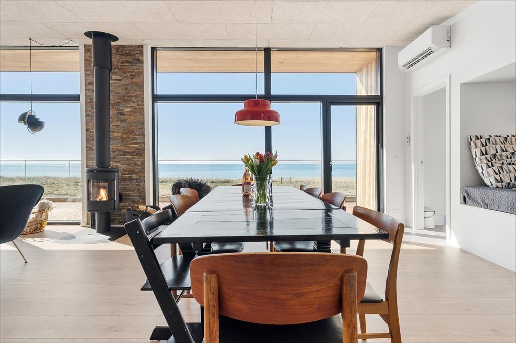 Dieses tolle Ferienhaus aus dem Jahr 2023 begrüßt dich mit einem offen kombinierten Küchen-, Wohn- und Essbereich. Bodentiefe Fenster sorgen im Aufenthaltsbereich für einen herrlichen Tageslichteinfall und eine luftig-leichte Wohnatmosphäre. In der Küche, die unter anderem mit einem Einbaubackofen, einem Kochfeld, einem Geschirrspüler, einem Kühlschrank mit Gefriermöglichkeit, einer Kaffeemaschine und einem Wasserkocher ausgestattet ist, wird die Zubereitung der Mahlzeiten zum gemeinsamen Familienevent. Der Wohnraum begeistert mit einem Zugang zur großen Holzterrasse und mit einem freien Ausblick auf den Großen Belt. Dank des gemütlichen Essplatzes, des Kaminofens, des Sofas und der Lehnstühle verlebst du mit deinen Lieben in diesem Raum zahllose entspannte Stunden. Unterhaltung und Abwechslung verspricht der Smart-TV mit dänischen Sendern und Chromecast. Chromecast ermöglicht dir die Nutzung deiner privat abonnierten Streamingdienste. Oftmals werdet ihr aber einfach nur gemütlich beisammensitzen und den fantastischen Meerblick auf euch wirken lassen. Die beiden Badezimmer des Hauses beinhalten jeweils eine Duschnische und eine Fußbodenheizung. In einem der Bäder stehen darüber hinaus eine Waschmaschine und ein Wäschetrockner bereit. Zwei der vier Schlafräume verwöhnen mit Meerblick. Zwei Schlafräume begrüßen dich mit je einem Doppelbett. Im dritten Raum stehen zwei Einzelbetten zur Verfügung und im vierten triffst du auf zwei Einselbetten, Ein Hochstuhl ist vorhanden. Behagliche Temperaturen garantieren eine Wärmepumpe, der Kaminofen und Elektroheizkörper.