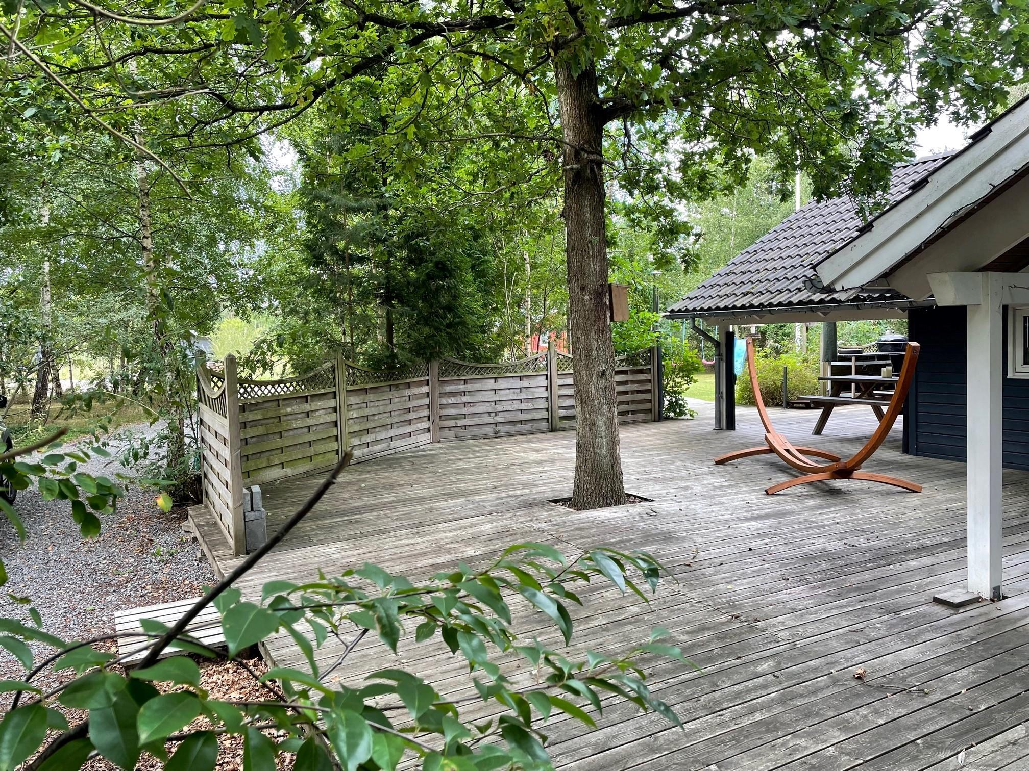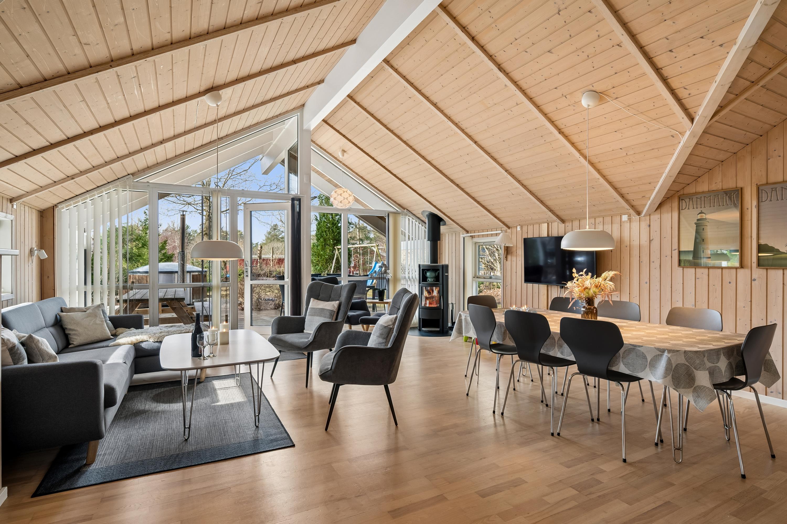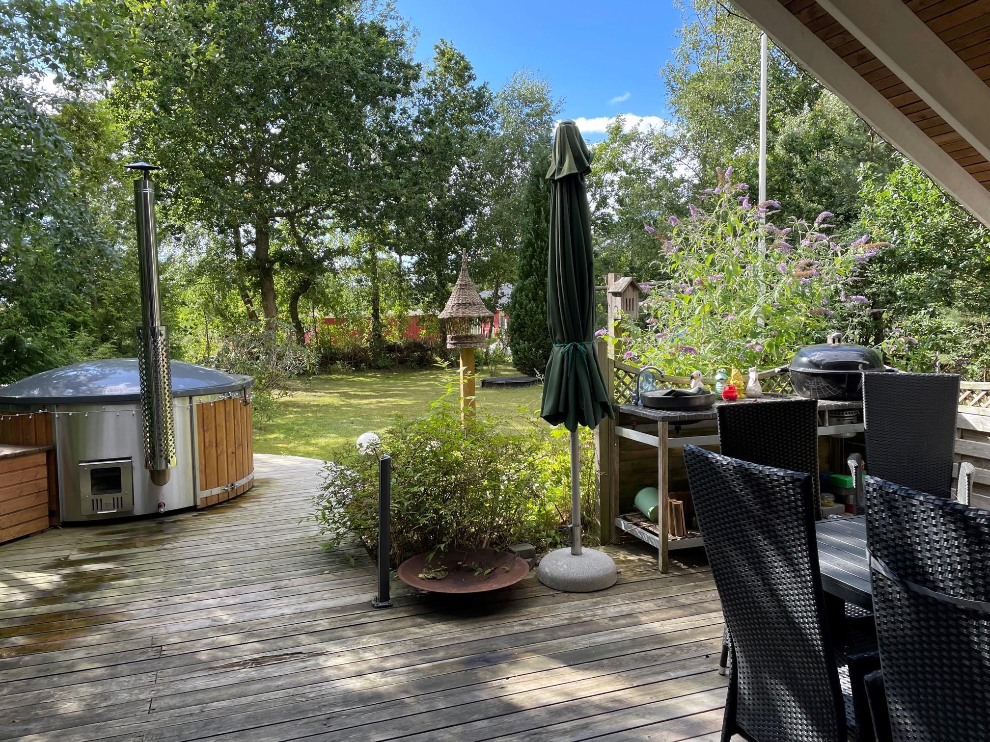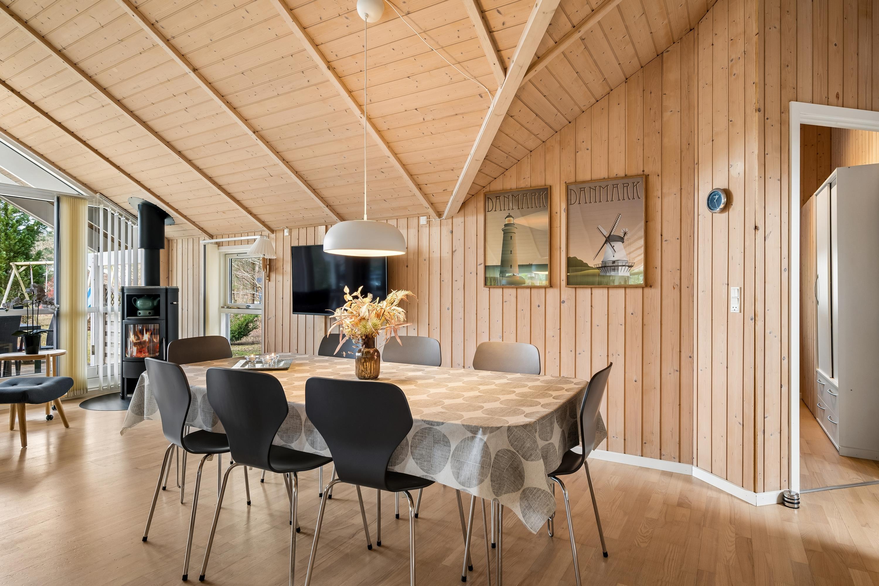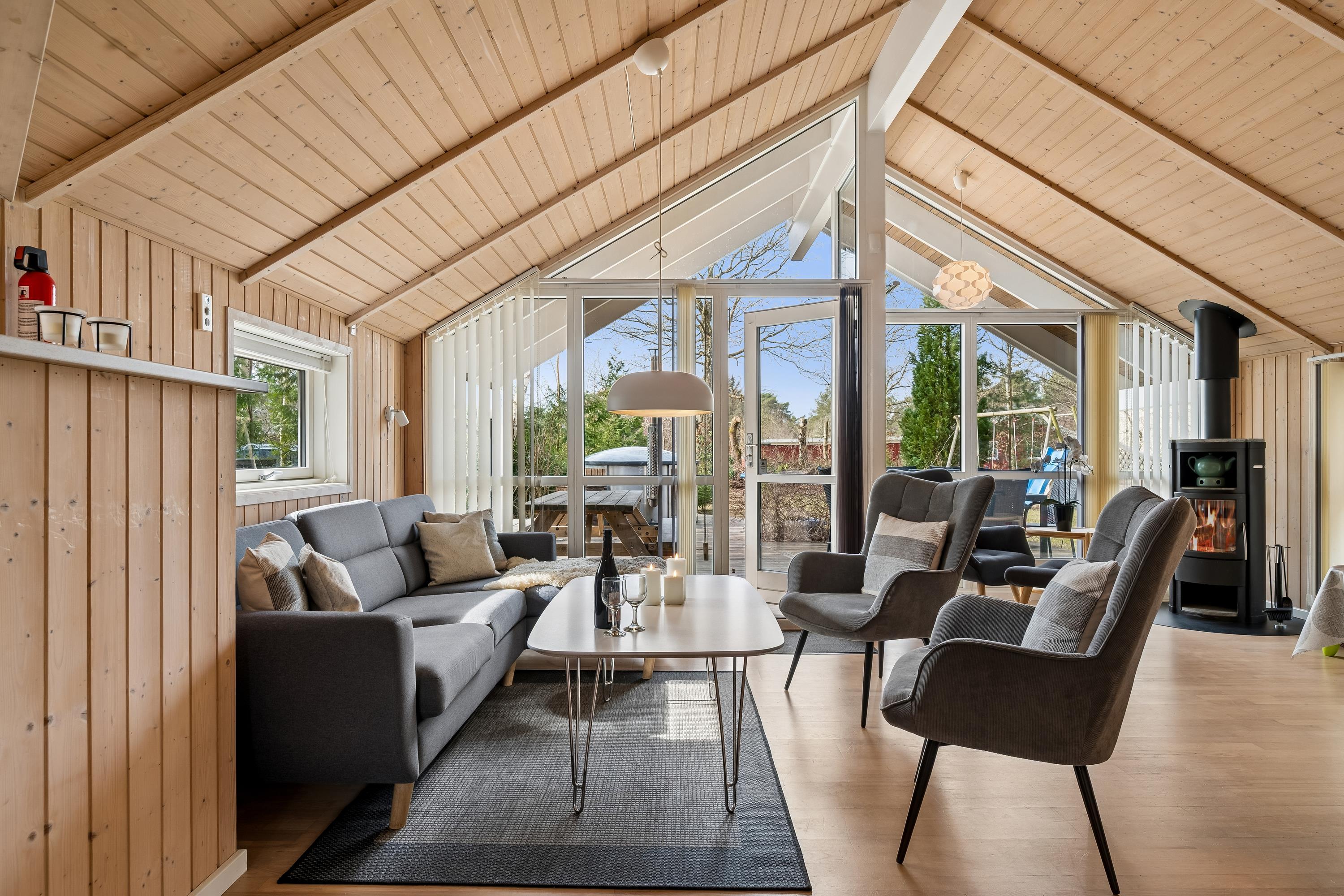 In the heart of the beautiful nature of Djursland, you will find this lovely and well-maintained holiday home. The house features an entrance/hallway with a washing machine and access to a guest toilet. A cozy, well-furnished living room with a fireplace. From here, there is access to a lovely covered terrace with garden furniture. Connected to the living room is the delightful kitchen, which includes a dishwasher. The house has sleeping arrangements spread across 3 beautiful bedrooms, all with double beds. One of the rooms also has a bunk bed. A stylish bathroom with a shower and underfloor heating. For smaller guests, there is a high chair and a crib. The house has internet access. It is situated on a lovely plot with a lawn, and here you will also find a wonderful hot tub that can be enjoyed in both summer and winter. About 600 meters from the house, there is a train station/stop for the light rail, making it easy to travel to larger cities such as Grenaa and Aarhus.