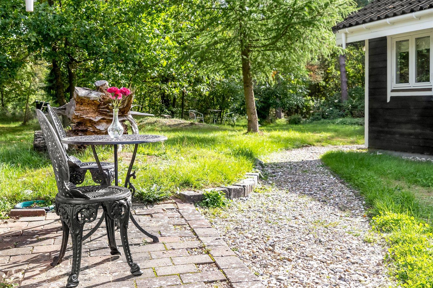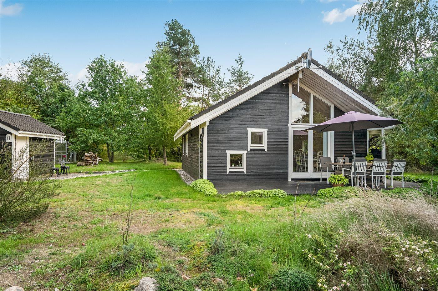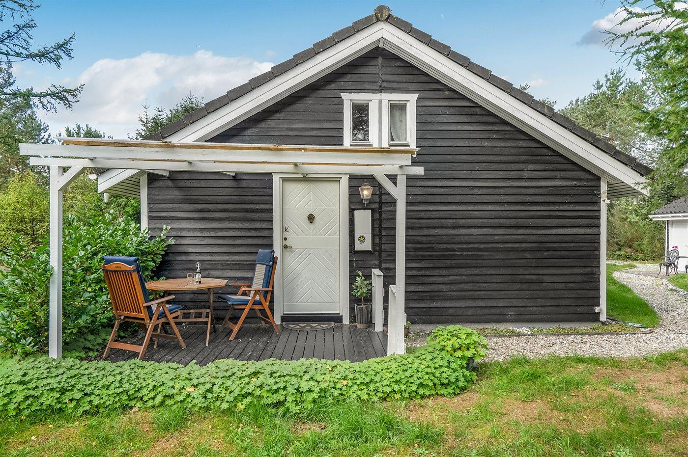Ferieboligen er beliggende på en 1200 m² stor anlagt have. Avstand til hav er 7500 m. Nærmeste butikk ligger i en avstand på 2000 m. Til ferieboligen hører 50 m² terrasseareal. Det er Redskapsrom. Sandkasse. P-plass ved huset.