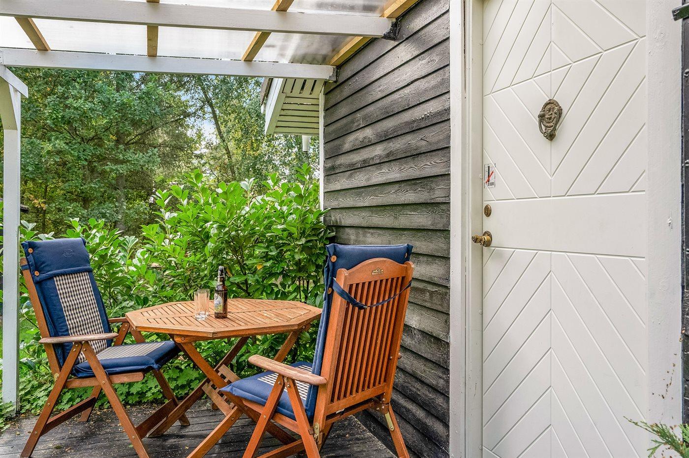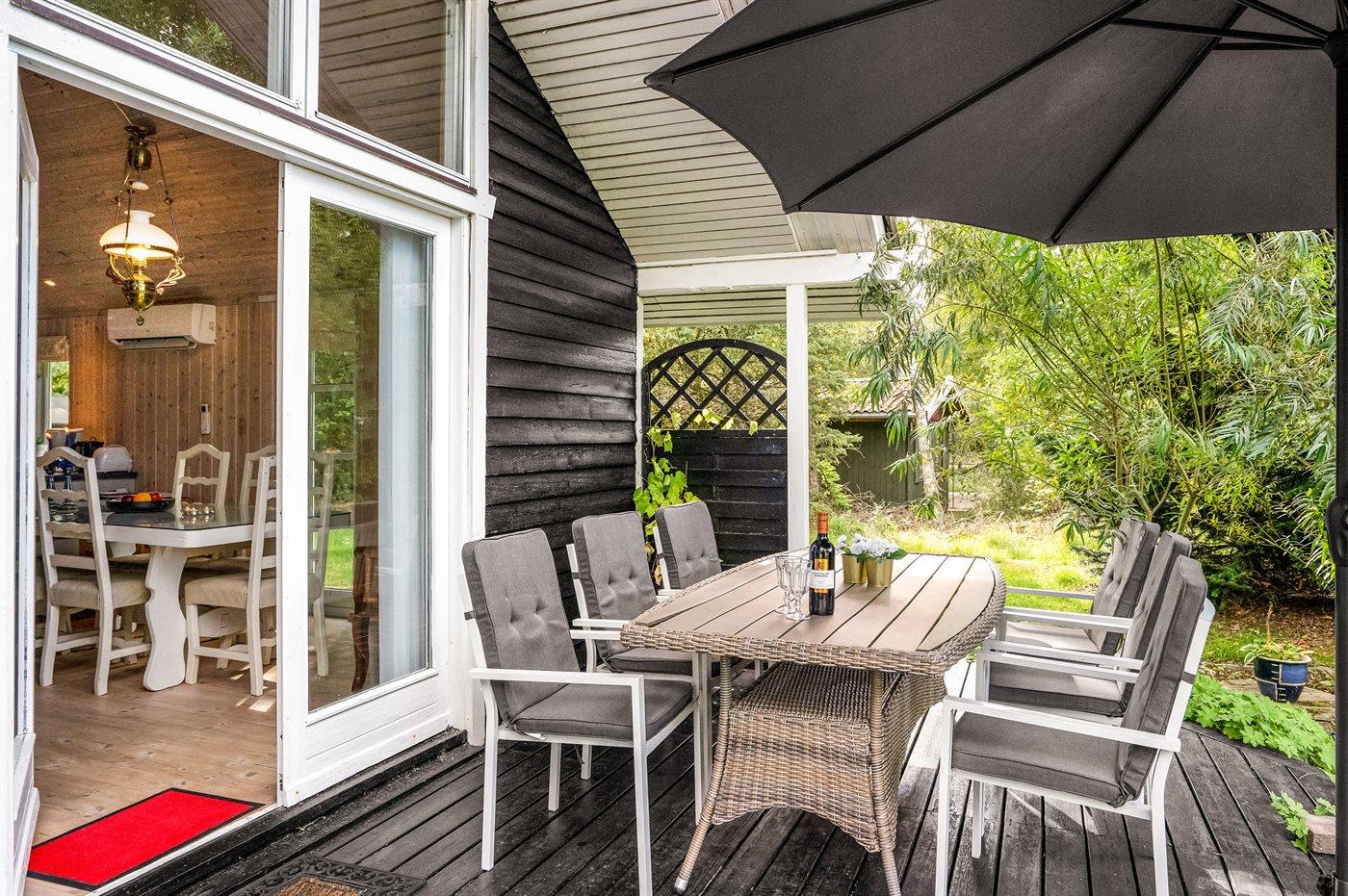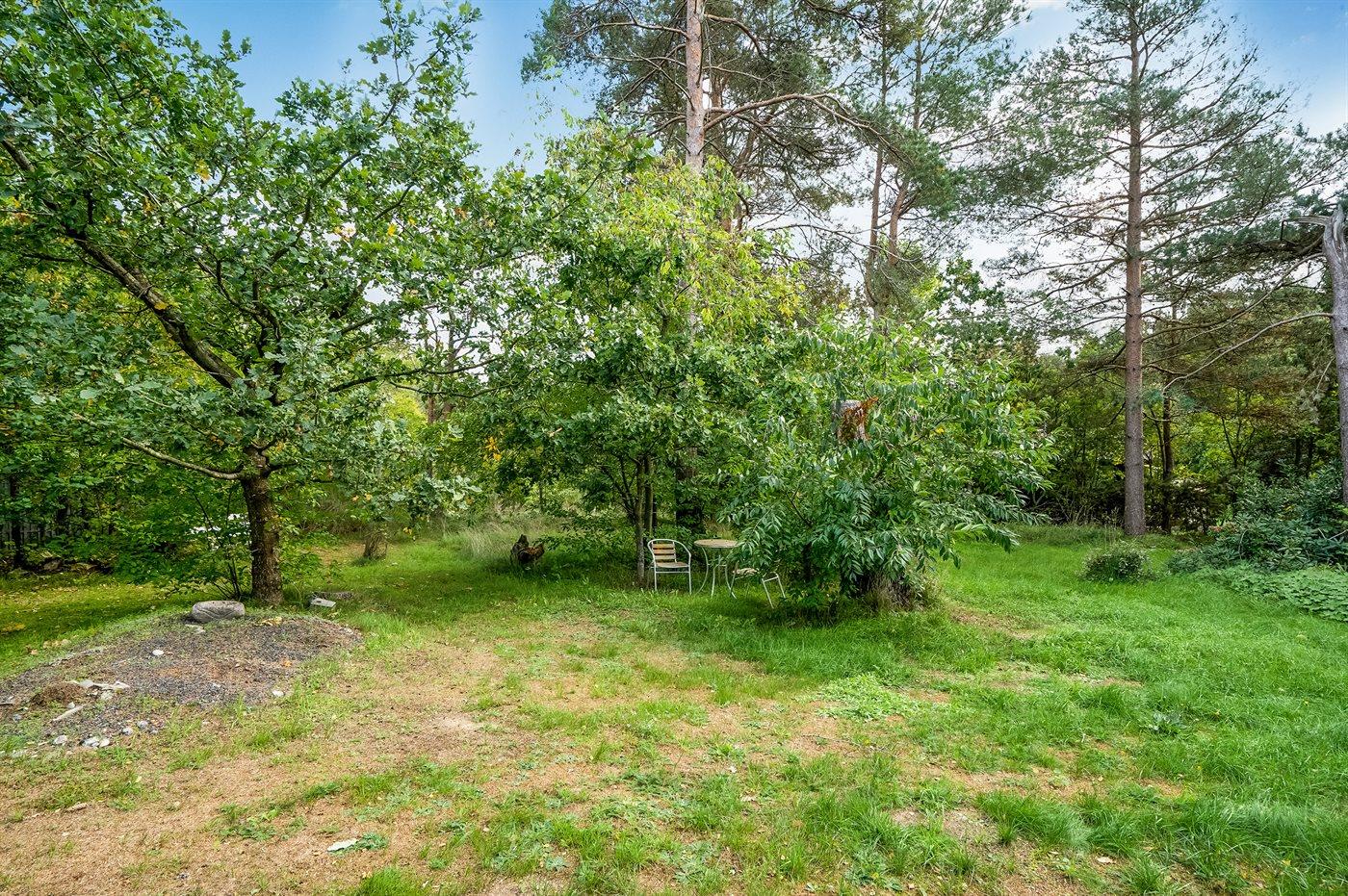 Ferieboligen er beliggende på en 1200 m² stor anlagt have. Avstand til hav er 7500 m. Nærmeste butikk ligger i en avstand på 2000 m. Til ferieboligen hører 50 m² terrasseareal. Det er Redskapsrom. Sandkasse. P-plass ved huset.