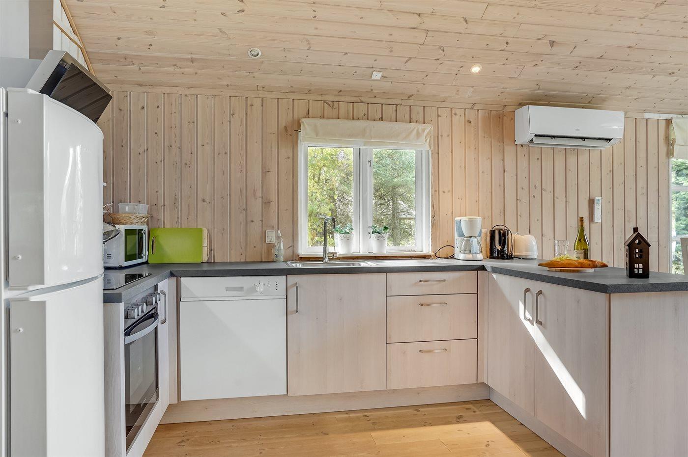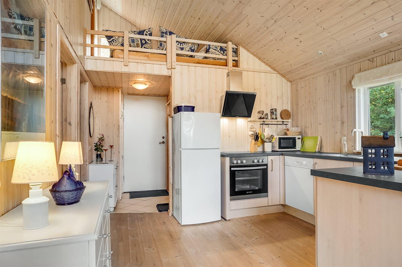 Kjøkkenet er utstyrt med 1 kjøleskap. Det er 4 keramiske kokeplater, varmluftsovn, mikrobølgeovn og oppvaskmaskin.