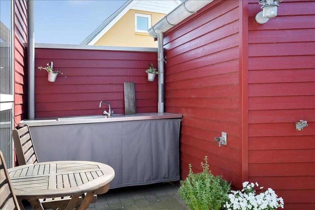 Draußen erwartet Sie ein gemütlicher Innenhof, der Ihre private Oase bildet. Hier können Sie die Sonne genießen, Schutz vor Wind finden und sich bei einer Tasse Kaffee oder einem guten Glas Wein entspannen. Der Außenbereich lädt zu echter Urlaubsgemütlichkeit unter freiem Himmel ein. Außerdem haben Sie Zugang zu einer praktischen Außenküche mit Fischputzplatz – perfekt, wenn Sie frischen Fisch aus Fjord oder Meer selbst gefangen haben. Im Geräteschuppen finden Sie zudem einen zusätzlichen Gefrierschrank, um Ihren Fang oder andere Leckereien problemlos aufzubewahren. Alles ist für Sie vorbereitet, sodass Sie einen Urlaub voller Komfort, Funktionalität und Naturerlebnisse direkt vor der Tür genießen können.