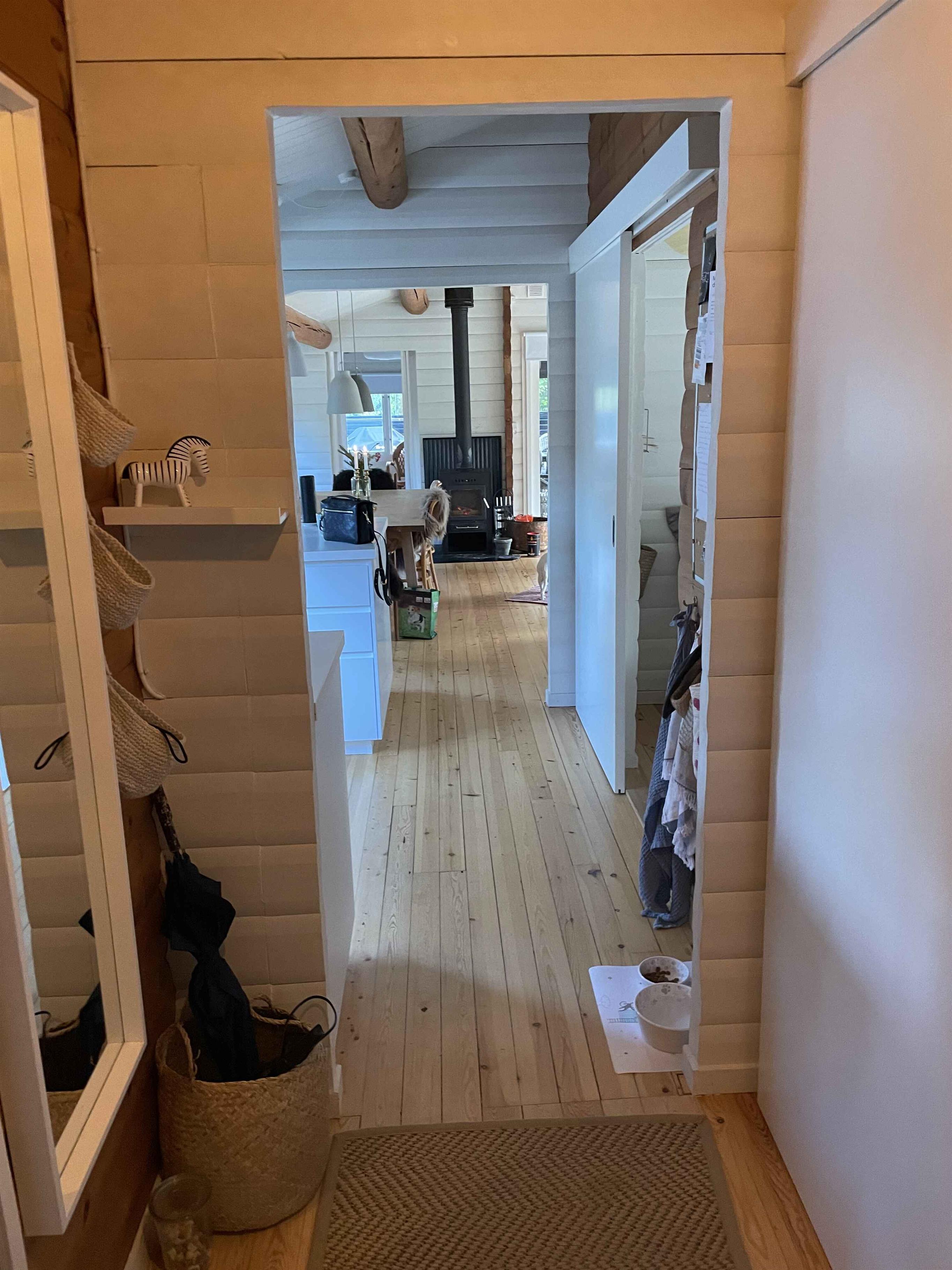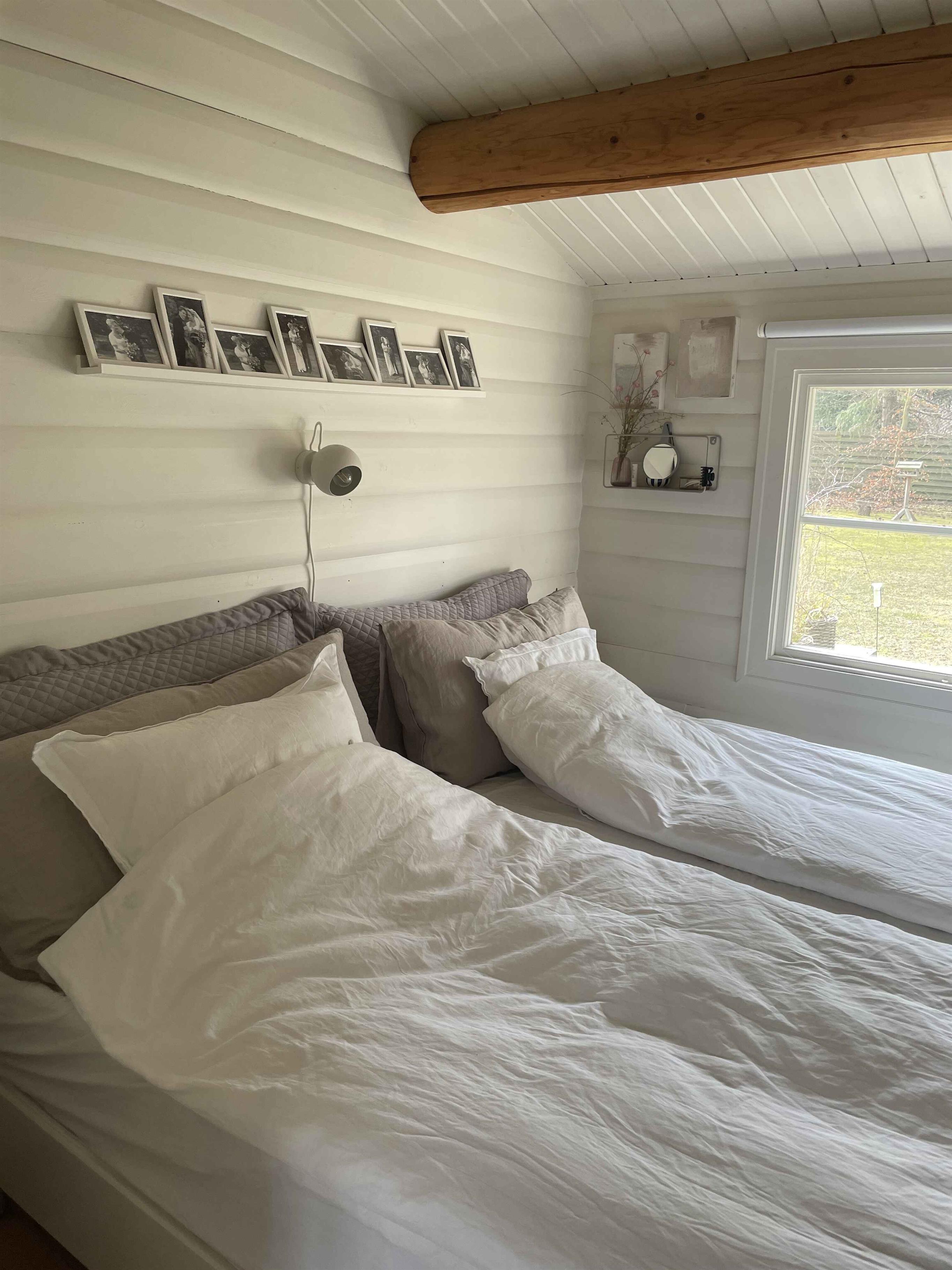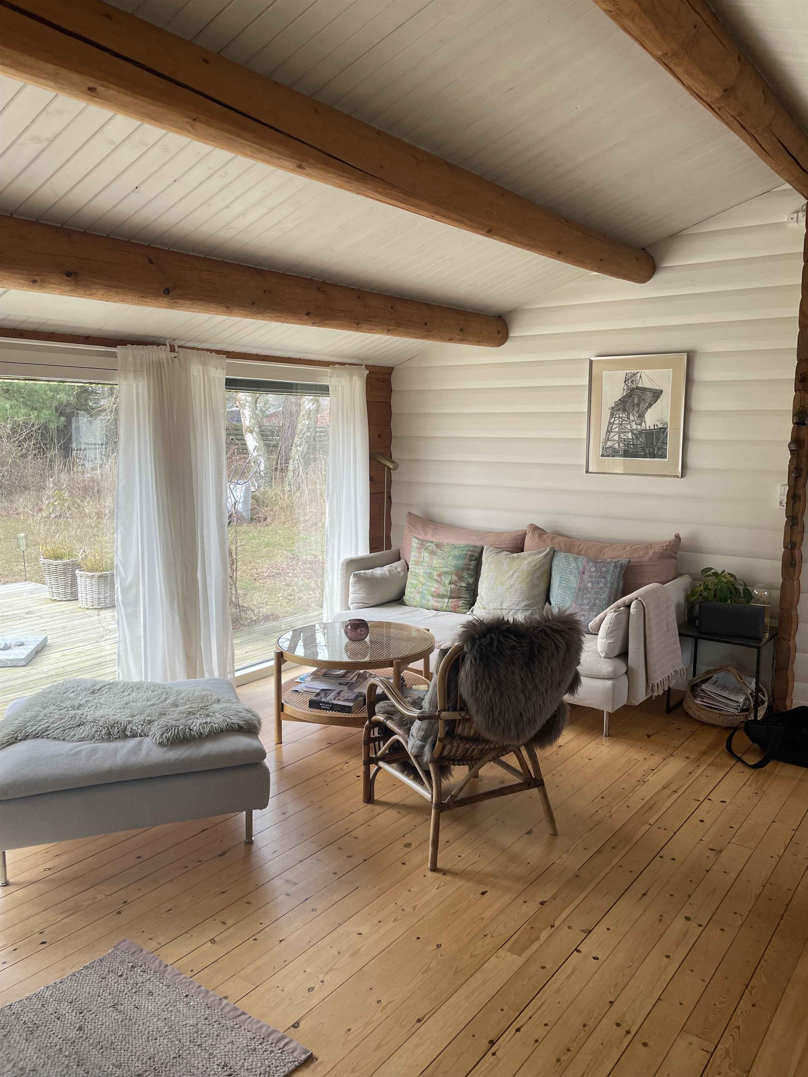 Charming, personally decorated log cabin with large terrace, outdoor kitchen and gas grill. Spacious garden for play, cozy wood stove. 700 m to a beautiful beach, close to golf, town and Bøtø Nature Reserve.